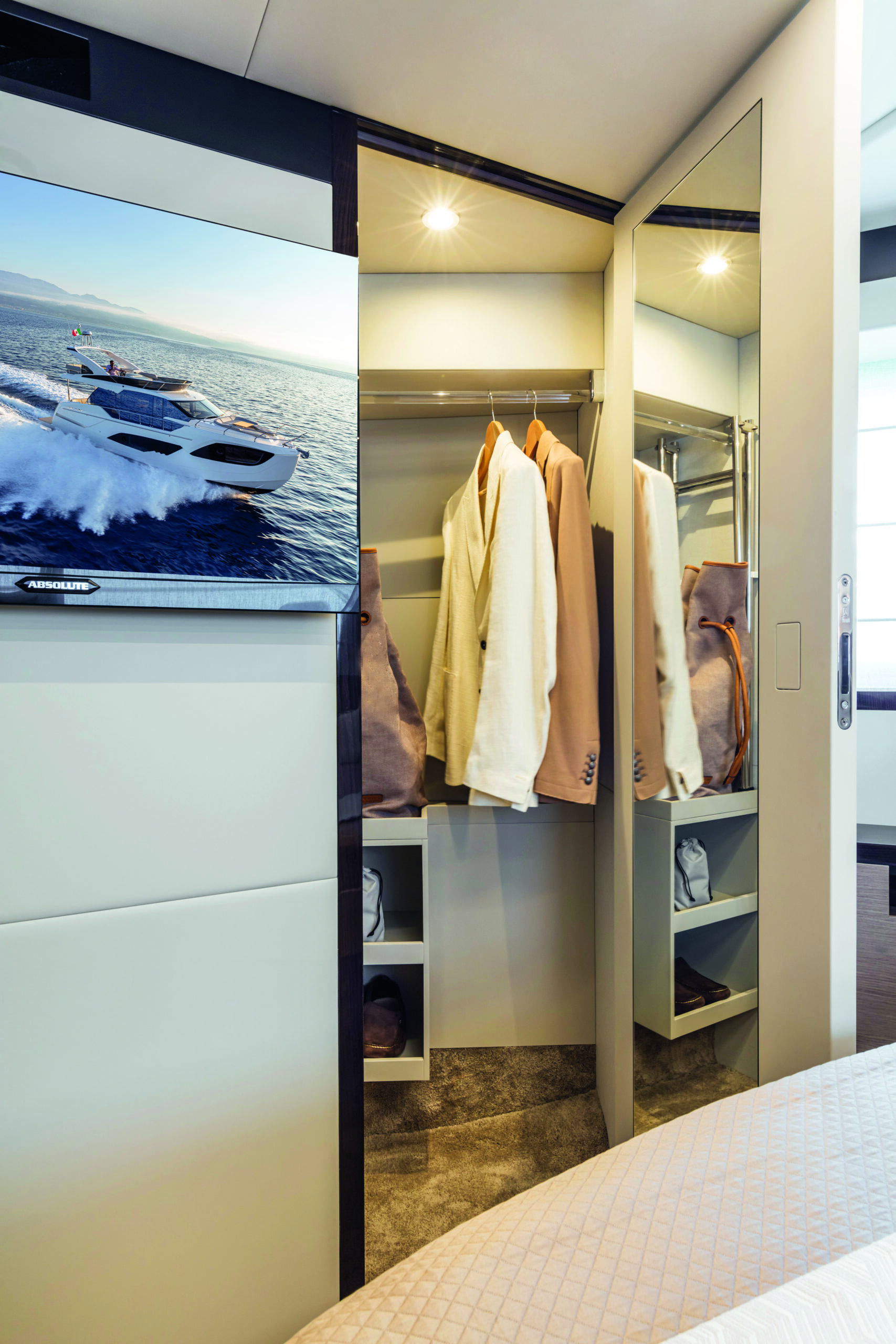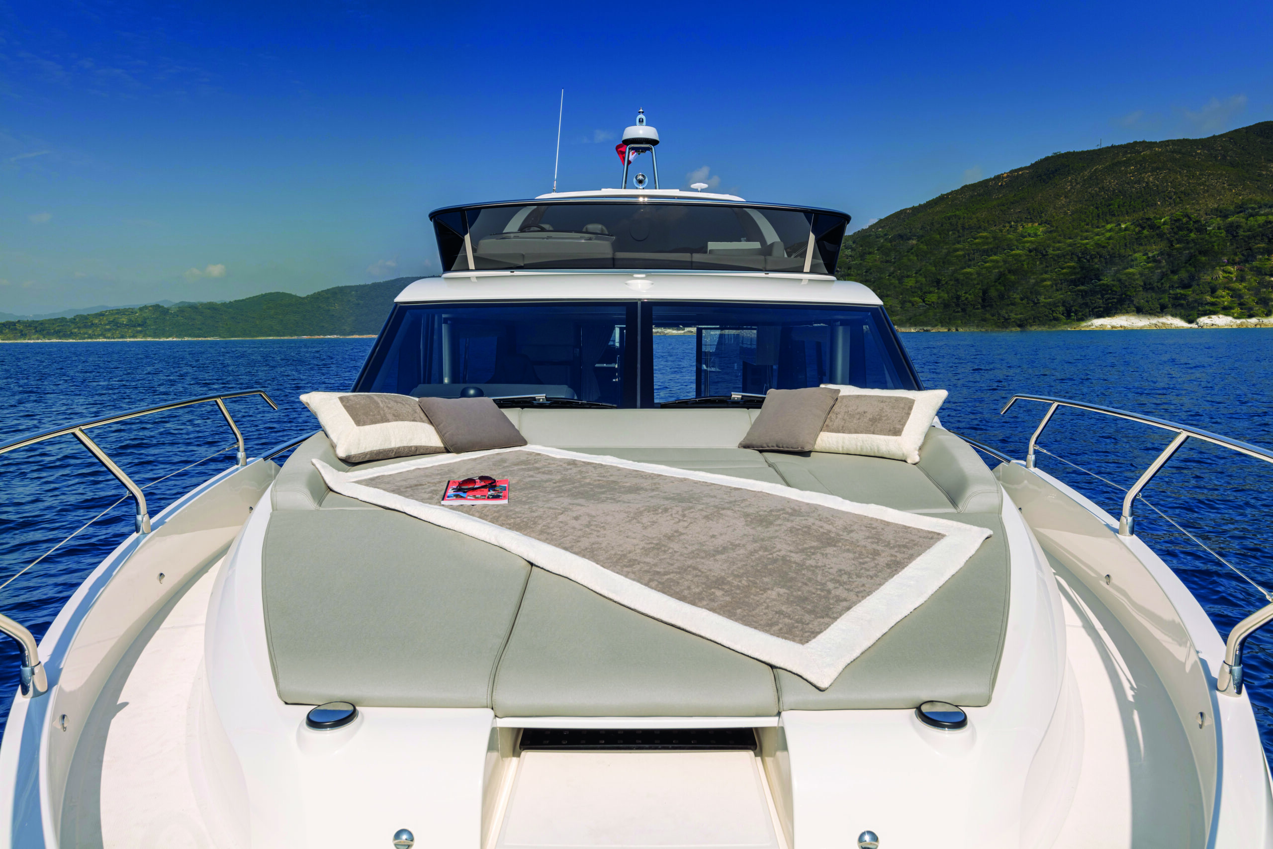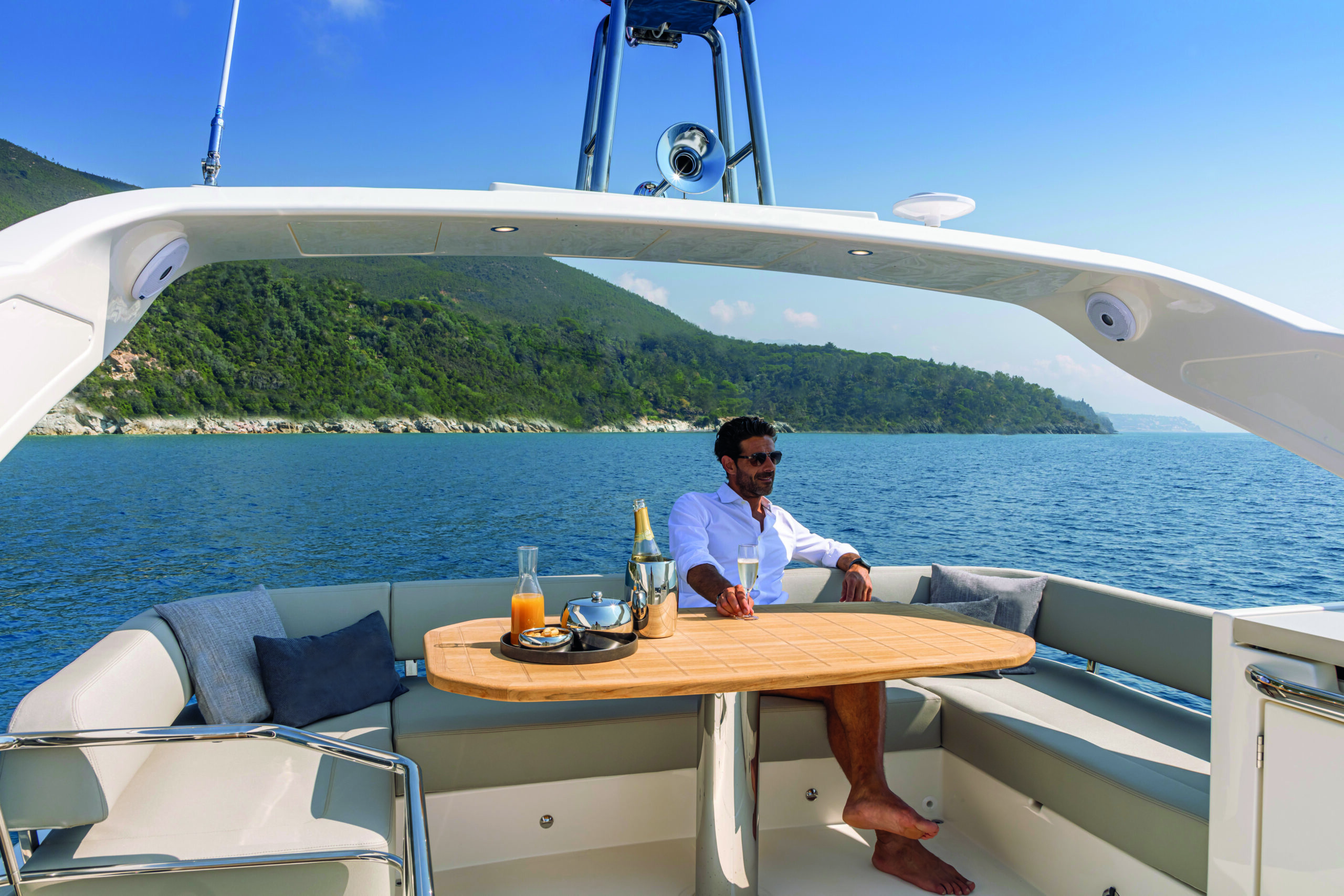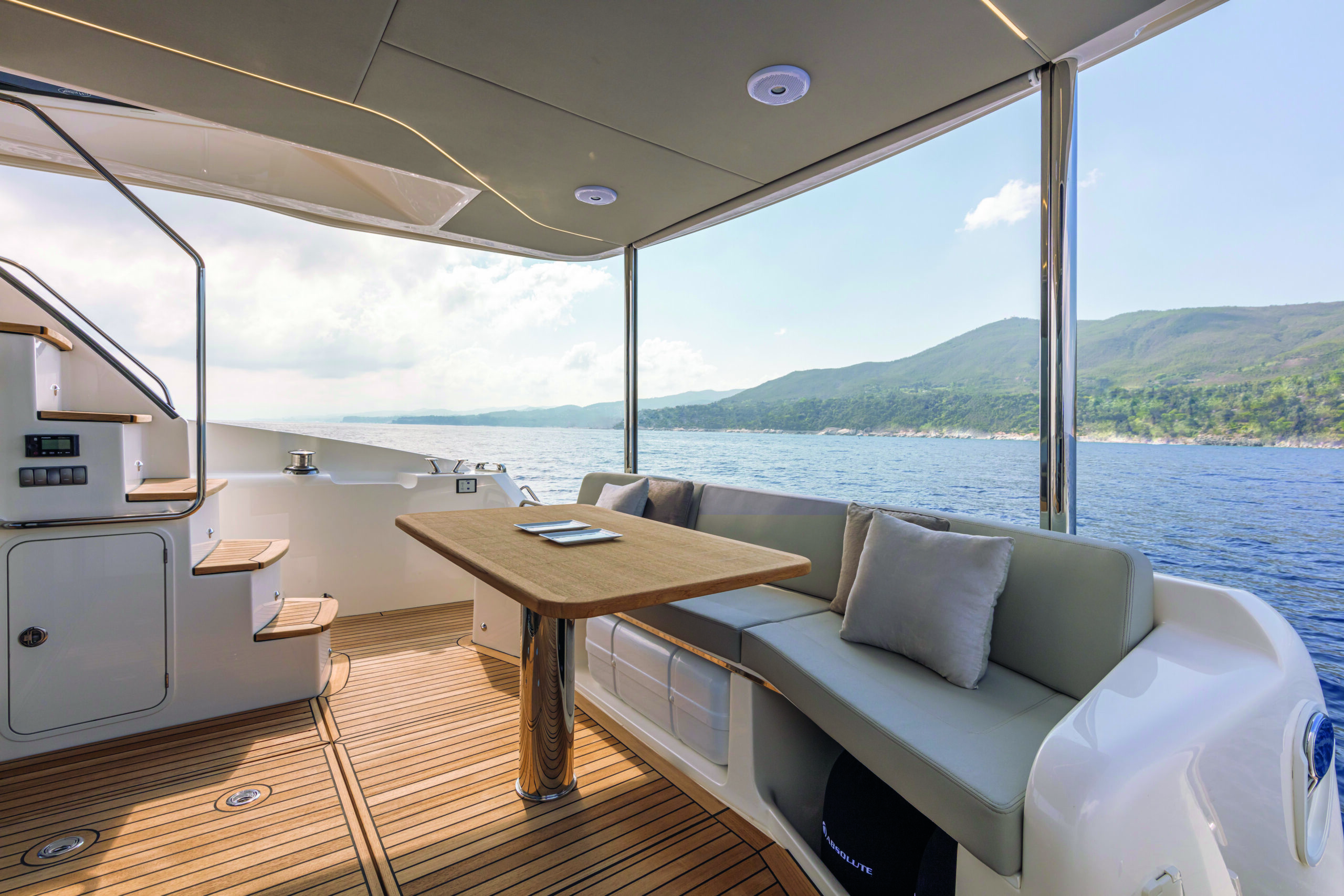 The Absolute 47 Flybridge boasts a sophisticated design with sleek lines and modern aesthetics. The yacht’s exterior is both striking and functional, featuring expansive windows that provide breathtaking views and allow natural light to flood the interior spaces. The flybridge itself is a highlight, offering a spacious area for relaxation and entertainment. It includes a comfortable seating arrangement, a large sunbathing area, and a well-equipped wet bar, making it the perfect spot for socializing with family and friends while enjoying panoramic sea views.