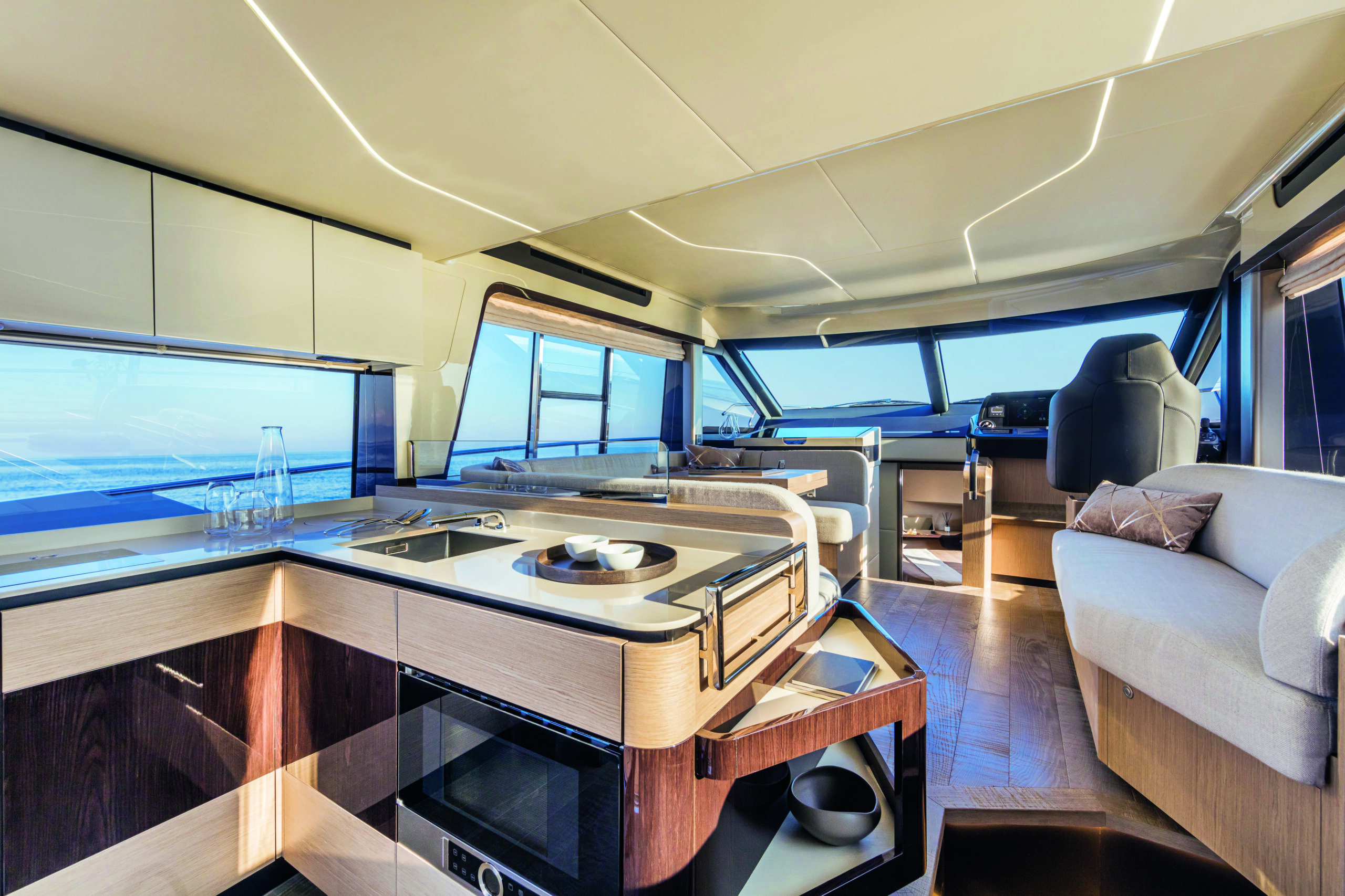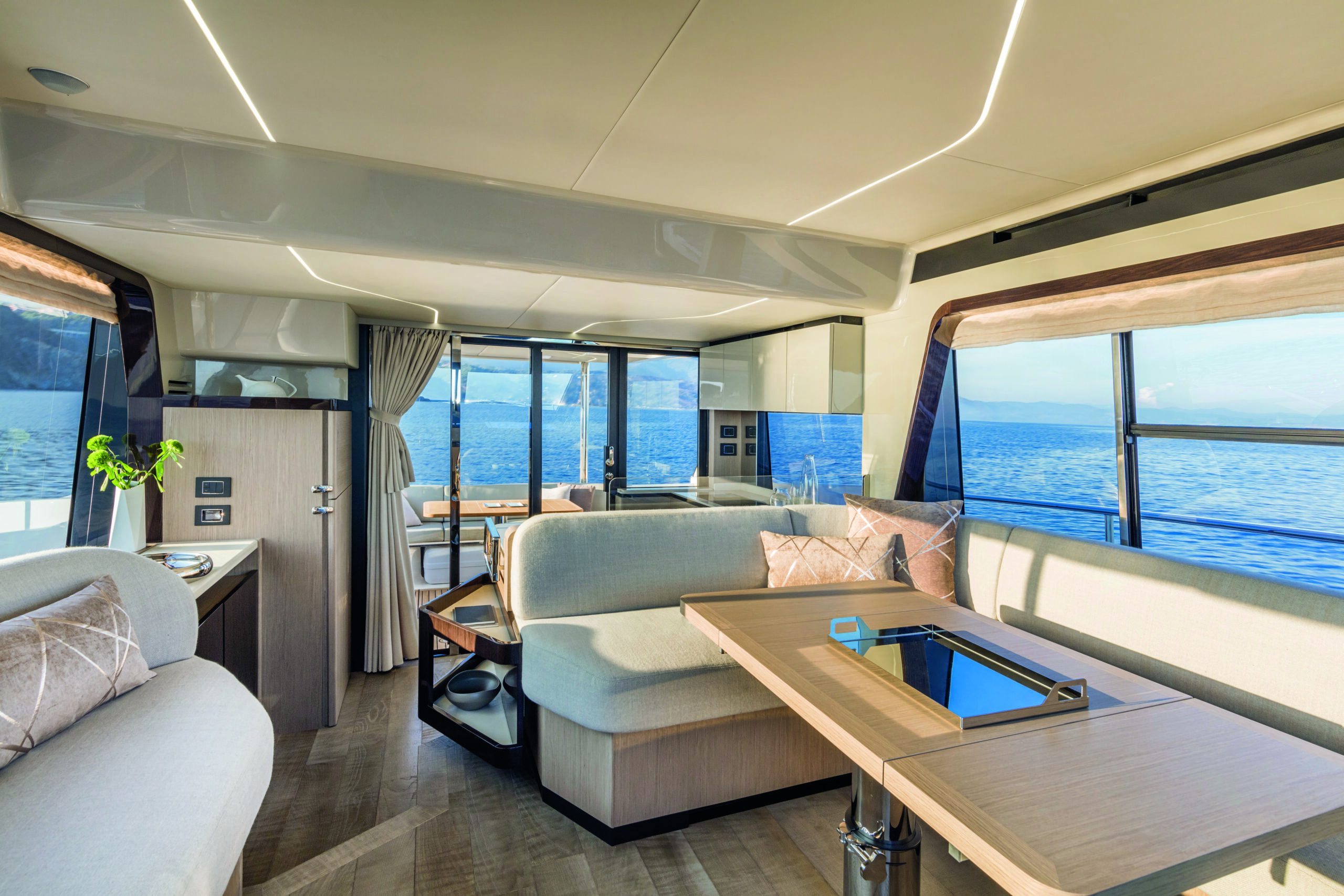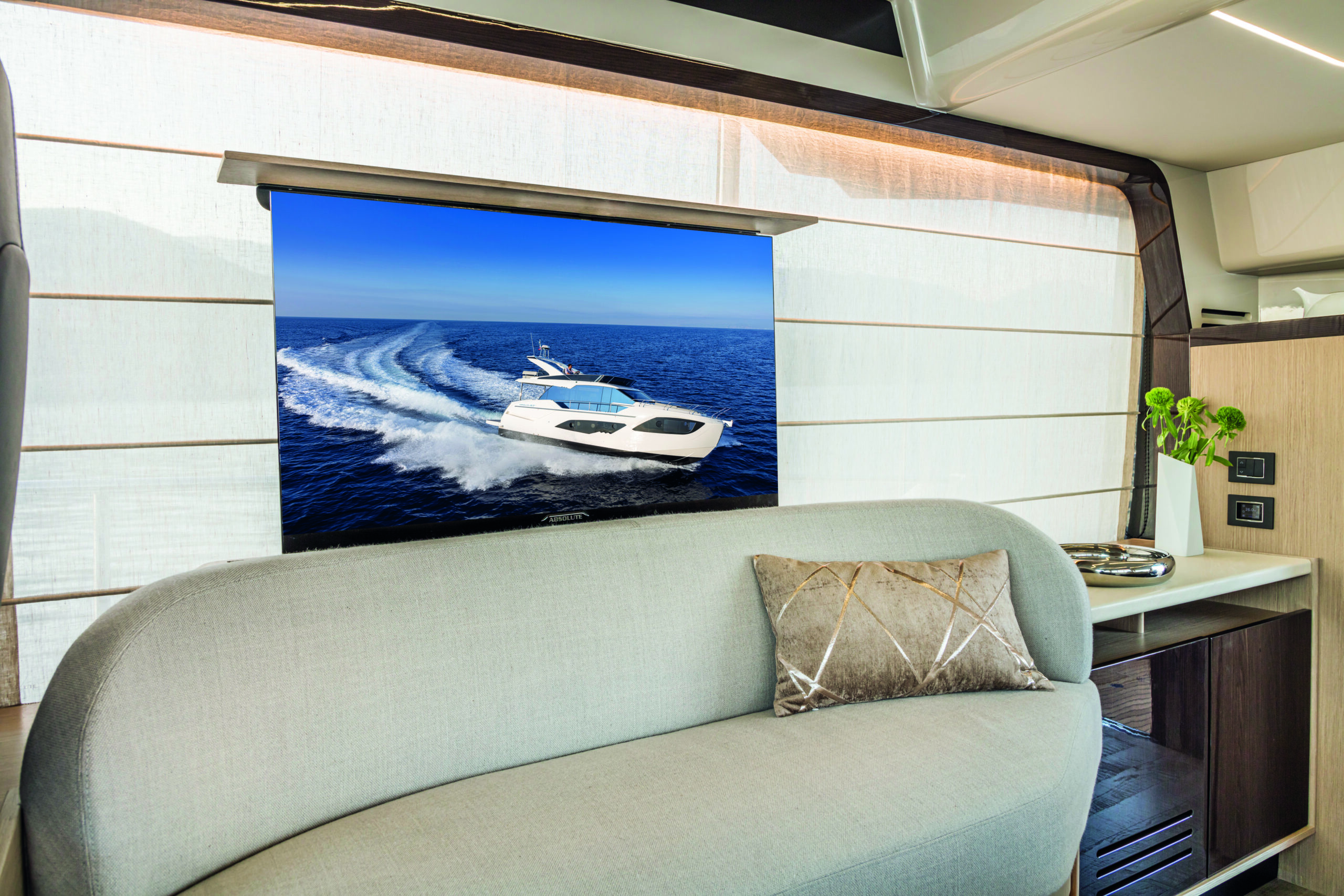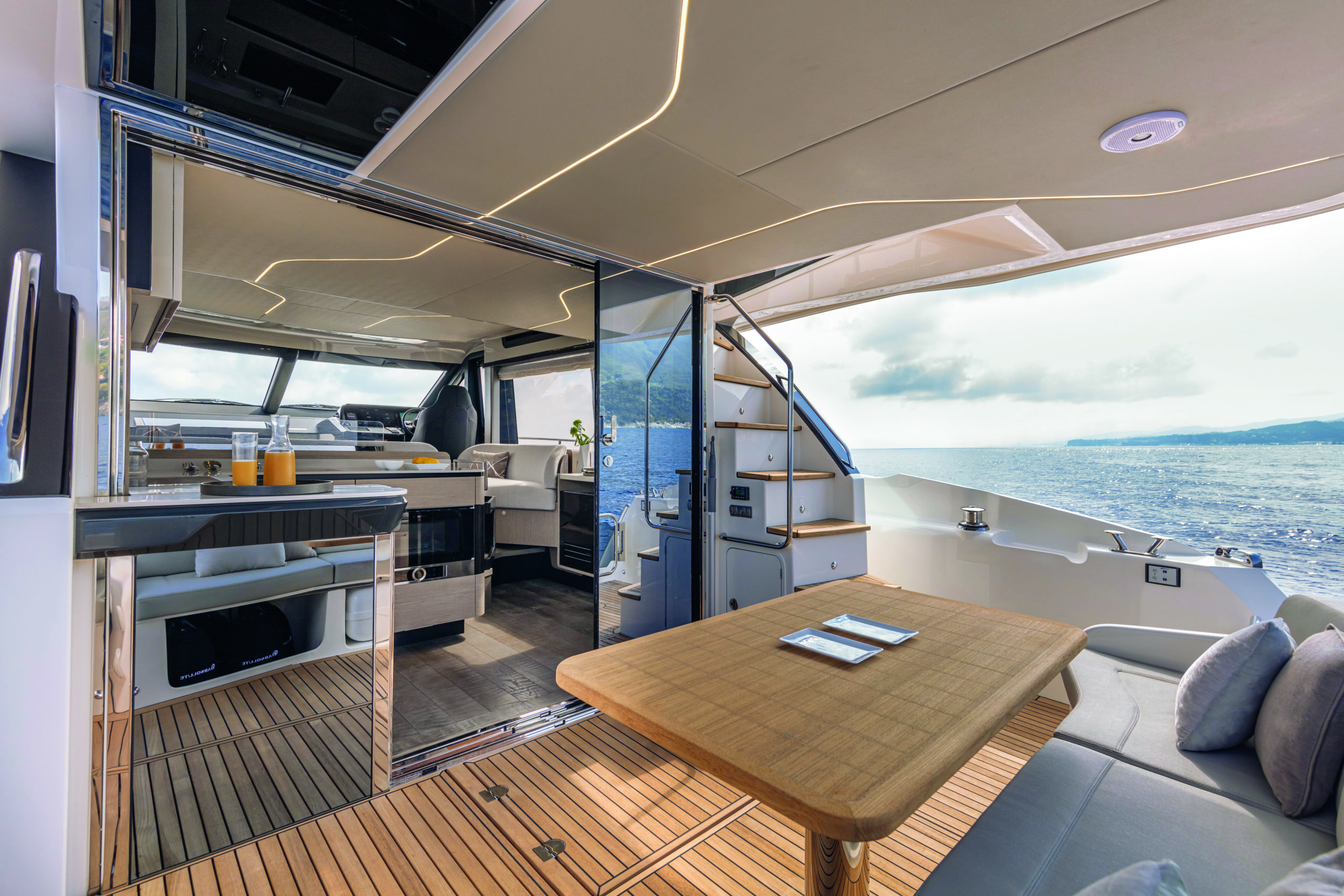 Step inside the Absolute 47 Flybridge, and you’ll be greeted by a meticulously crafted interior that exudes elegance and comfort. The main deck features an open-plan layout, seamlessly connecting the saloon, dining area, and helm station. High-quality materials, fine finishes, and contemporary decor create an inviting and sophisticated atmosphere. The salon is designed for relaxation, with plush seating and large windows that offer unobstructed views of the surroundings.