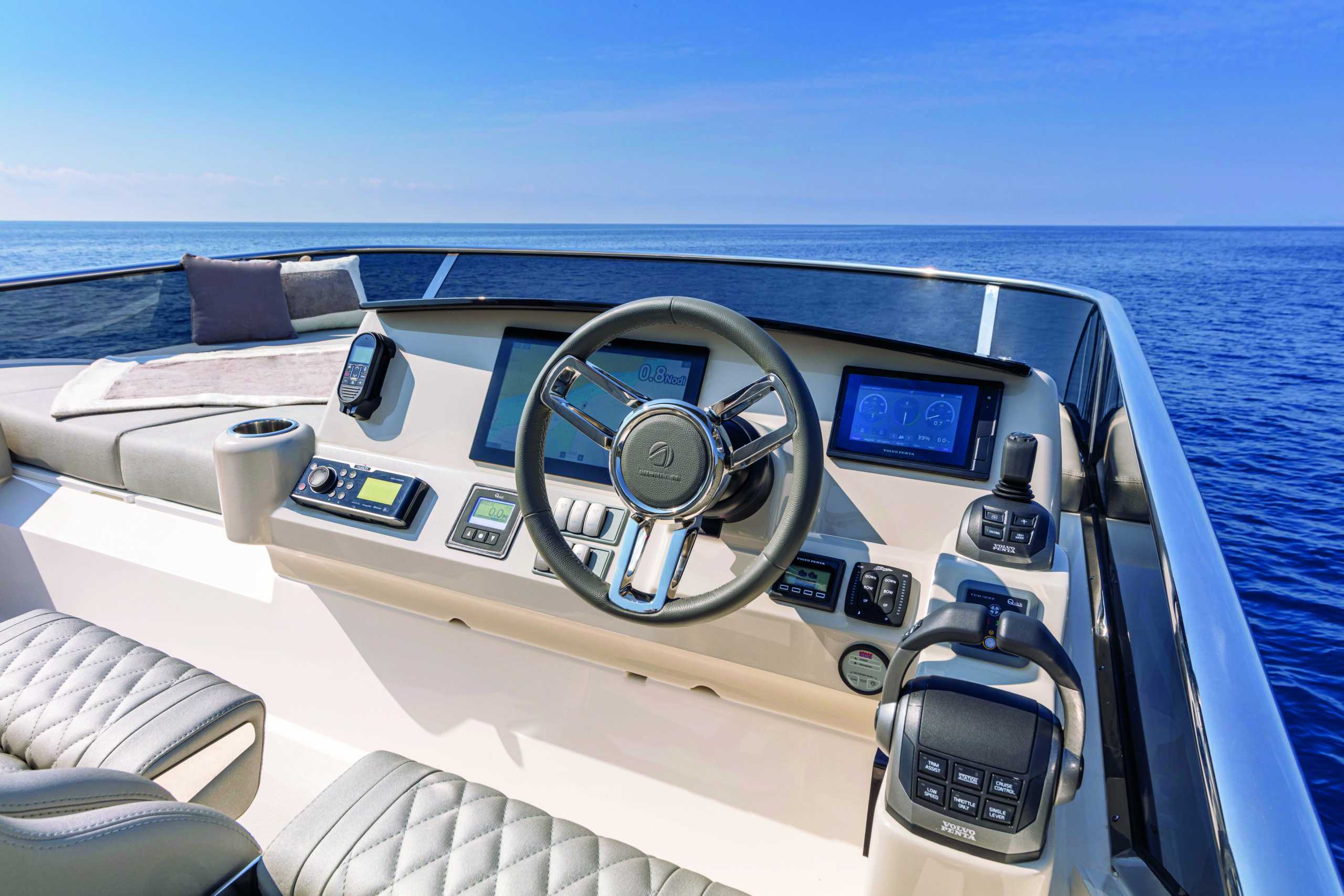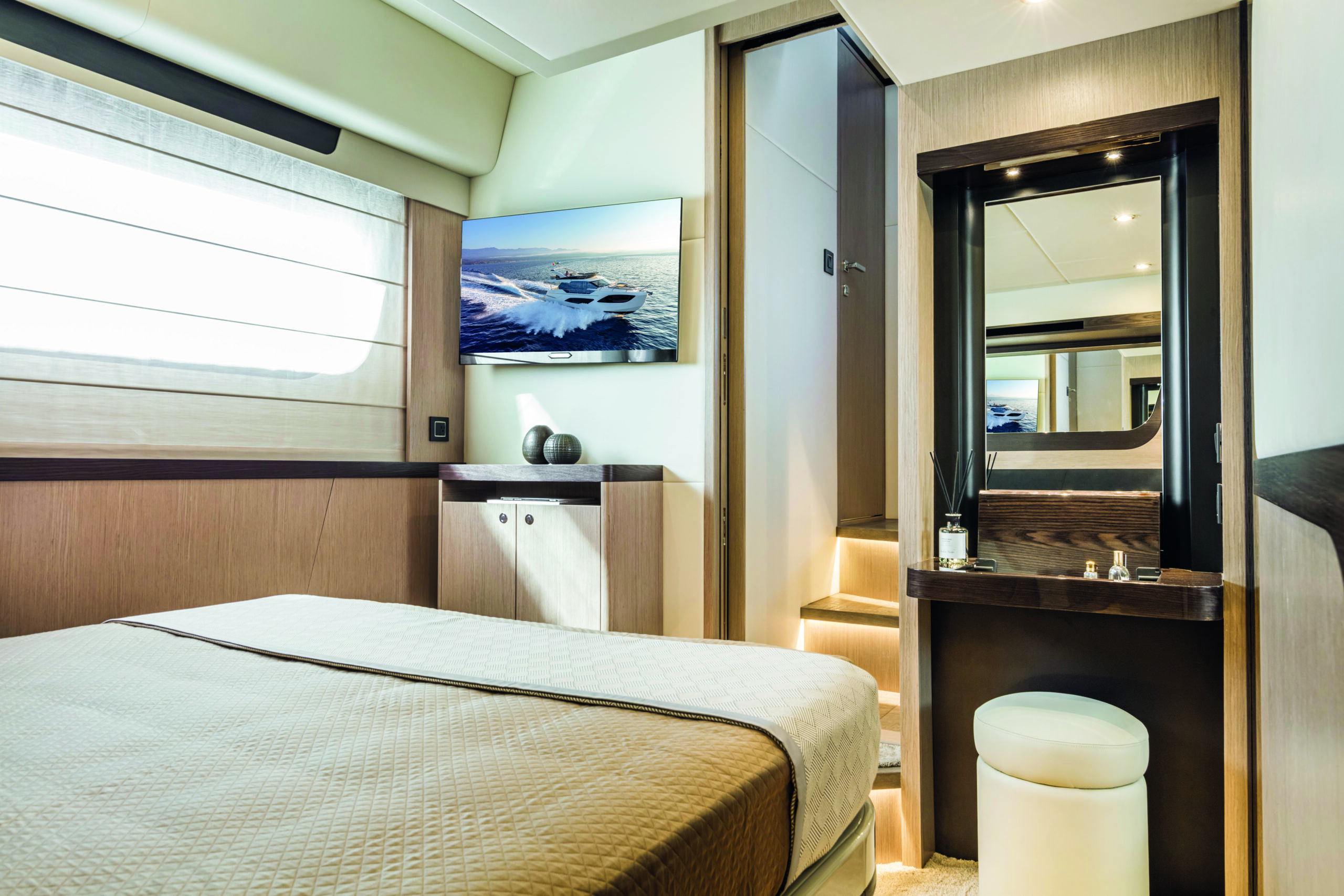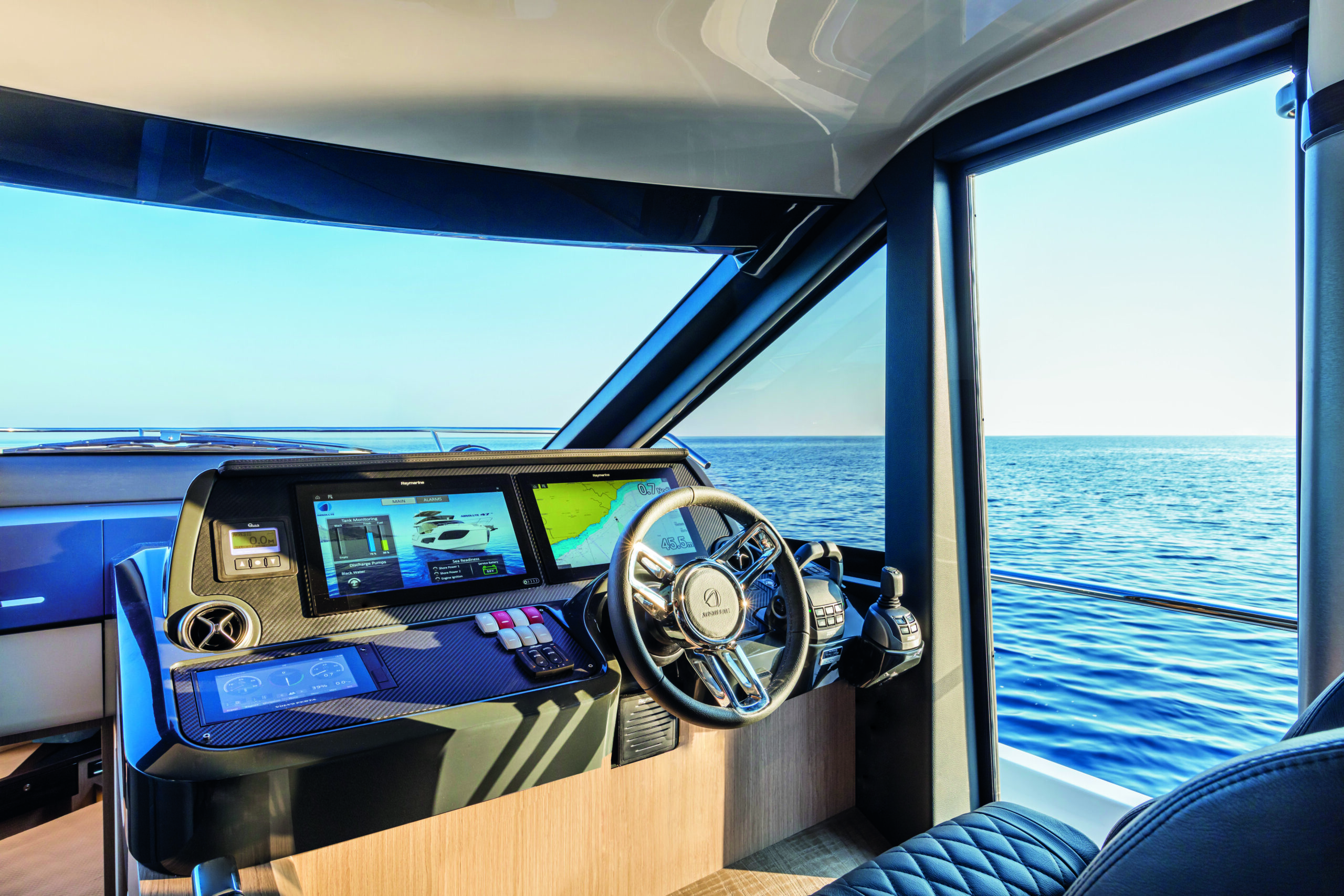 Step inside the Absolute 47 Flybridge, and you’ll be greeted by a meticulously crafted interior that exudes elegance and comfort. The main deck features an open-plan layout, seamlessly connecting the saloon, dining area, and helm station. High-quality materials, fine finishes, and contemporary decor create an inviting and sophisticated atmosphere. The salon is designed for relaxation, with plush seating and large windows that offer unobstructed views of the surroundings.