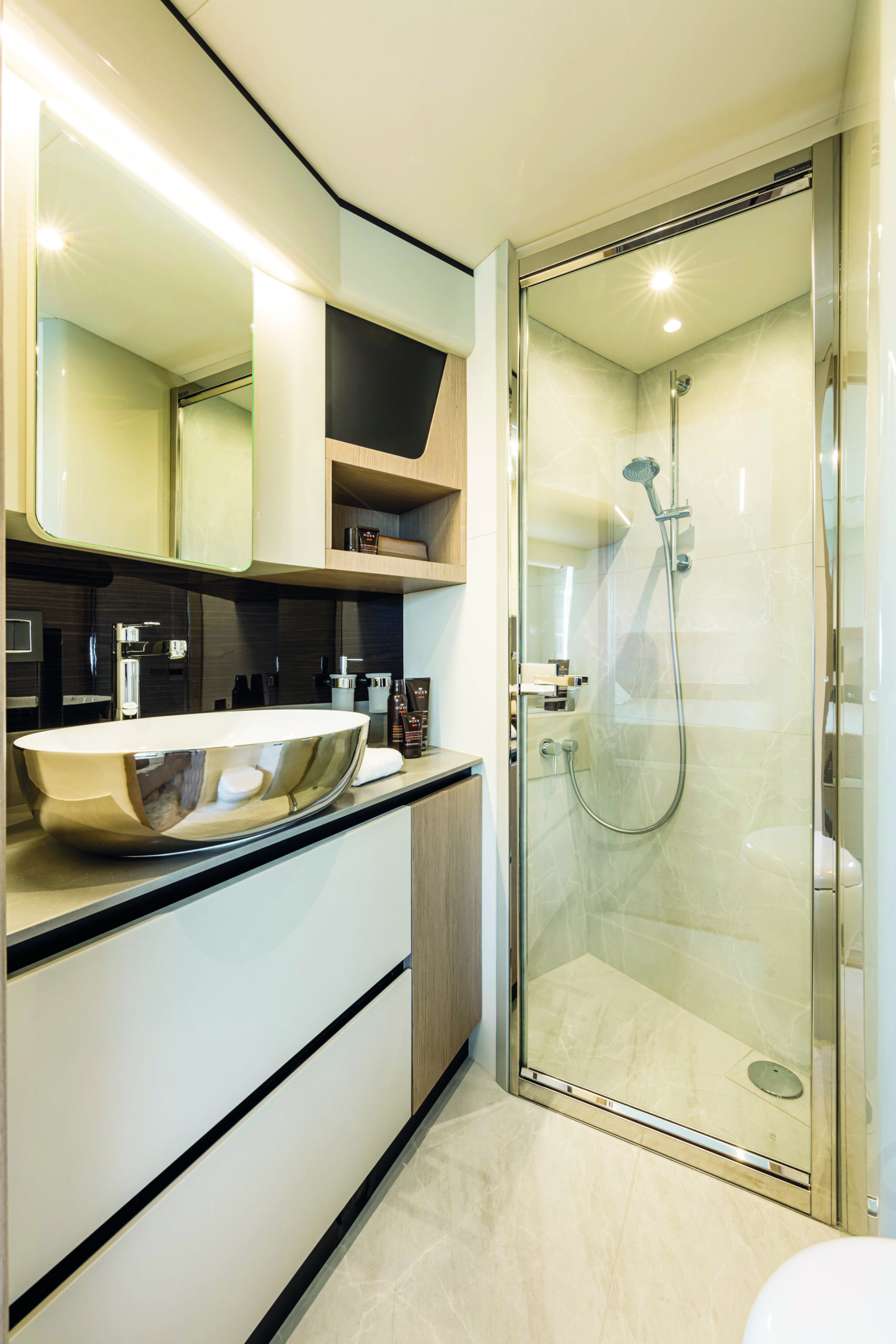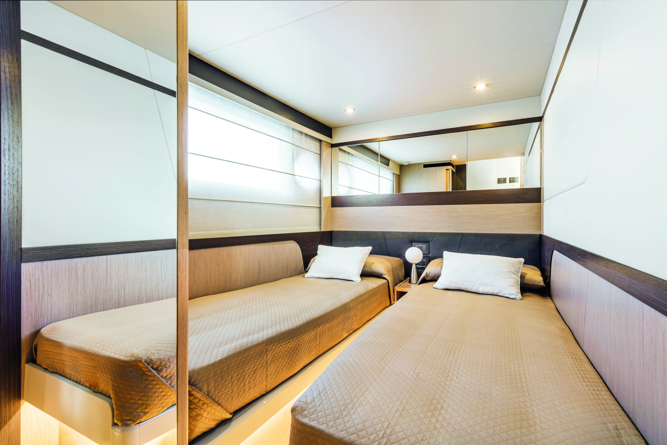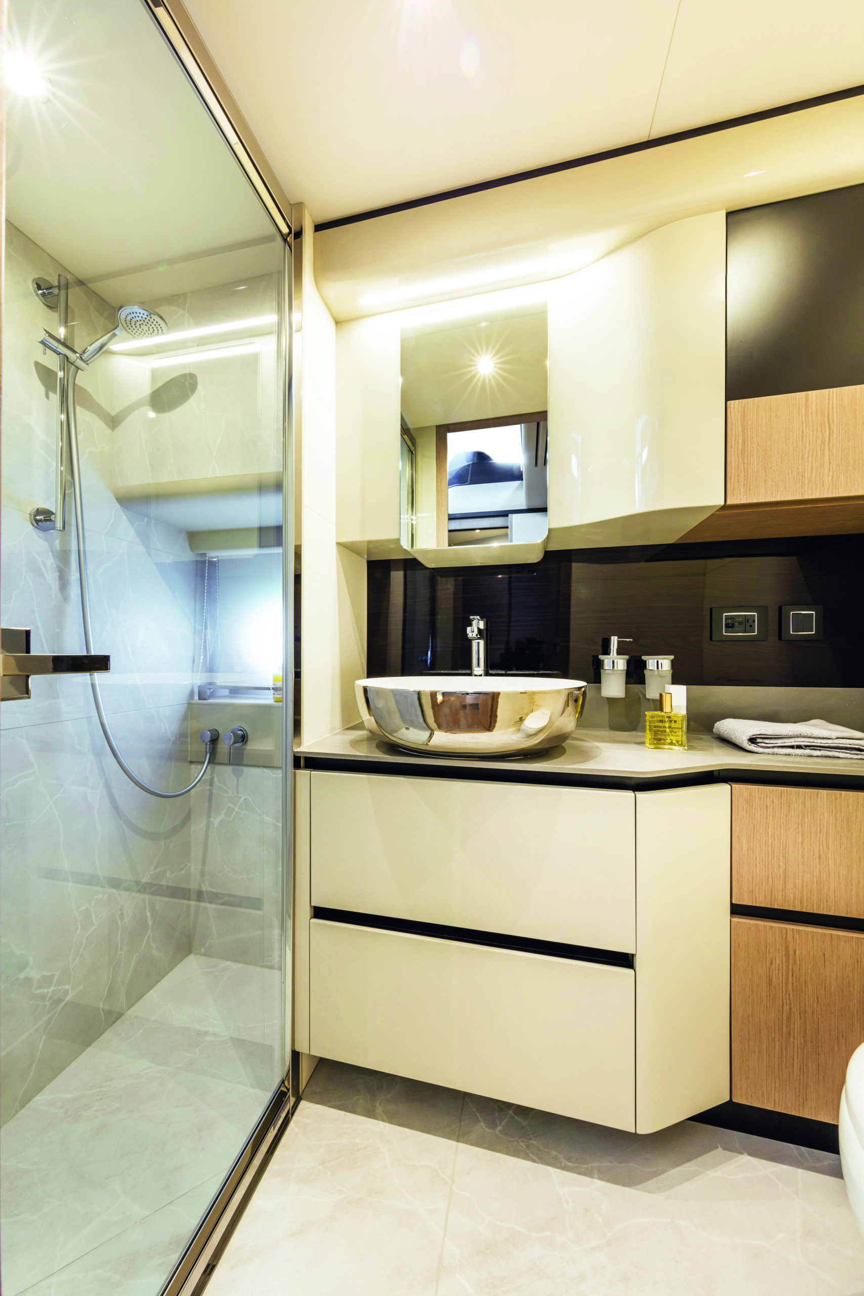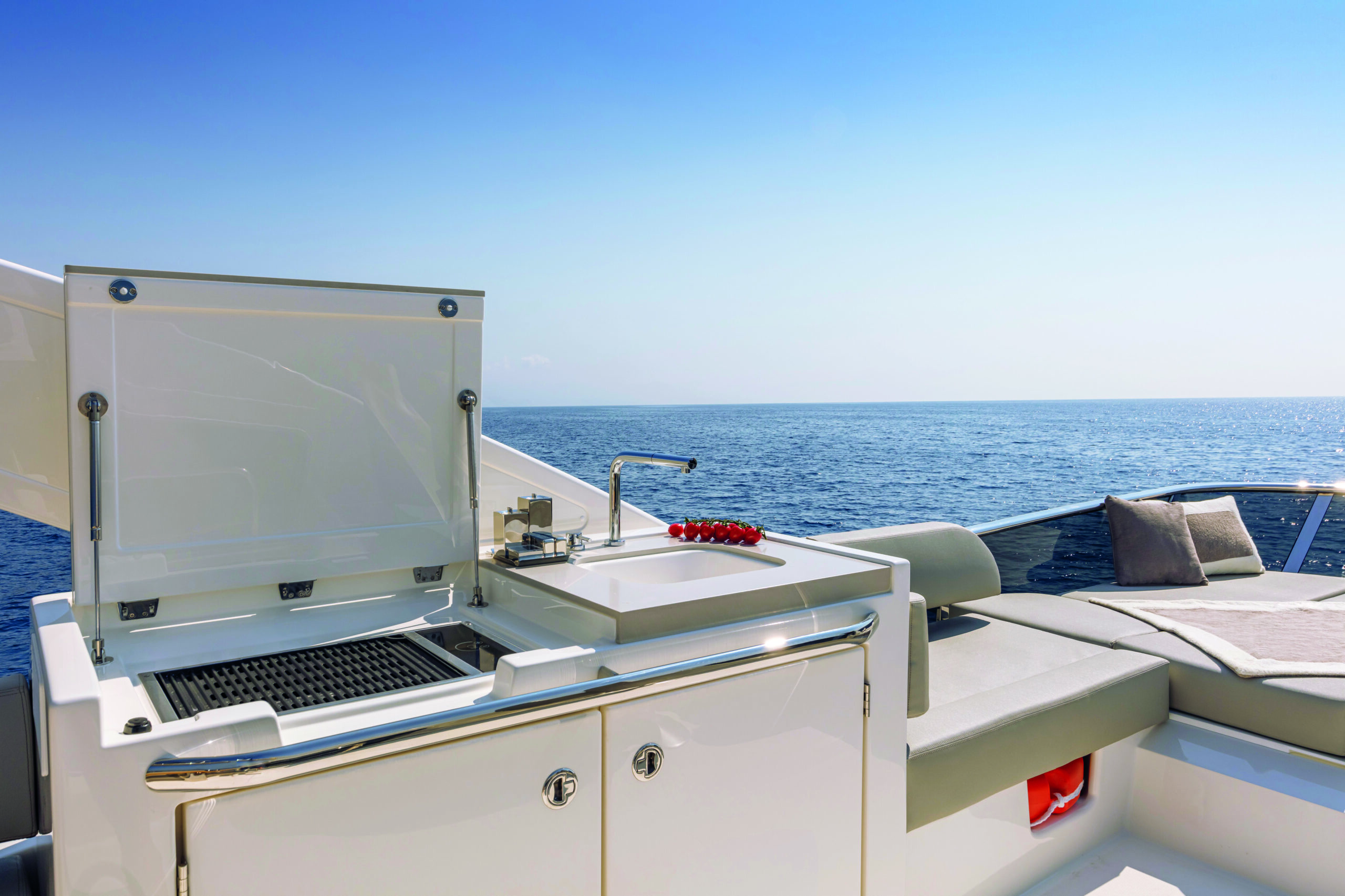 The galley is fully equipped with modern appliances and ample storage, ensuring you have everything you need for culinary adventures at sea. The yacht’s lower deck houses three beautifully appointed cabins, including a luxurious master suite, a VIP cabin, and a twin guest cabin. Each cabin offers generous space, premium furnishings, and en-suite bathrooms, providing the utmost comfort and privacy for all guests.