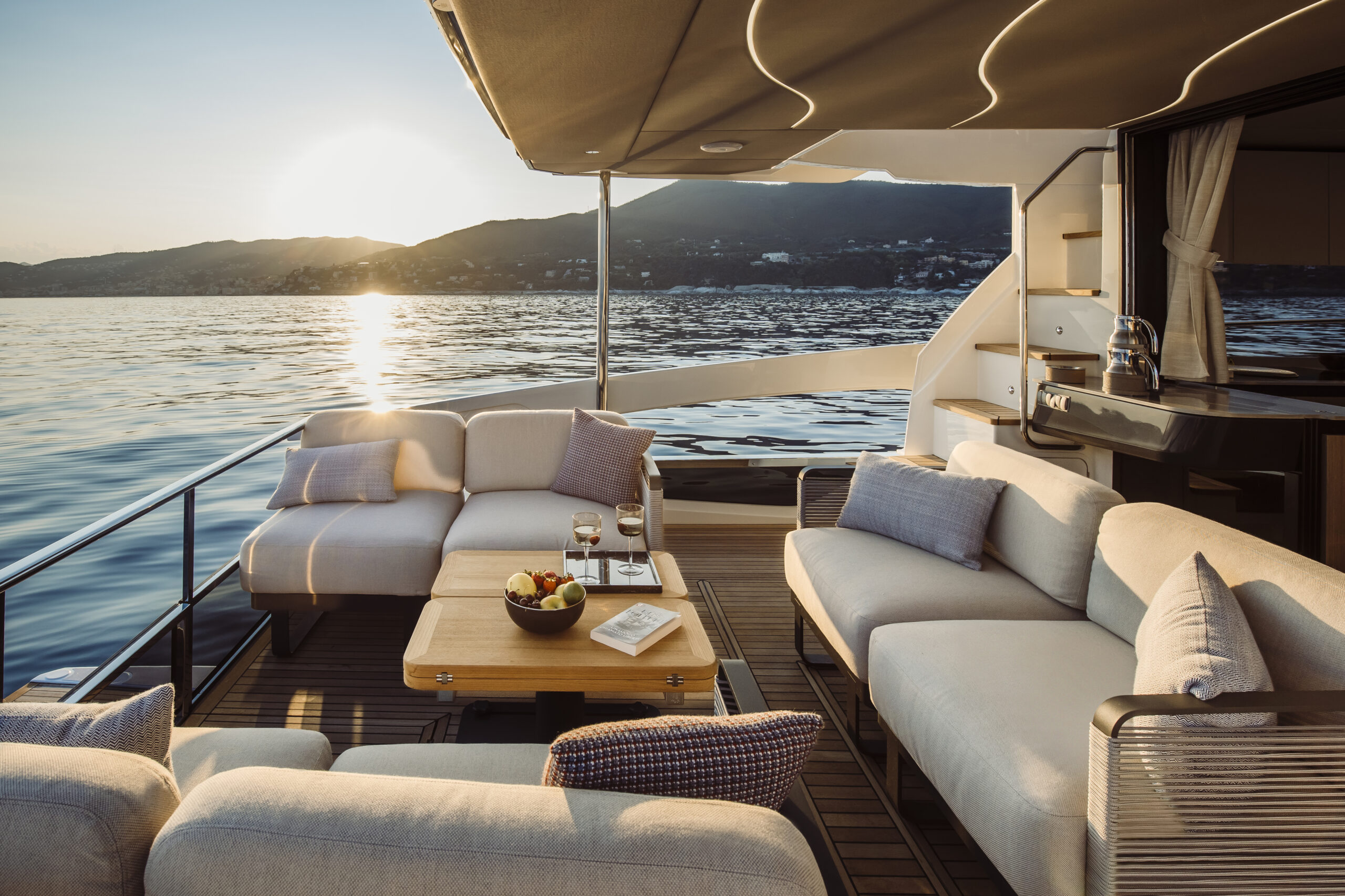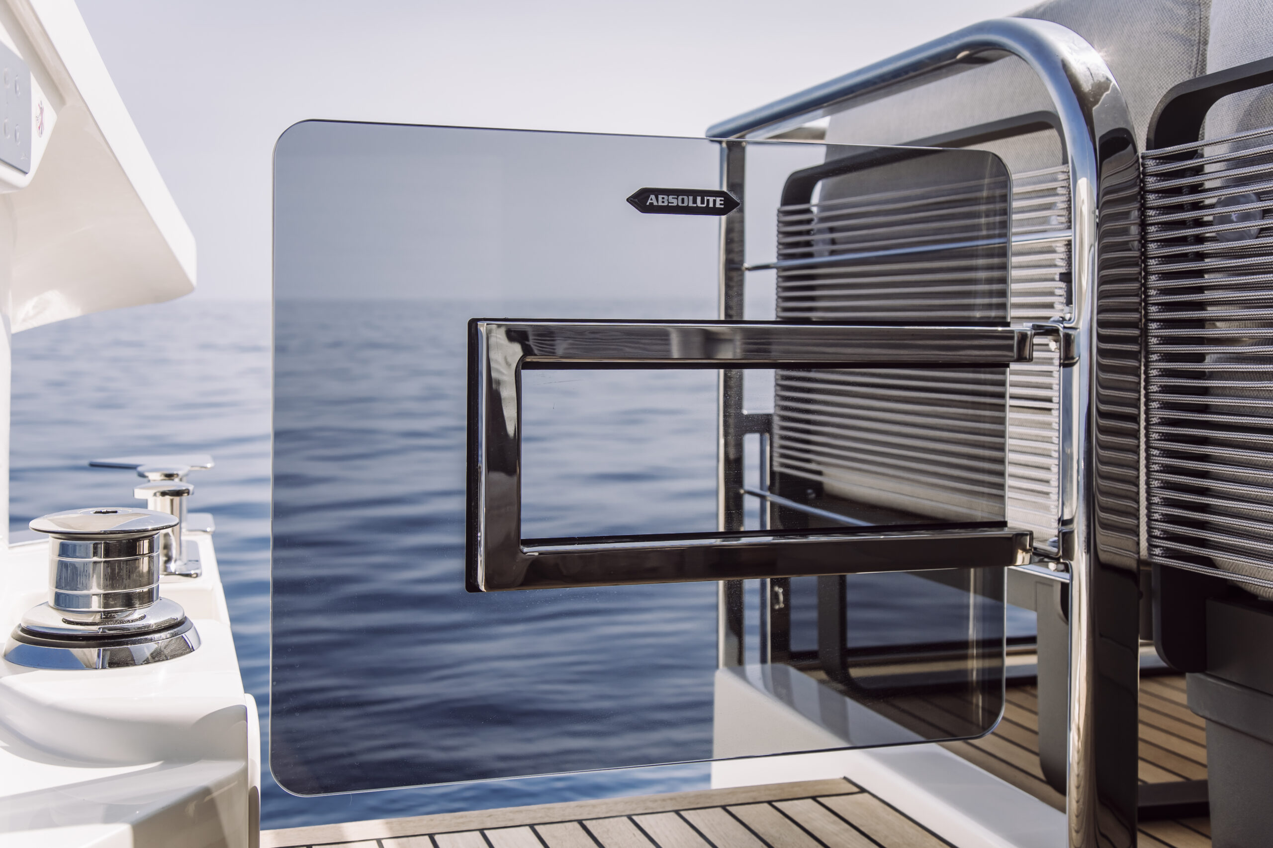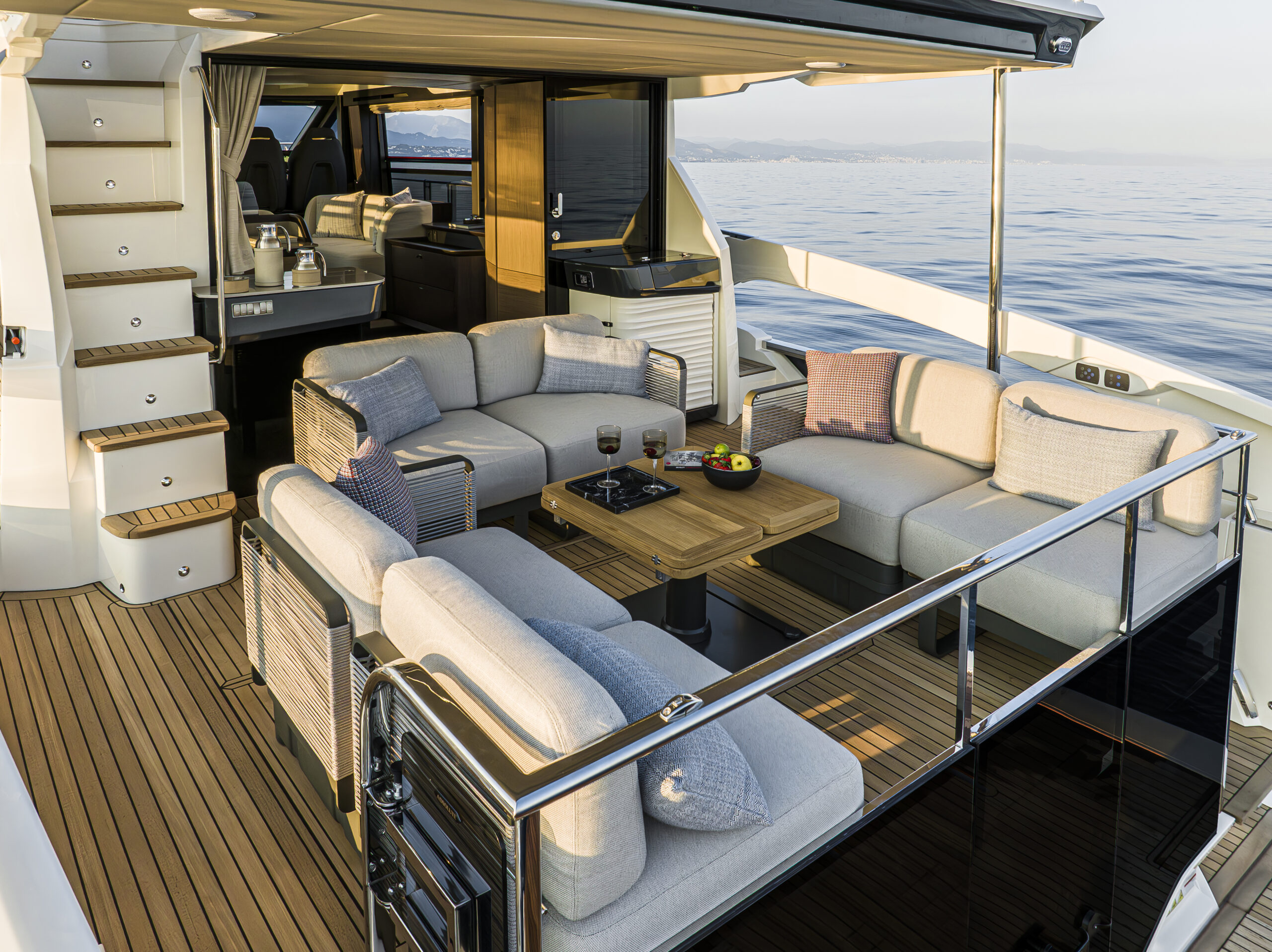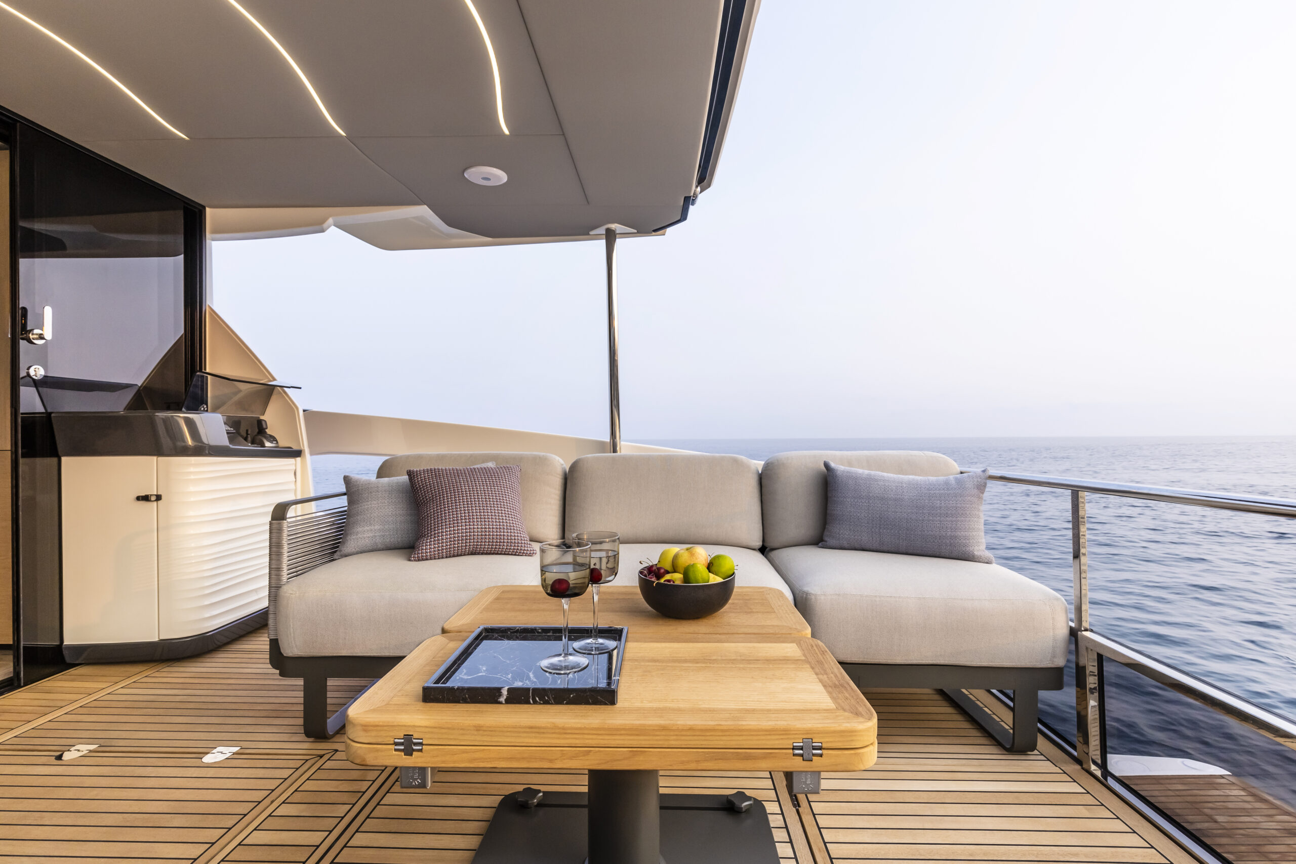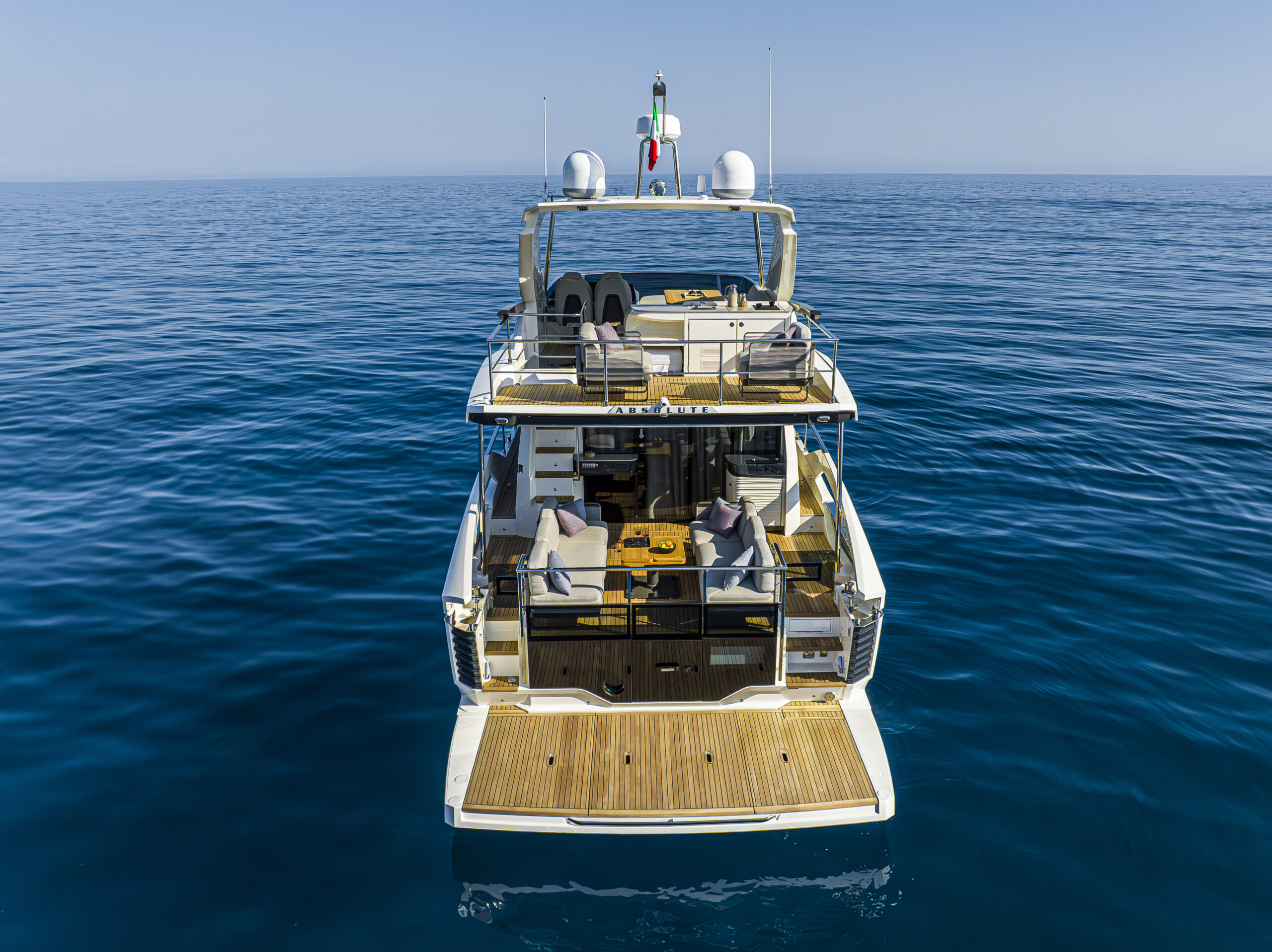 Absolute’s iconic cockpit terrace continues to impress with its versatility. The modular furniture adapts to your needs throughout the day, and adjustable shades provide comfort as the sun moves across the sky. Easy access to the stern platform lets you connect with the water, while the nearby wet bar and galley are perfect for serving up refreshments. The glazed stern parapet and open gunwale design ensure you’re always treated to the best views.