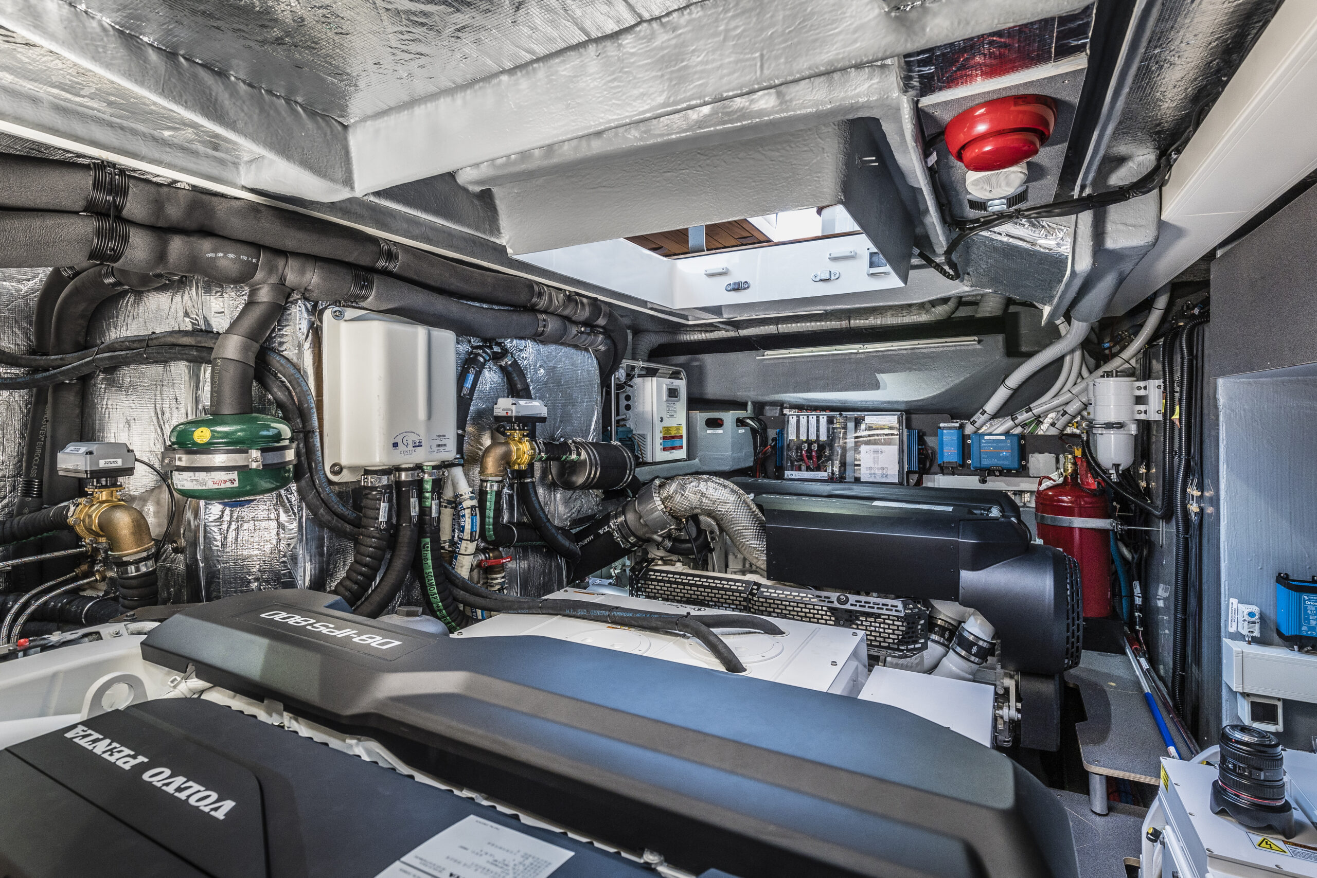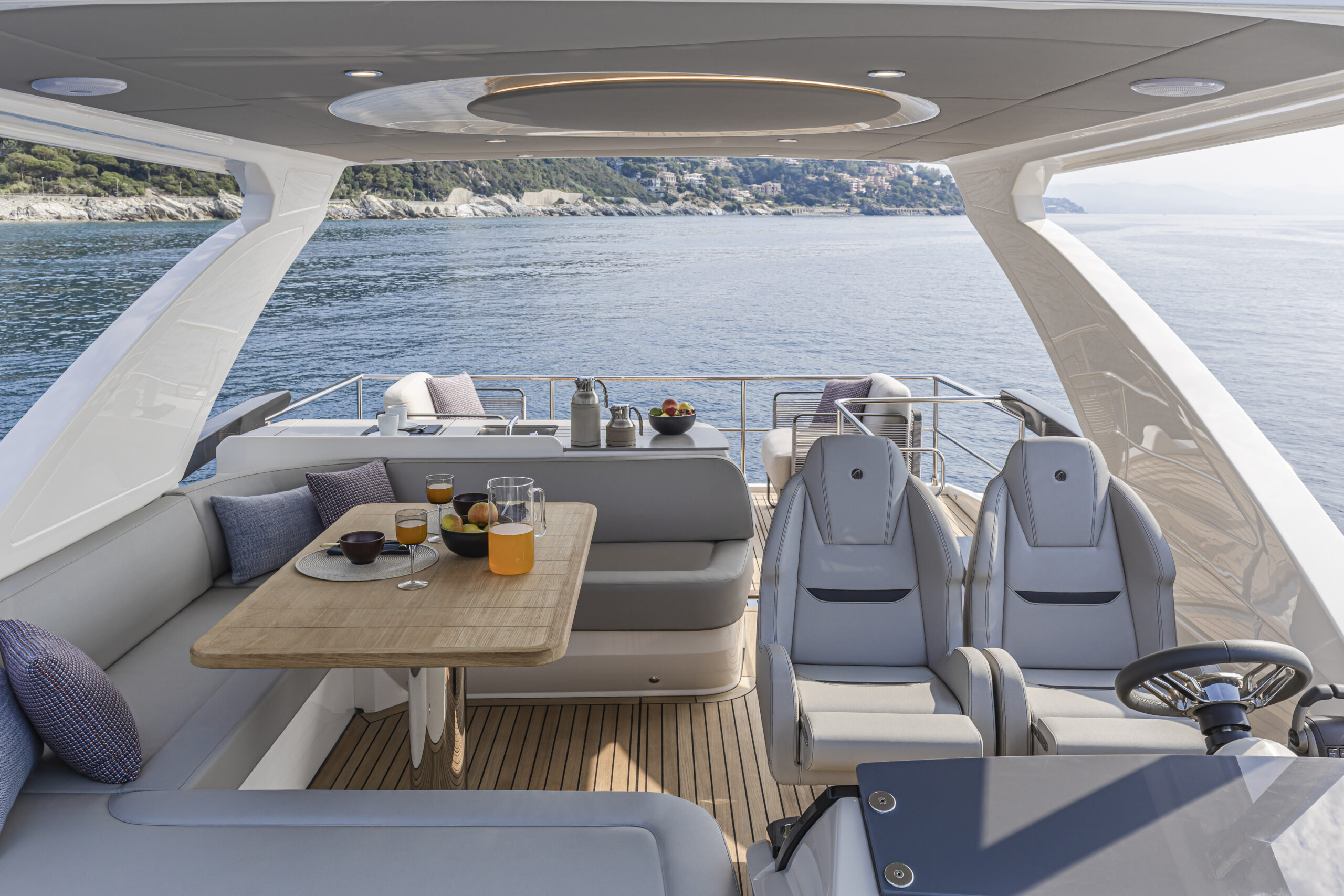The main helm station is strategically placed for optimal visibility, featuring advanced infotronics and comprehensive on-screen monitoring of all systems. A convenient door leads directly to the lateral walkway, making harbor maneuvers smooth and straightforward.