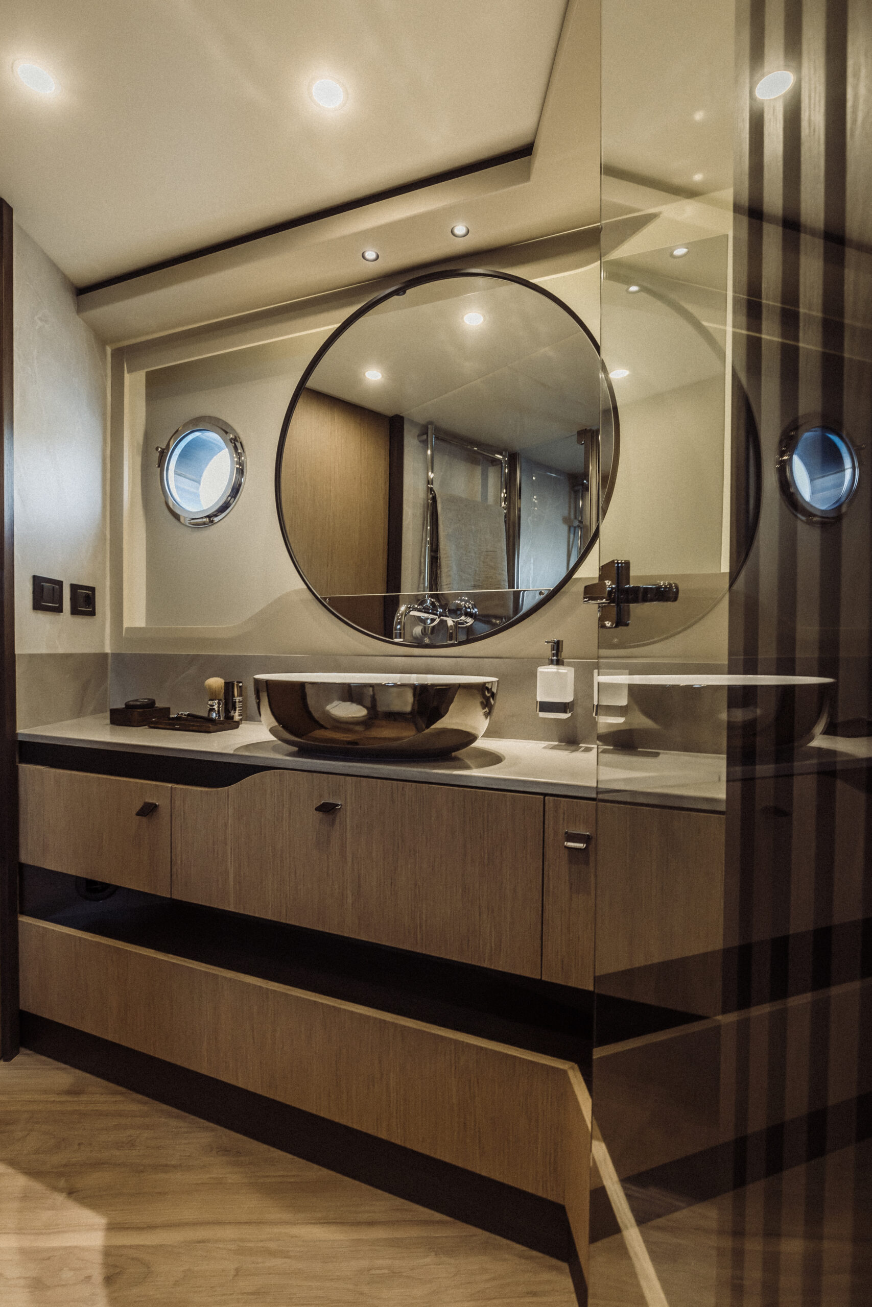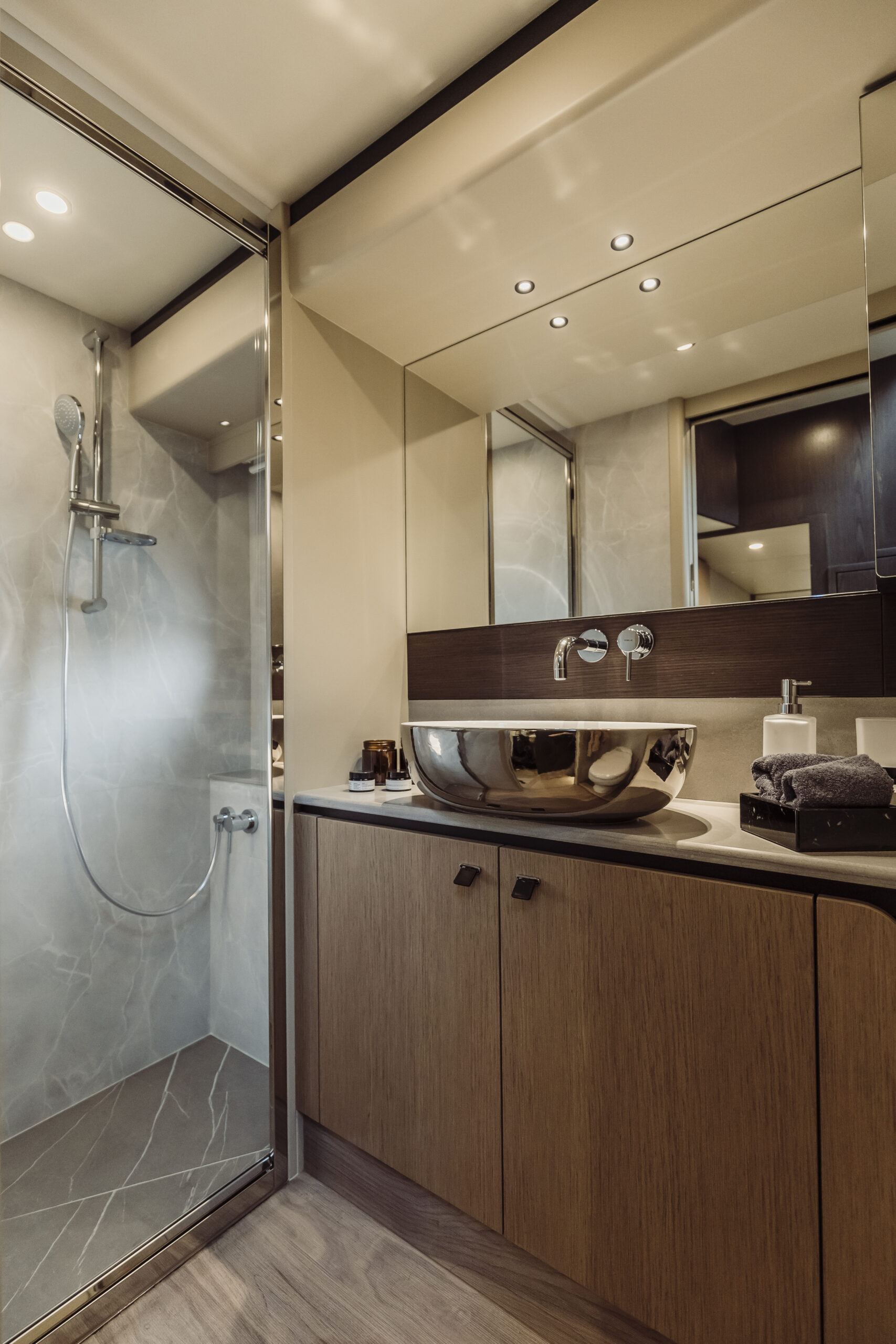 The master cabin, located at the bow, is a sanctuary of peace and privacy. Its full-beam layout maximizes space, with a large double berth accessible from all sides, ample storage, and a luxurious marble bathroom.