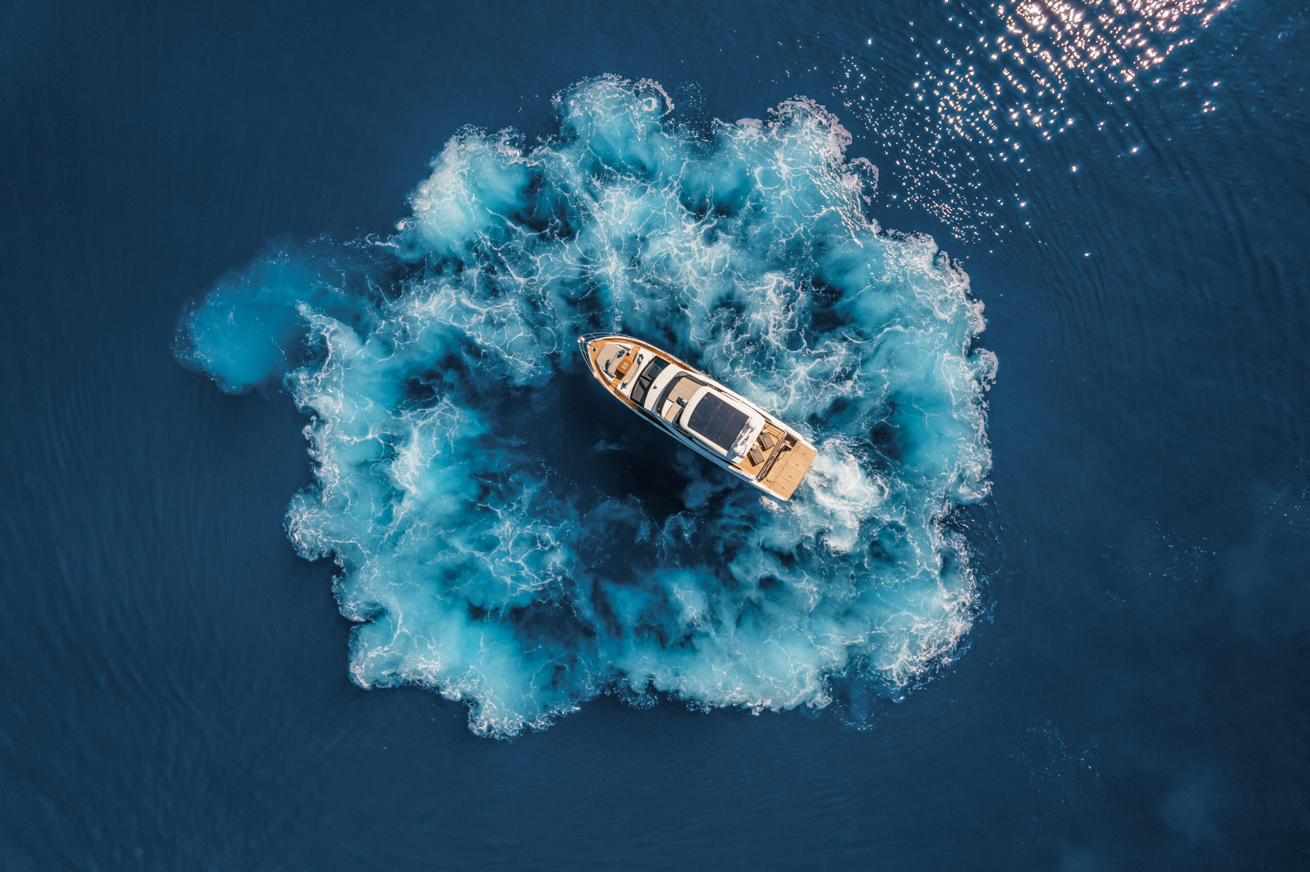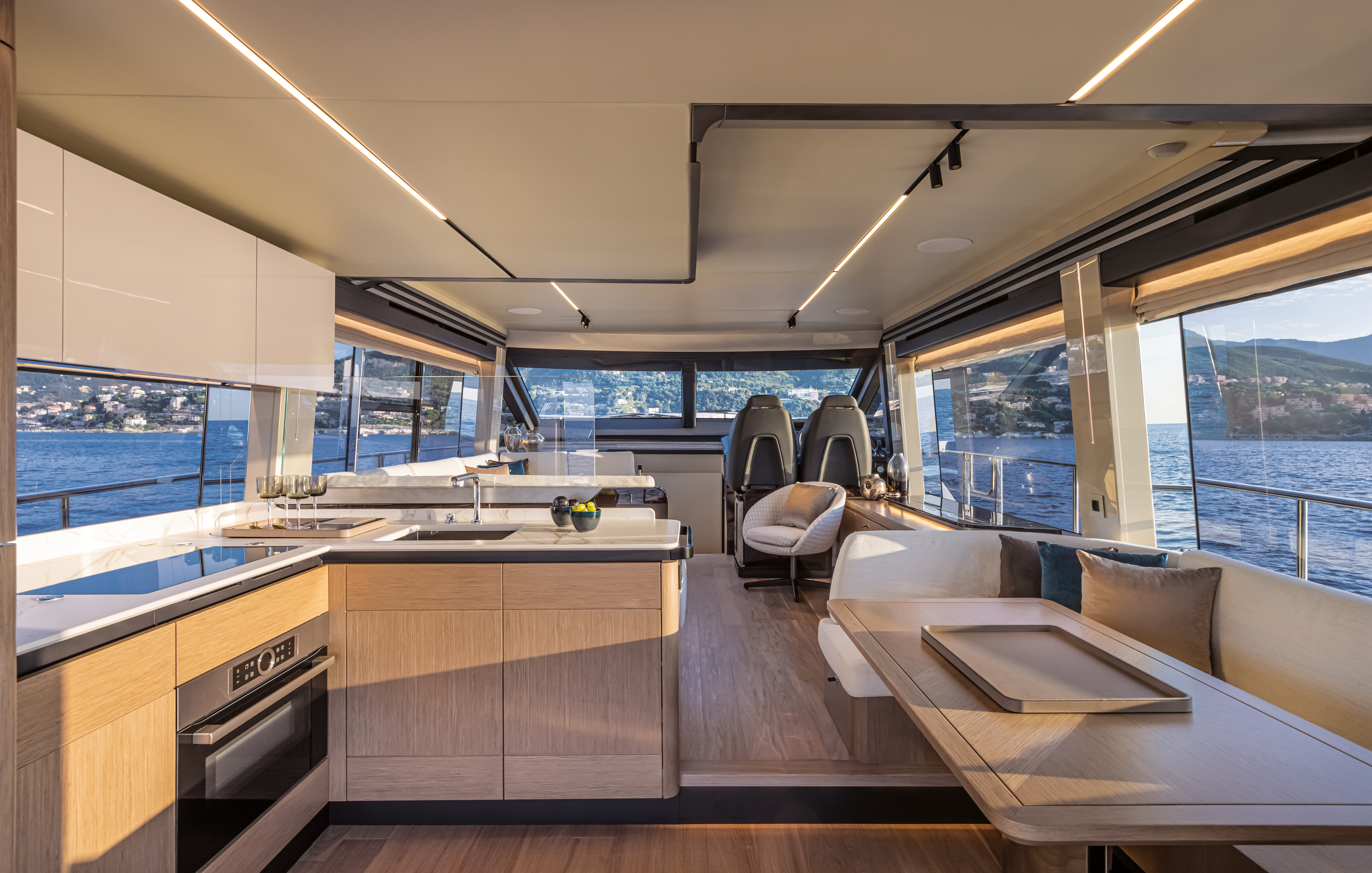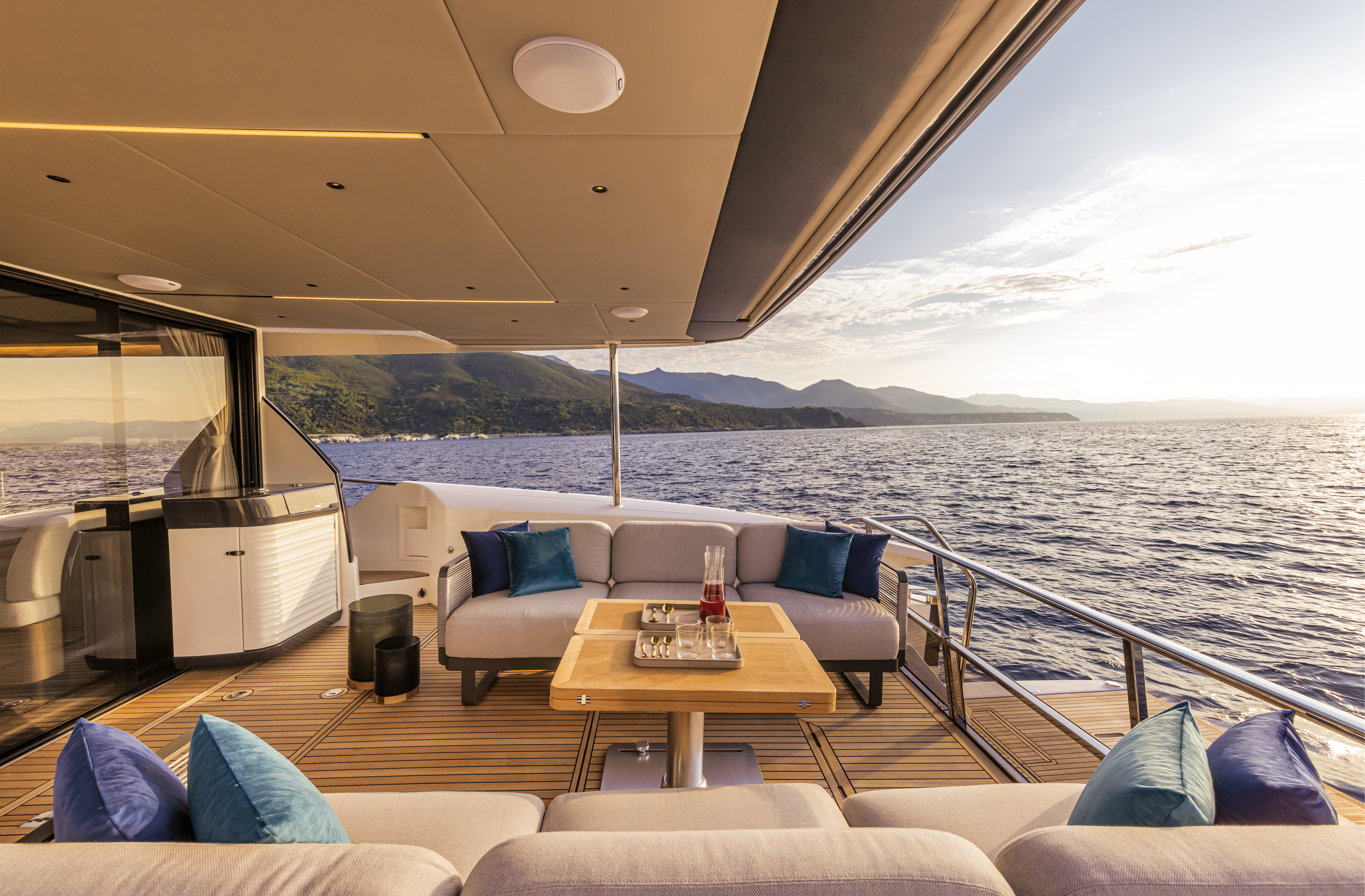 Head up to the upper deck flybridge for a versatile outdoor space perfect for sunbathing, mingling, and navigating the waters. The elegant design and top-notch finishes make this area a true gem, complete with a galley, dining area, and cozy spots for chilling out. The helm station is equipped with all the latest tech for smooth cruising. And at the bow, you’ll find a sunbathing area and a comfy sofa with a table – ideal for soaking up the sun or hosting a little get-together. Plus, you can opt for solar panels on the hard top to reduce your environmental footprint and increase your independence when anchored.