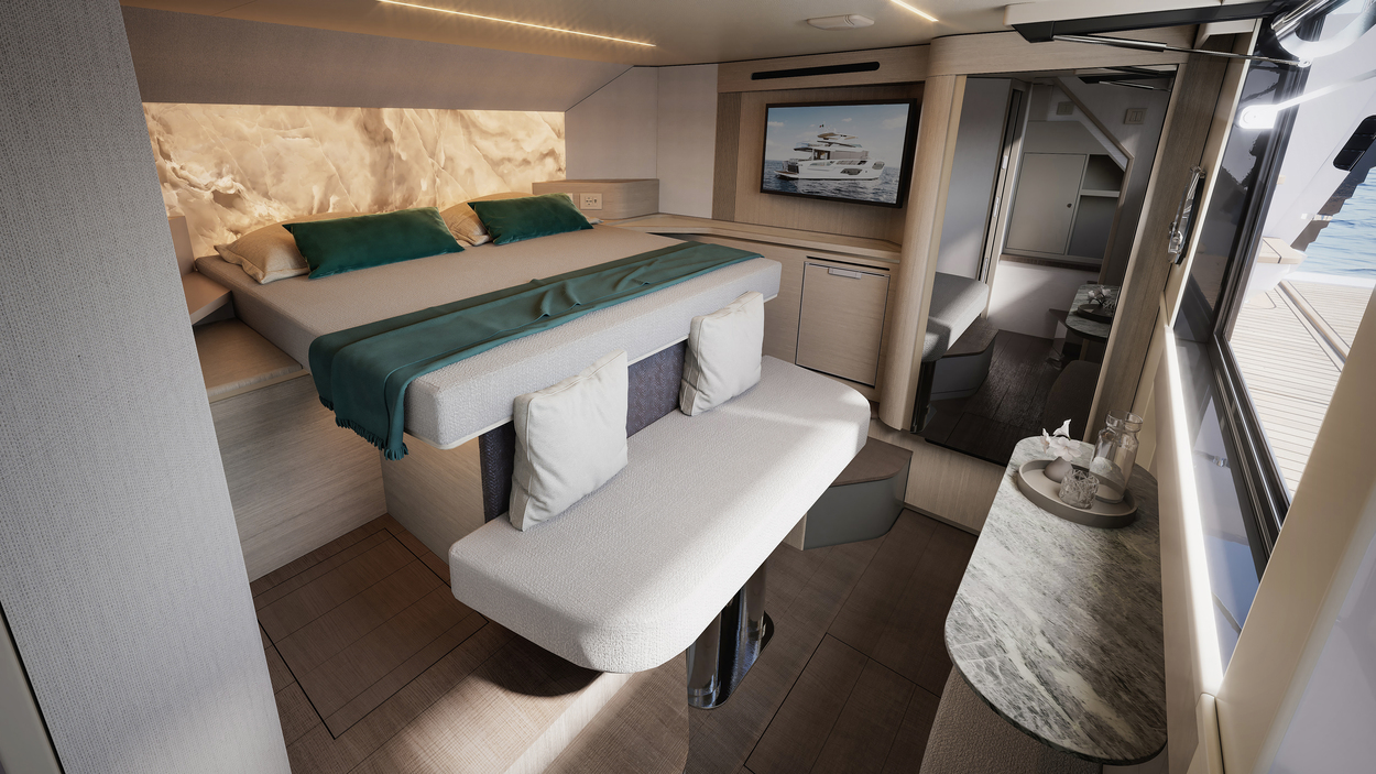 Life aboard the Navetta 66 yacht revolves around open-air enjoyment. The expansive flybridge blends dining, lounging, and navigation into one seamless space, perfect for all-day relaxation. On the foredeck lounge, panoramic views meet plush seating, while the shaded cockpit terrace offers a private retreat. For a truly unique experience, the innovative sea-level fourth cabin transforms at the touch of a button—from cozy lounge to double stateroom—bringing you closer than ever to the water.