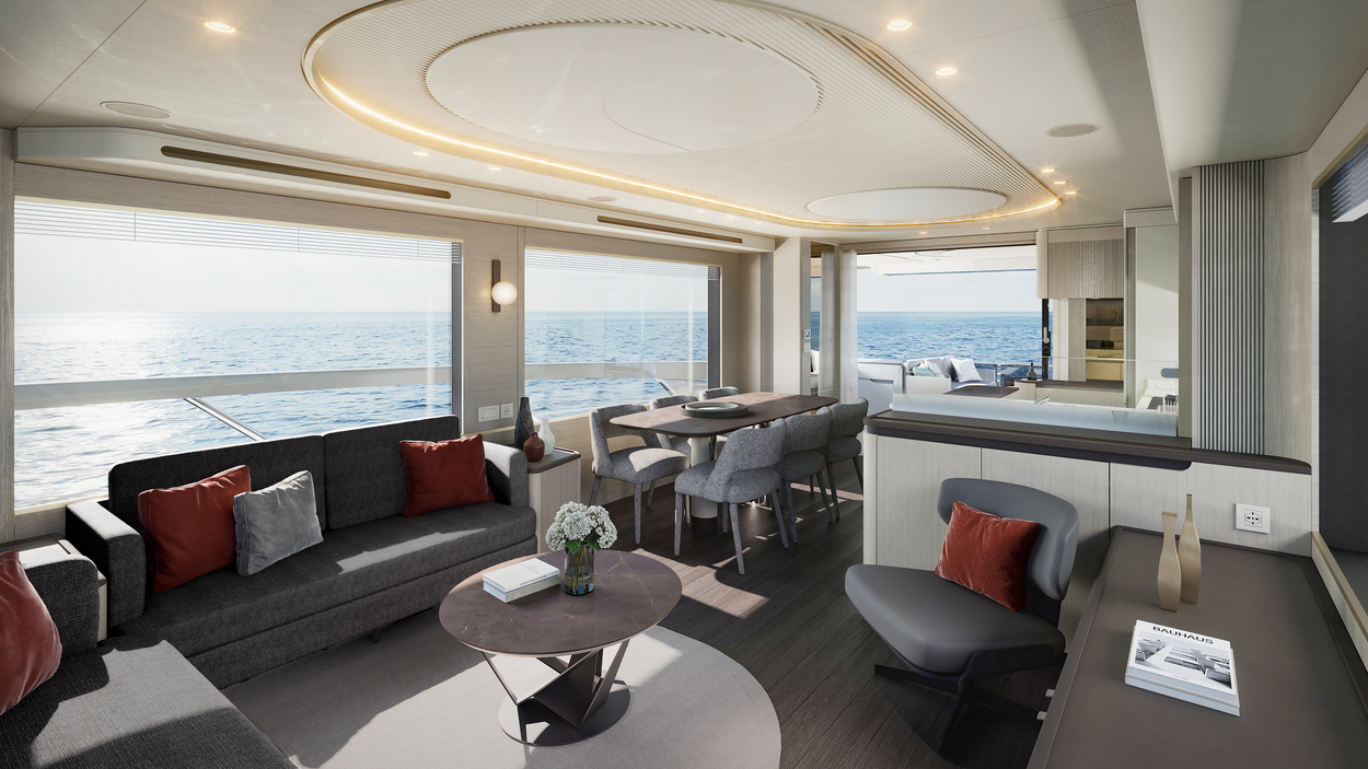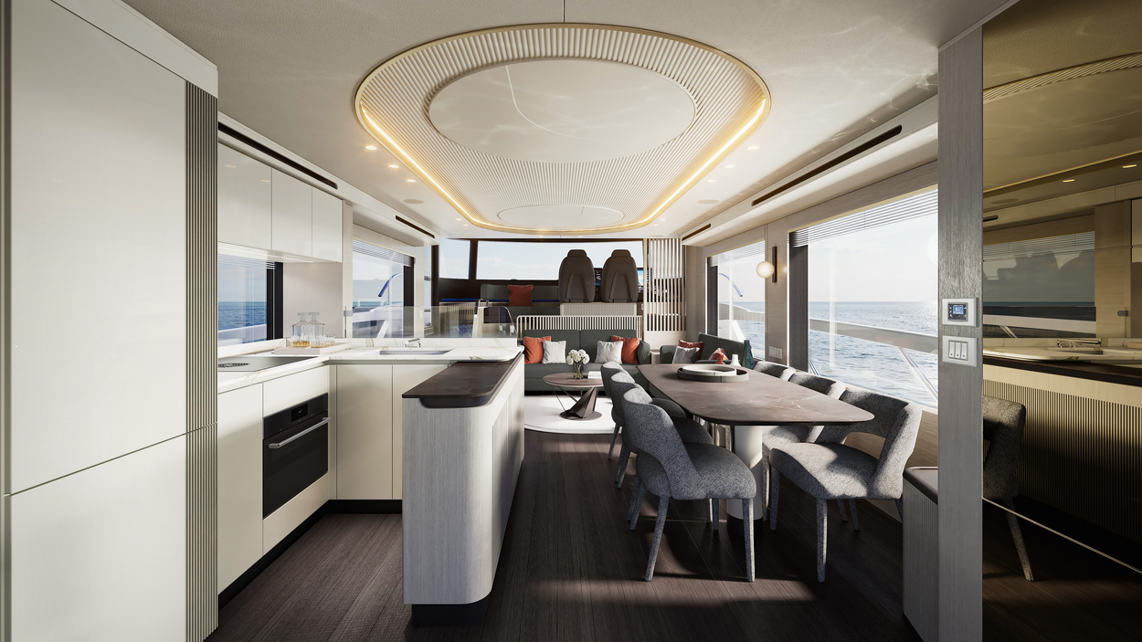 Inside, the Absolute 66 Navetta captures the essence of light-filled luxury. Oversized windows flood the saloon and staterooms with natural light, creating a constant connection with the ocean. Elegant materials—premium woods, ceramics, and refined finishes—create a balance of modern design and timeless sophistication.