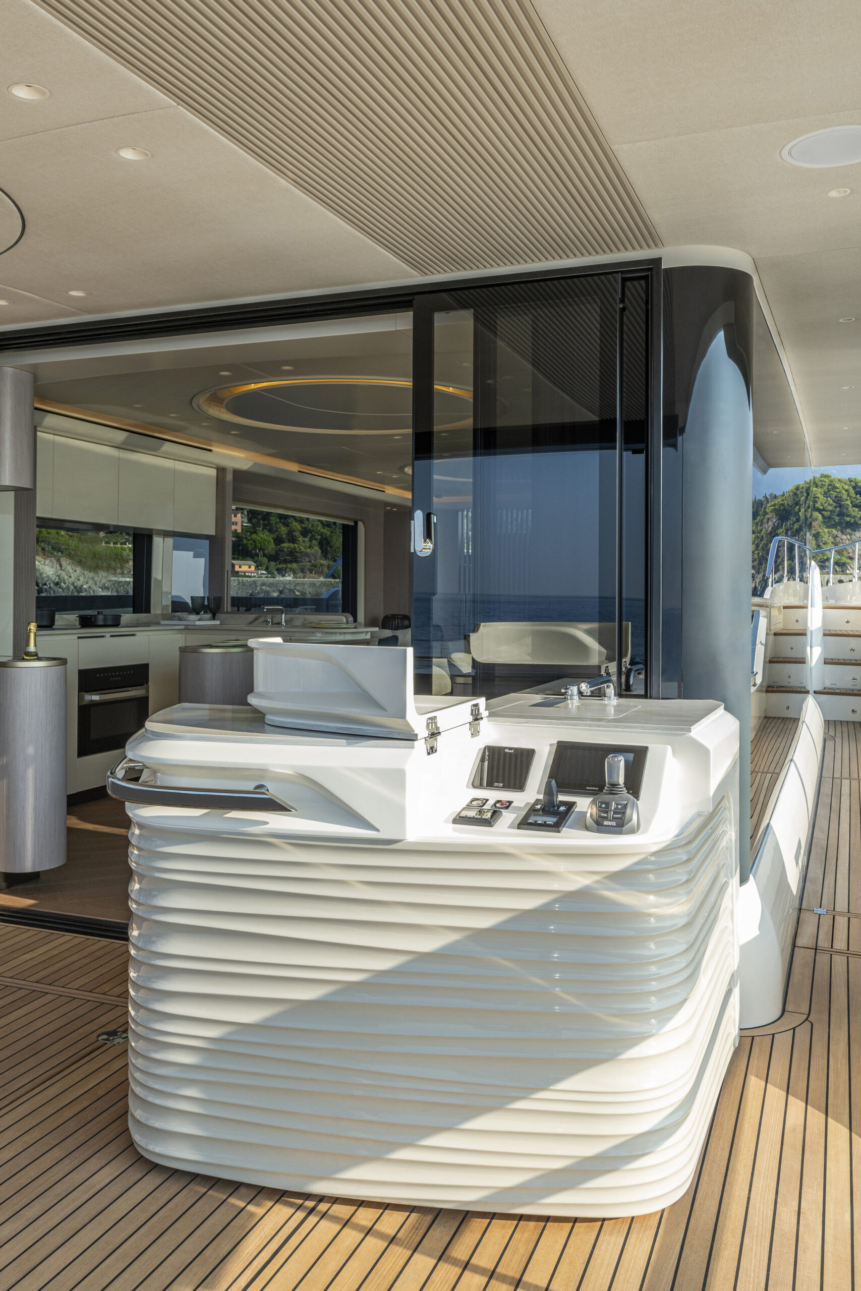 The sinuous profiles of the furniture and the circular motif used for lighting contribute to a sense of harmony and continuity. The constant visual connection with the external marine environment is ensured by the expansive windows.