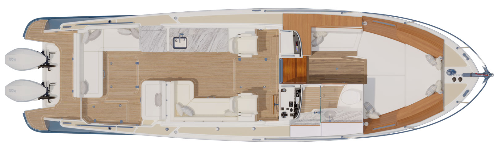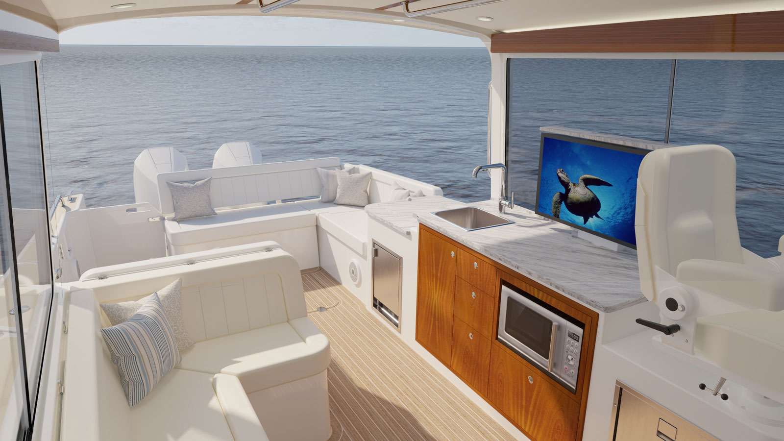 A galley-up configuration and expanded helm seating encourage easy flow and social interaction on deck. Below, the MJM 38R features a spacious V-berth, full galley, and private head with shower—providing true yacht-level comfort for overnight stays or weekend retreats.