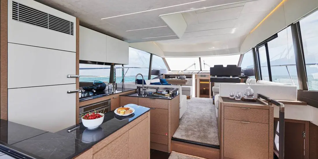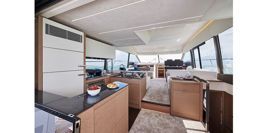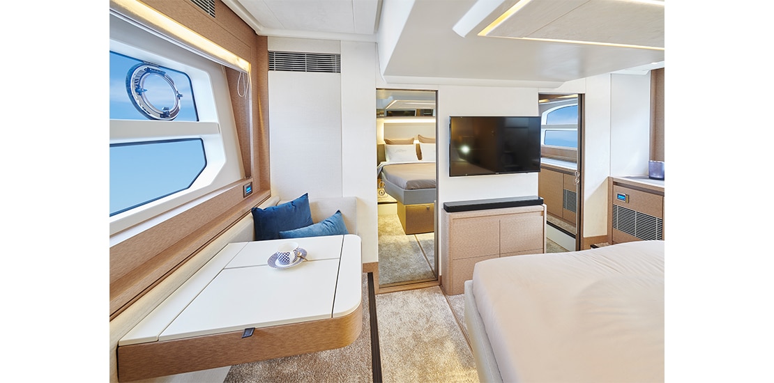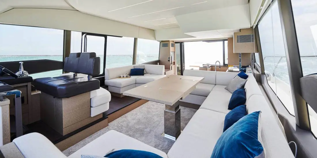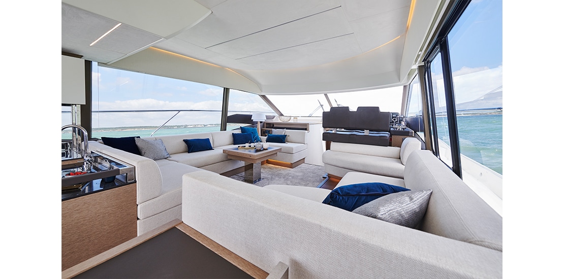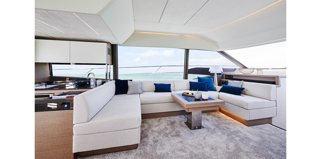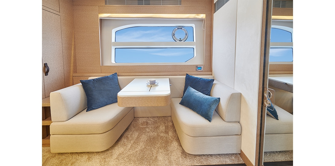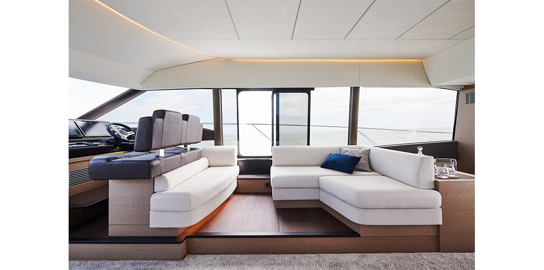 Attention to detail is key on the Prestige 590 Fly, with soft, rounded edges on the furniture creating cozy seating areas. The choice of materials, layout, and sightlines all contribute to a sense of well-being and refined elegance onboard.