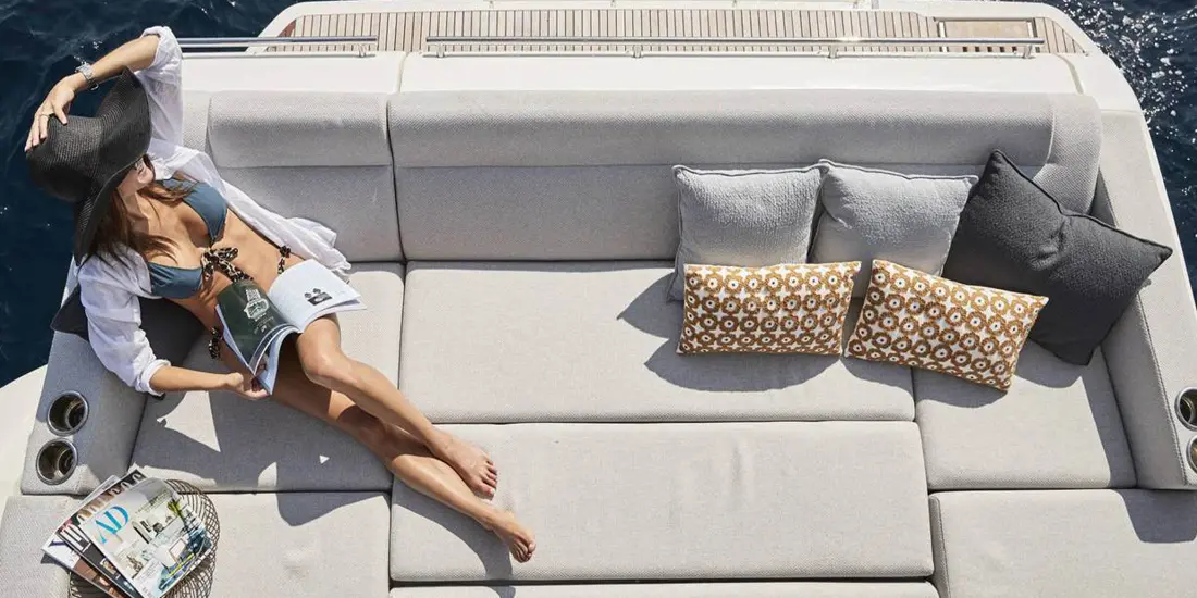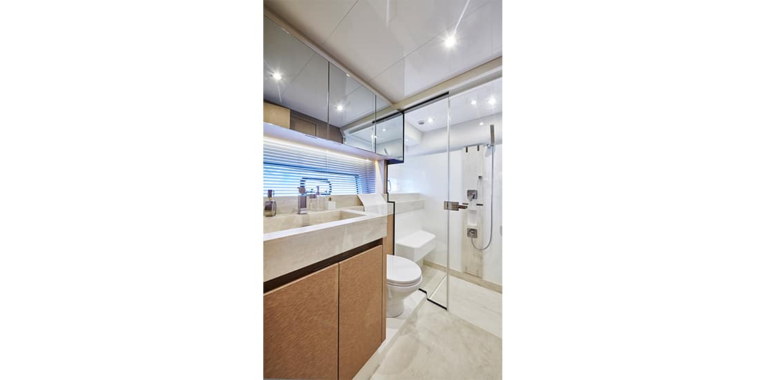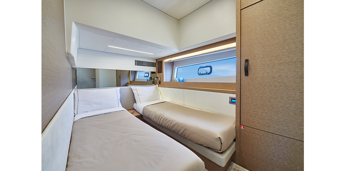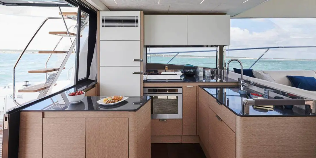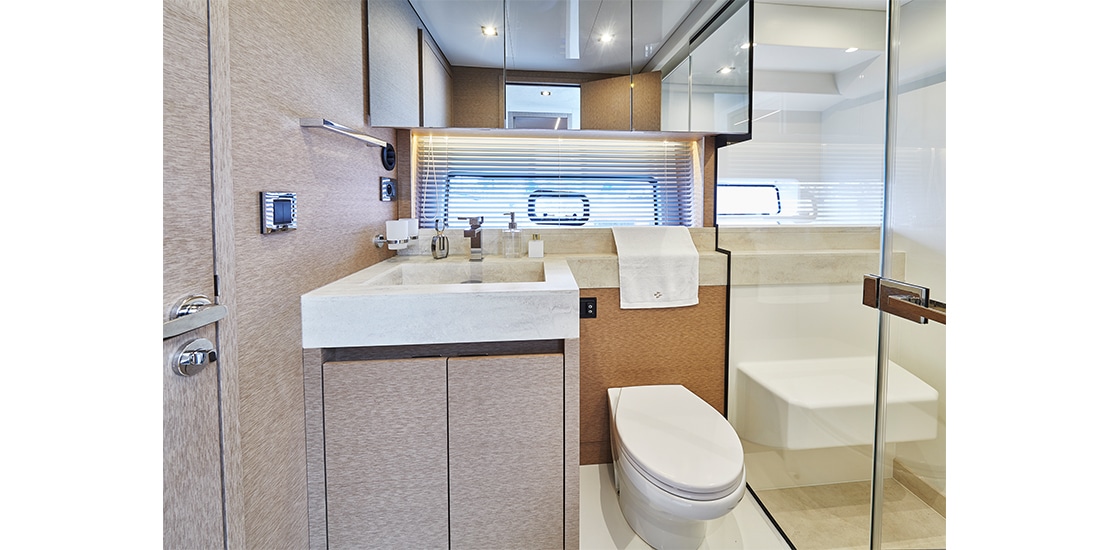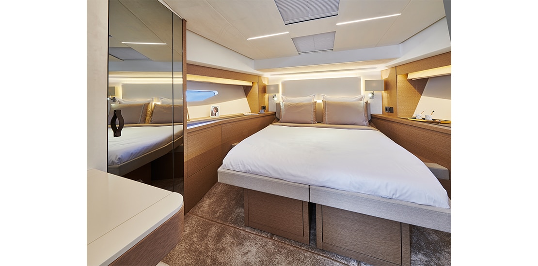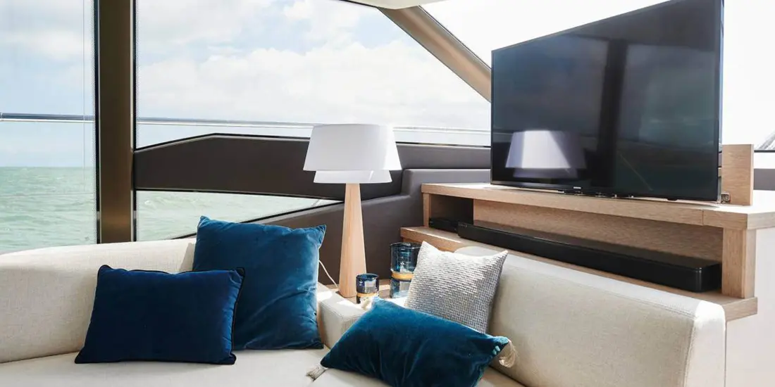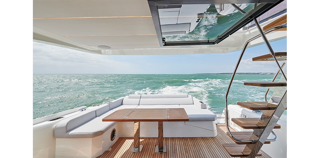 Attention to detail is key on the Prestige 590 Fly, with soft, rounded edges on the furniture creating cozy seating areas. The choice of materials, layout, and sightlines all contribute to a sense of well-being and refined elegance onboard.
