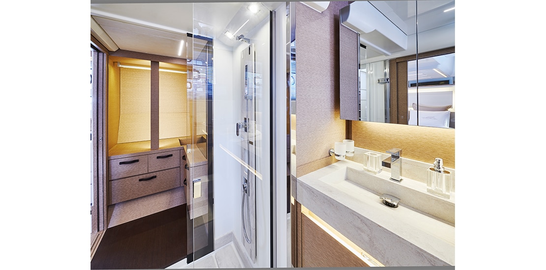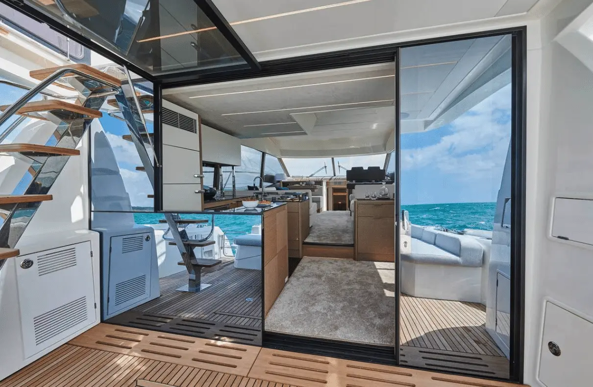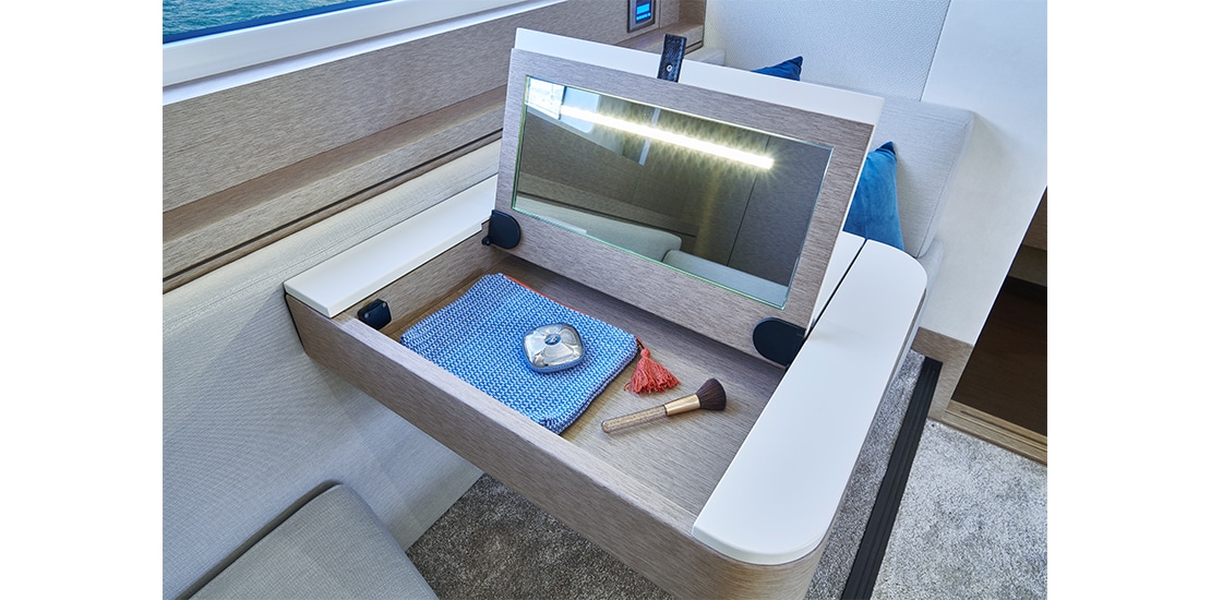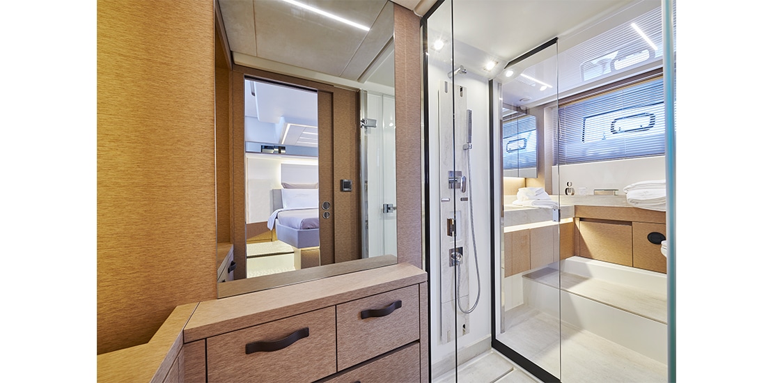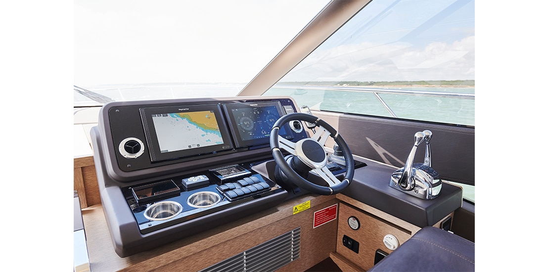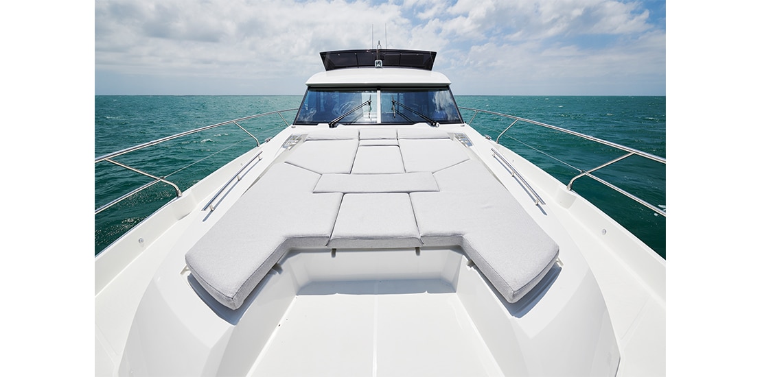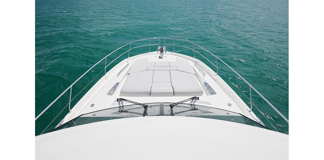 Attention to detail is key on the Prestige 590 Fly, with soft, rounded edges on the furniture creating cozy seating areas. The choice of materials, layout, and sightlines all contribute to a sense of well-being and refined elegance onboard.