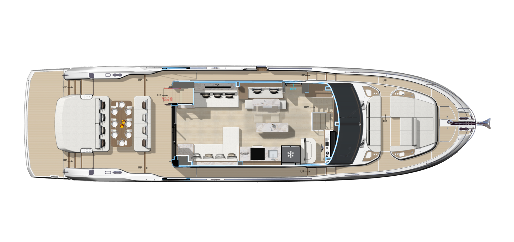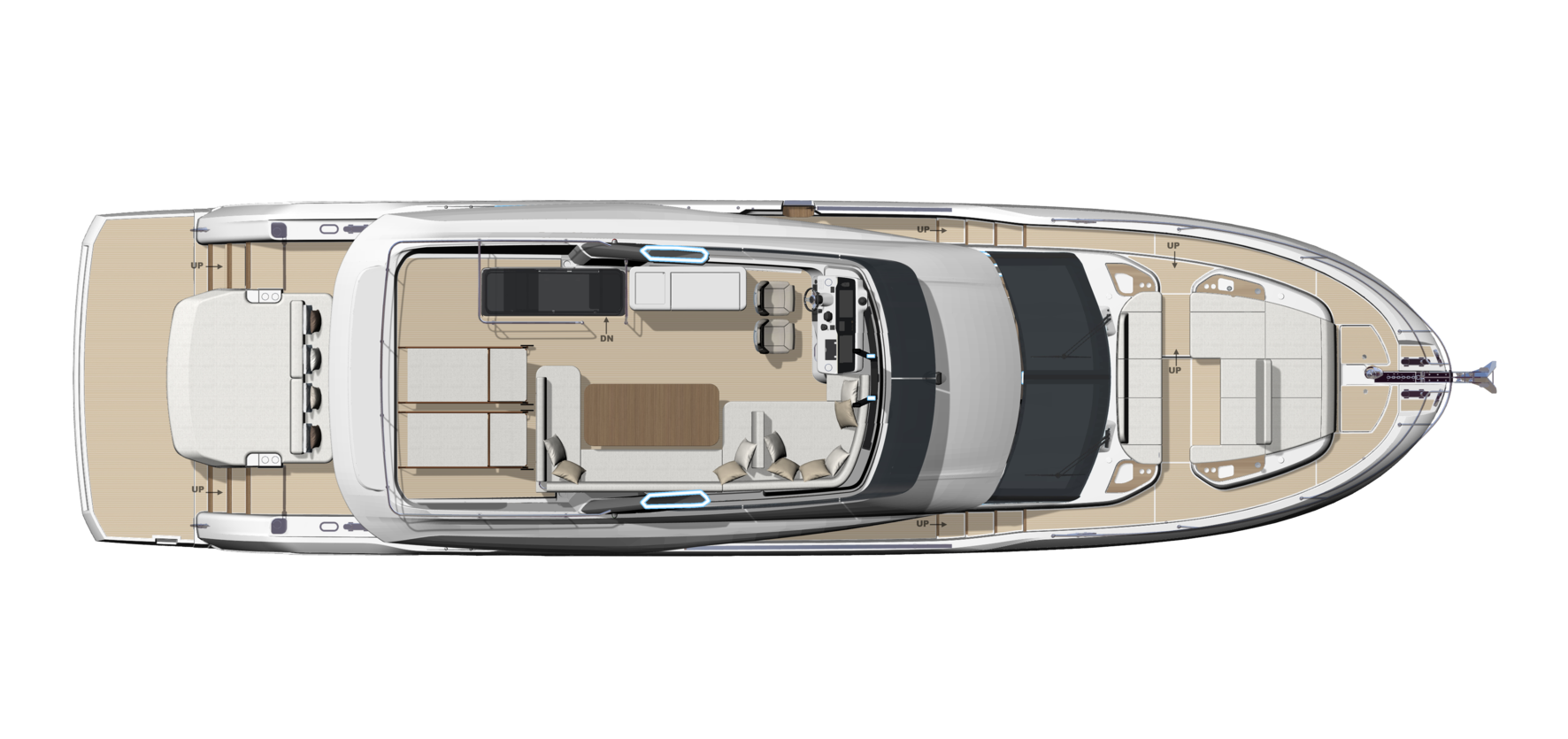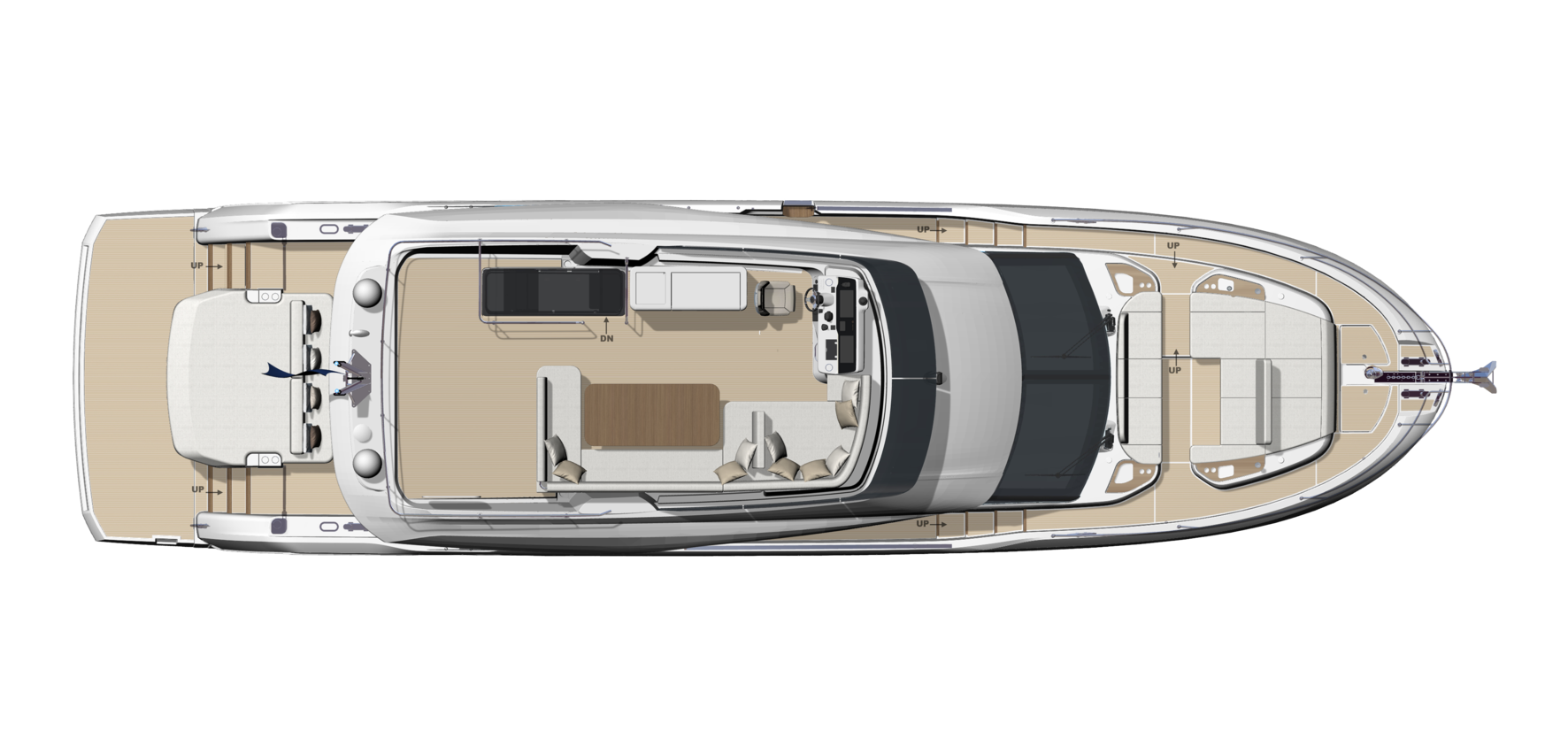 The 26 m² (280 sq. ft.) standard flybridge serves as a true panoramic terrace. Whether you’re hosting friends, enjoying sunset cocktails, or cruising in open air, the flybridge offers space, comfort, and stunning views in every direction.