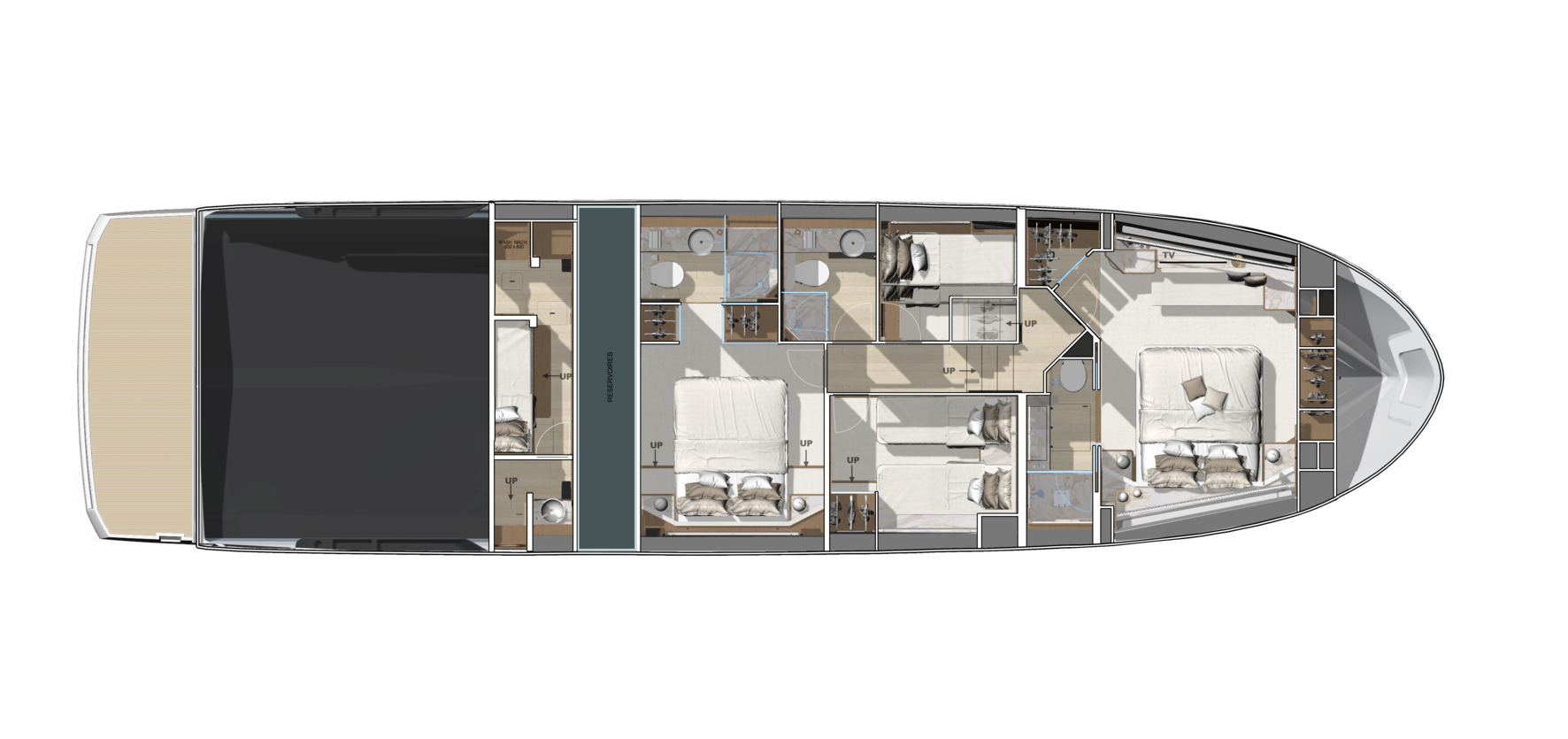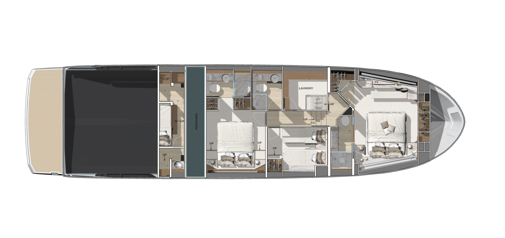 One of the F6.7’s most impressive features is the forward master stateroom, positioned at the bow for maximum privacy and panoramic views. Waking up surrounded by water and light sets the tone for every day on board.