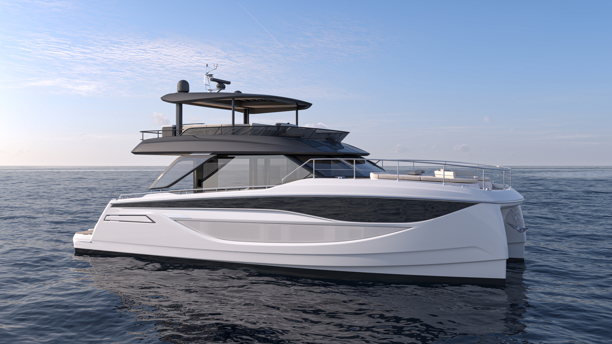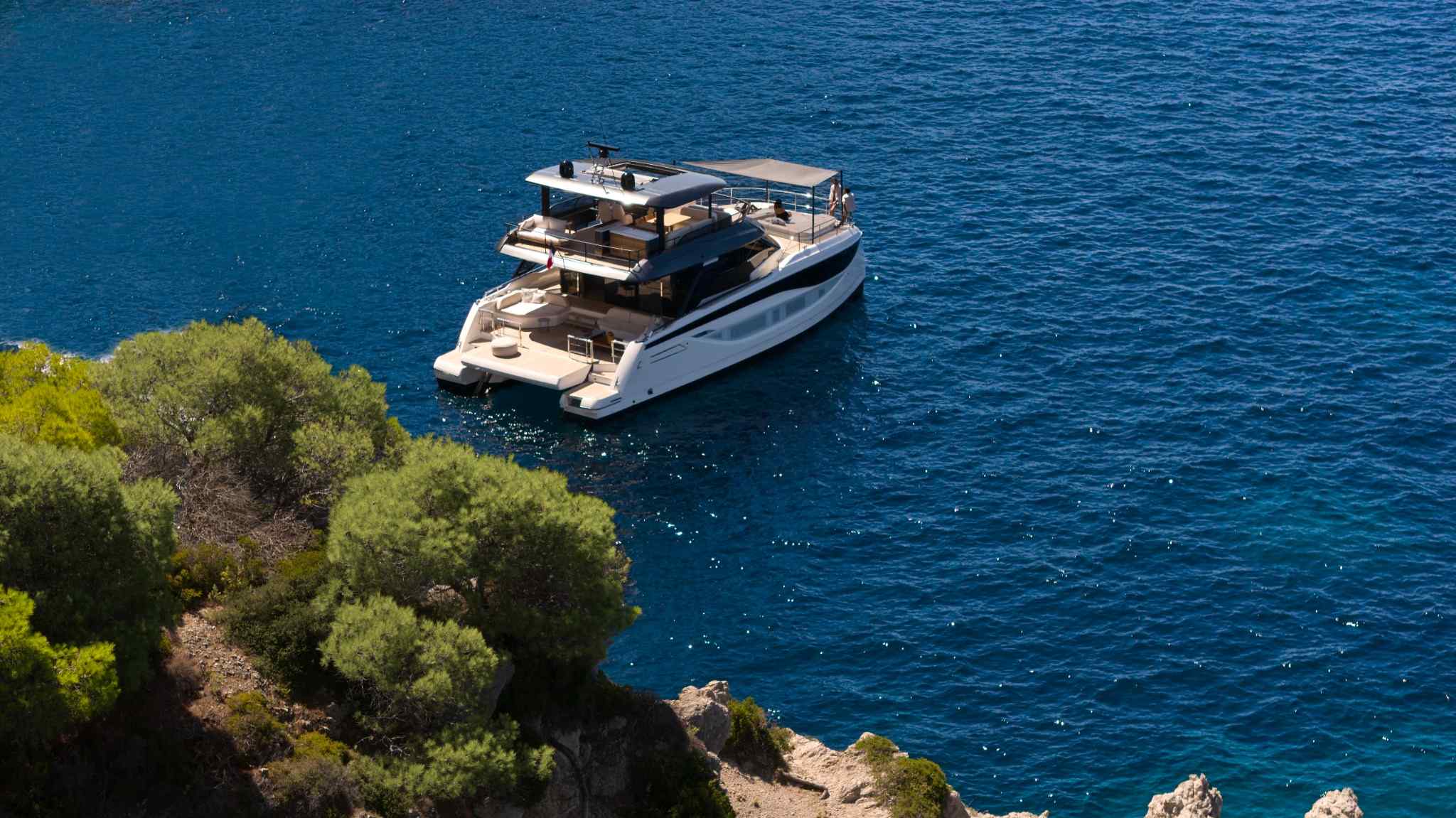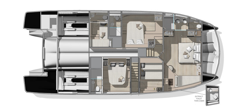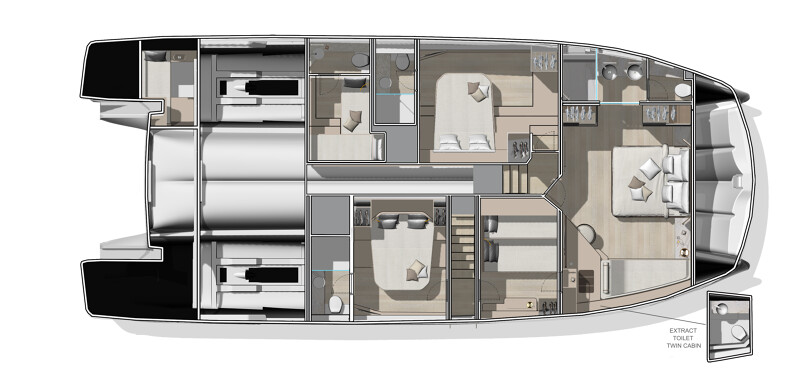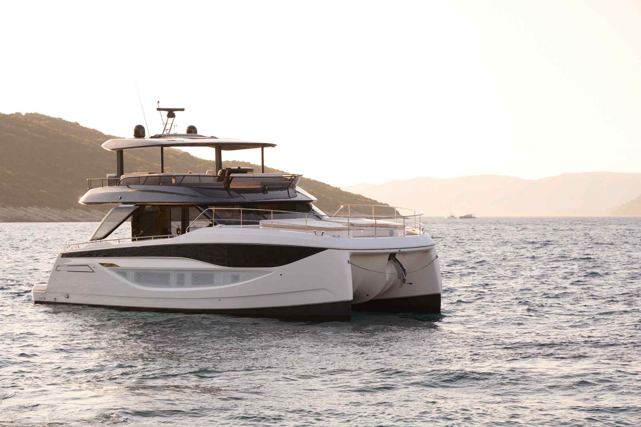 The M7’s multihull architecture sets a new benchmark in yachting, delivering 20% more onboard space than traditional monohulls of the same length. This breakthrough design ensures optimized interior volumes, exceptional stability, and a harmonious connection with the sea. Whether at sea or at anchor, the twin-hull platform provides unmatched balance and safety, elevating your cruising experience.