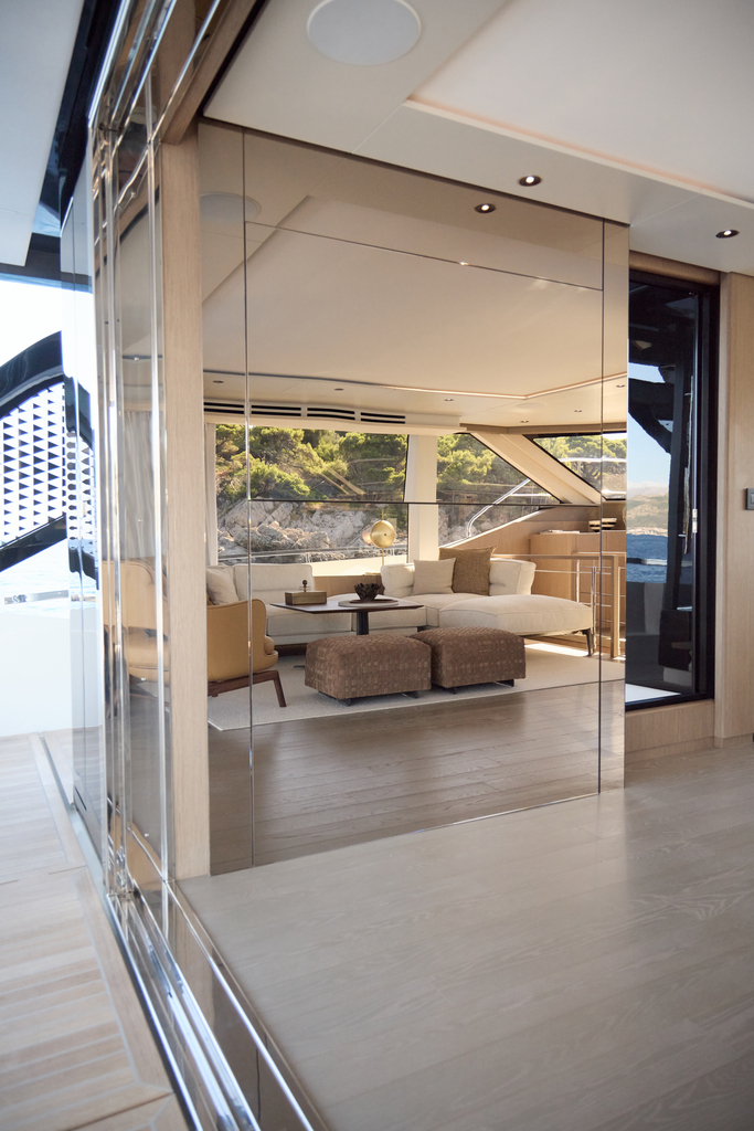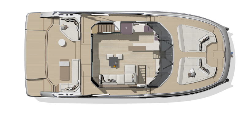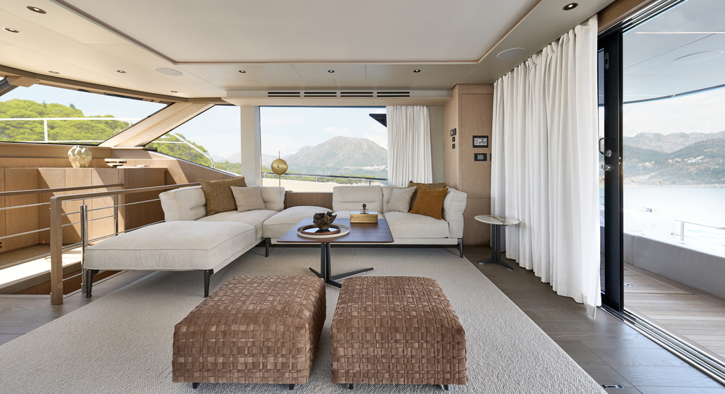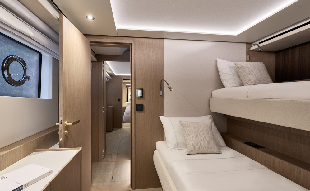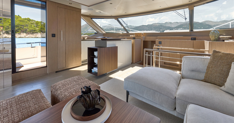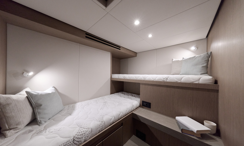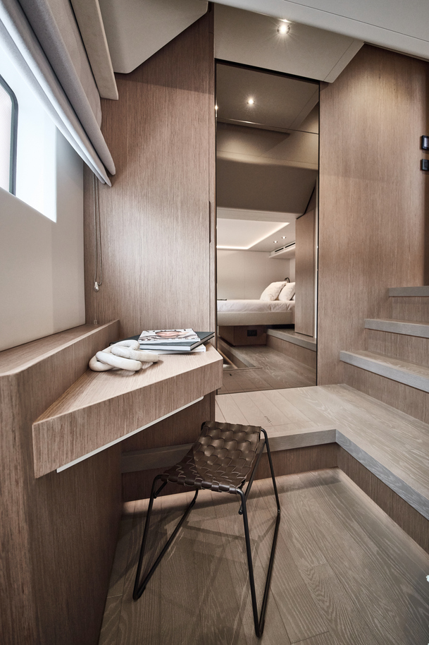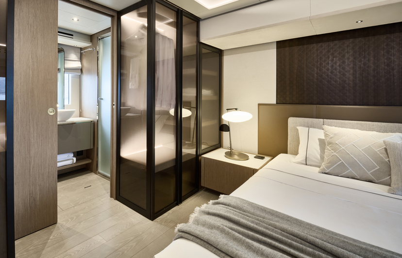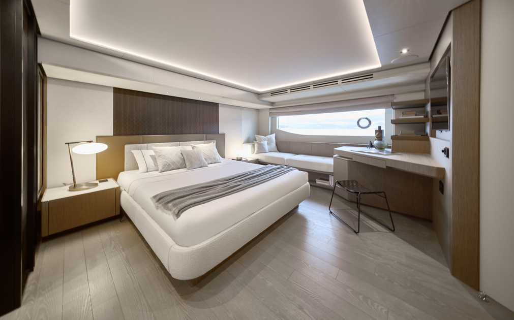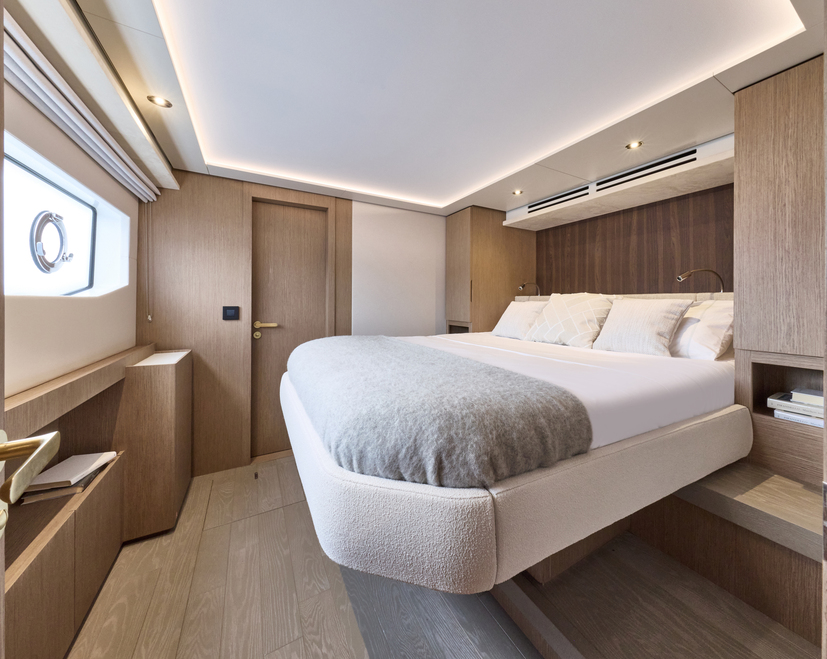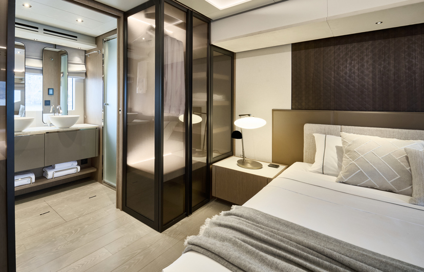 Step aboard to discover an expansive saloon bathed in natural light, courtesy of large panoramic windows and sliding glass doors. Every detail has been thoughtfully crafted to create a sense of openness and tranquility. The interior volumes are optimized to provide spacious, luxurious living areas, while the flybridge, cockpit, and foredeck offer multiple exterior spaces for socializing or quiet reflection.