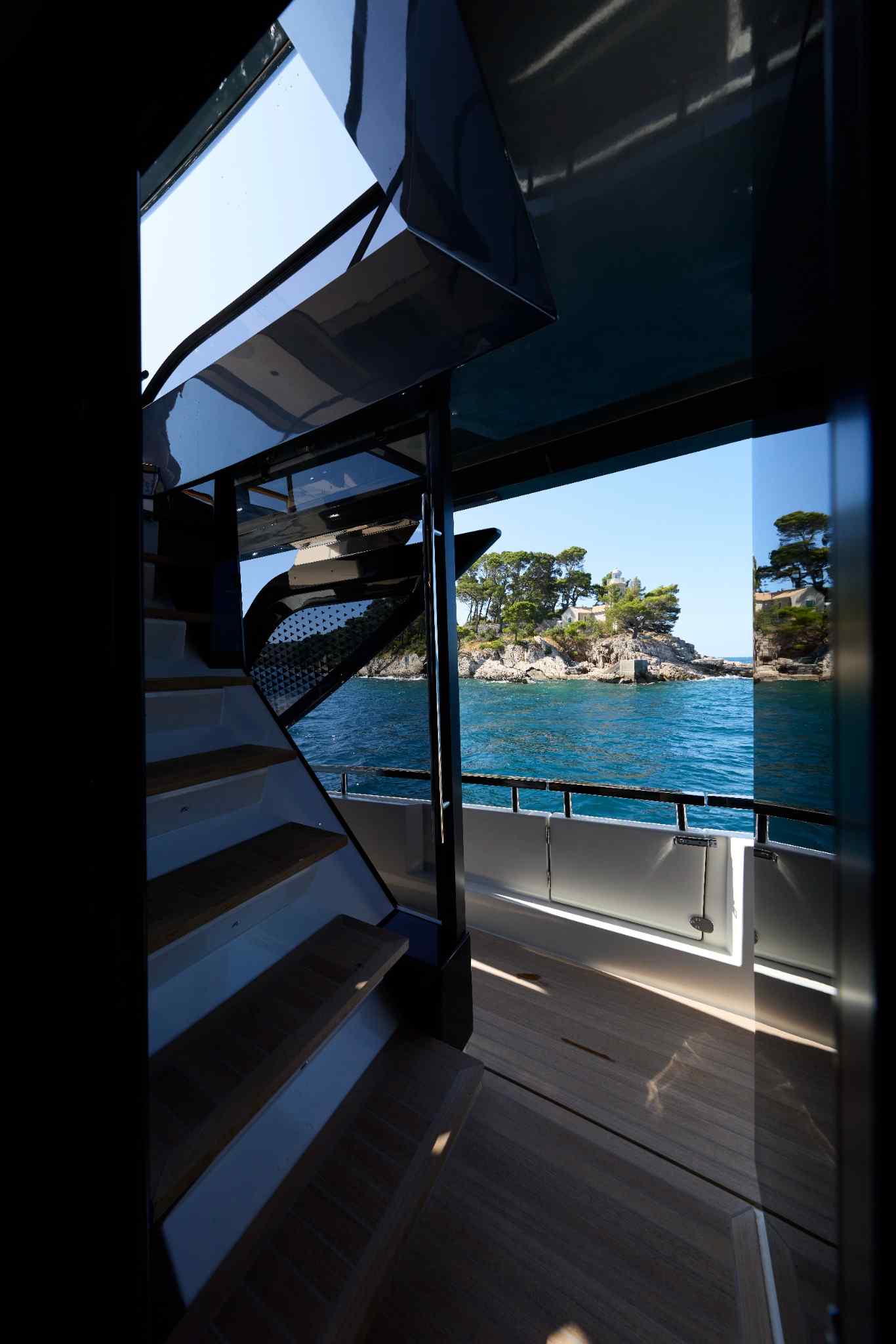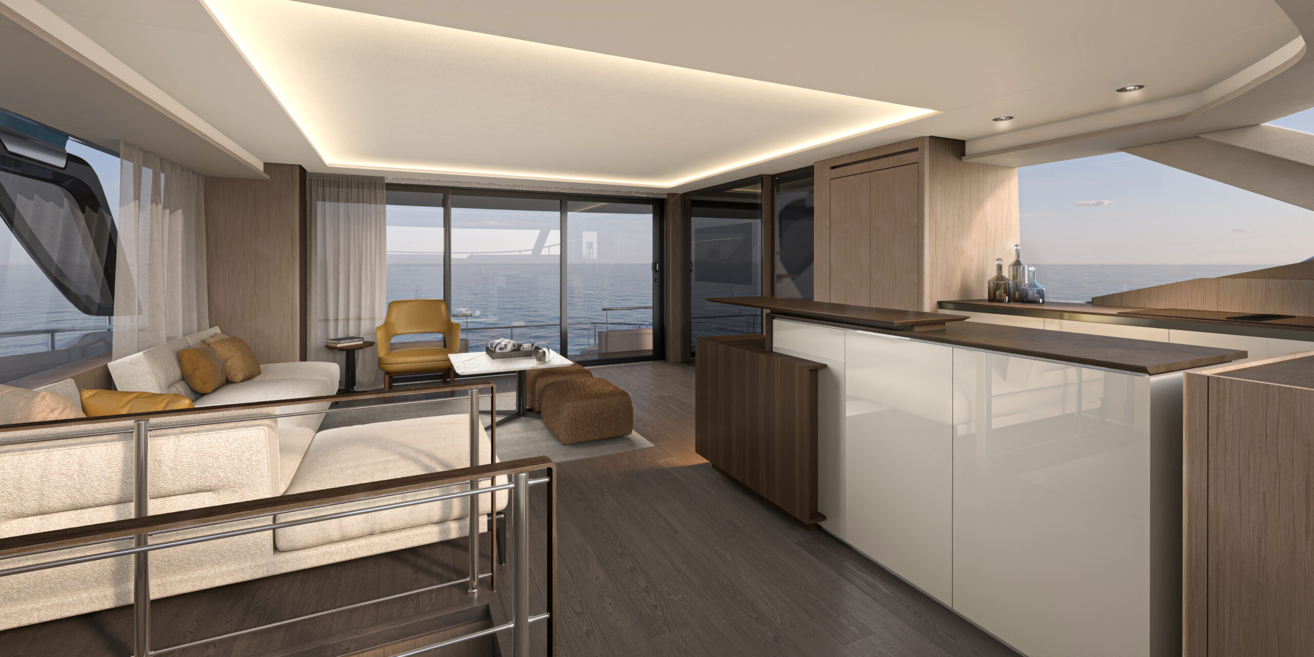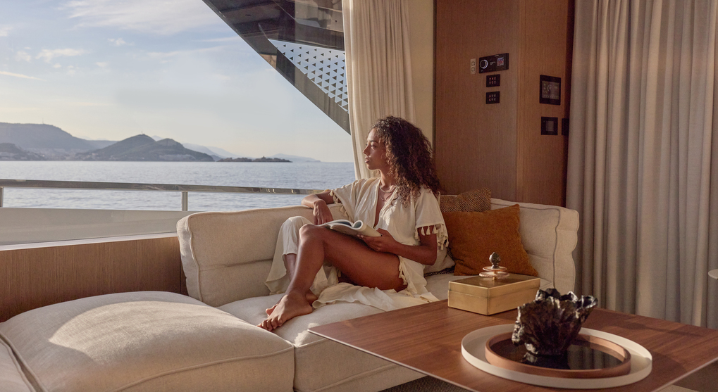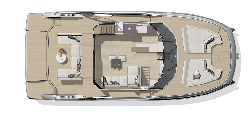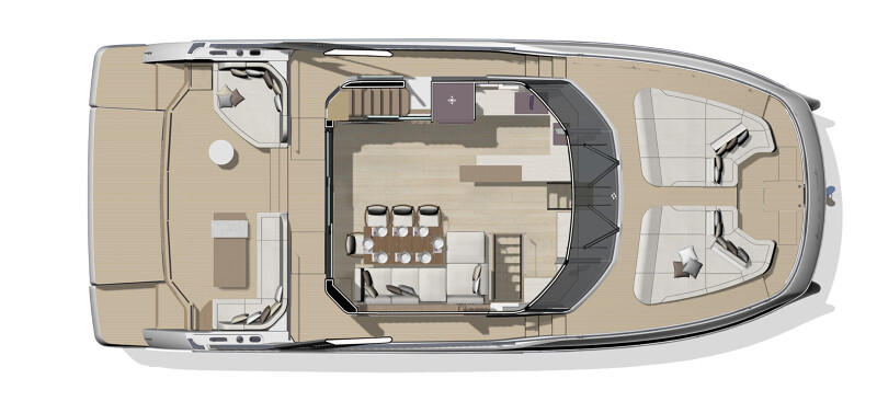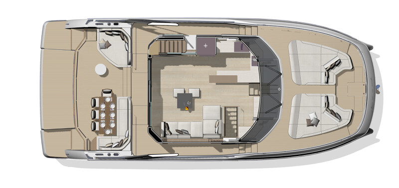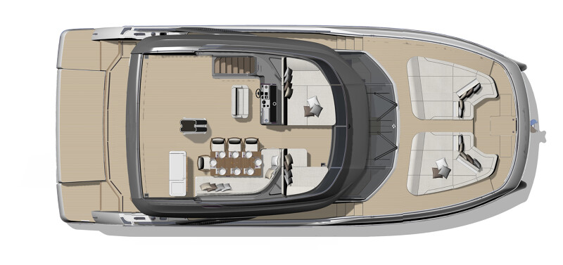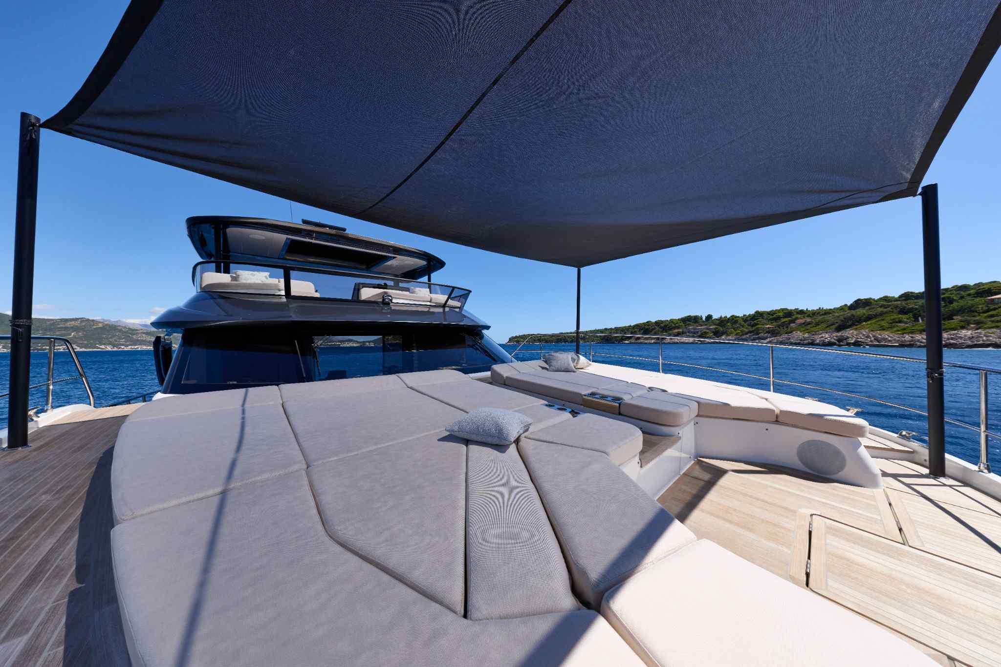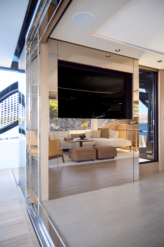 Step aboard to discover an expansive saloon bathed in natural light, courtesy of large panoramic windows and sliding glass doors. Every detail has been thoughtfully crafted to create a sense of openness and tranquility. The interior volumes are optimized to provide spacious, luxurious living areas, while the flybridge, cockpit, and foredeck offer multiple exterior spaces for socializing or quiet reflection.