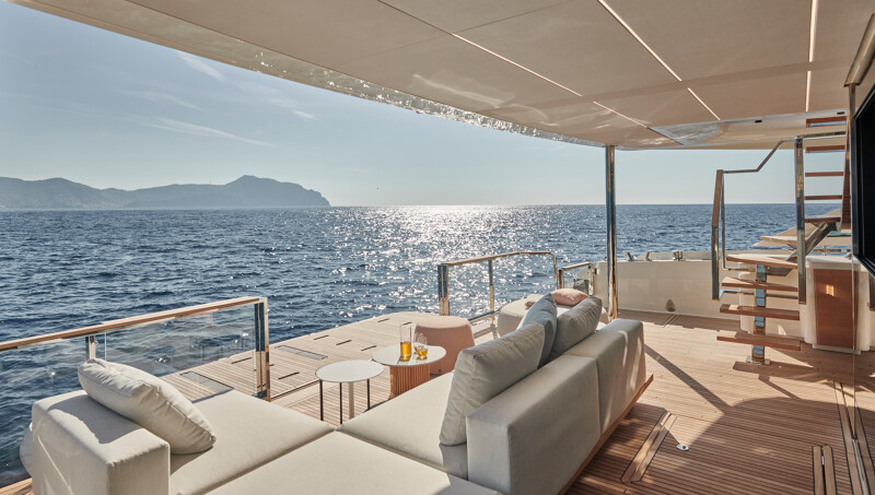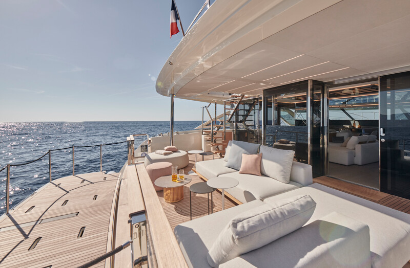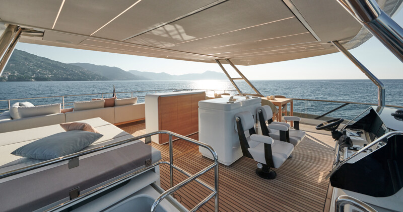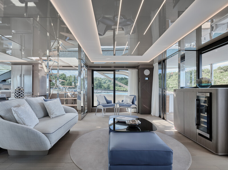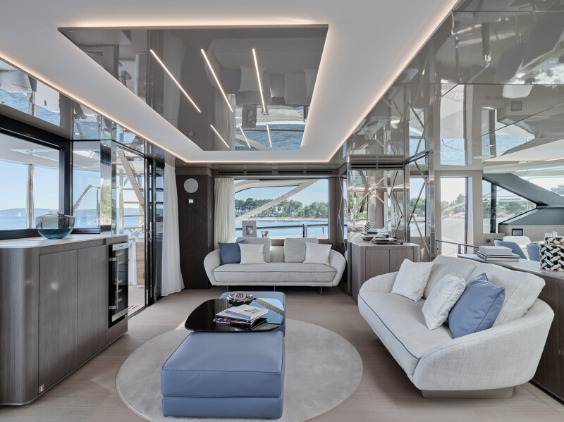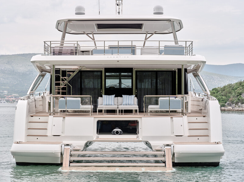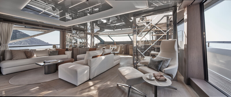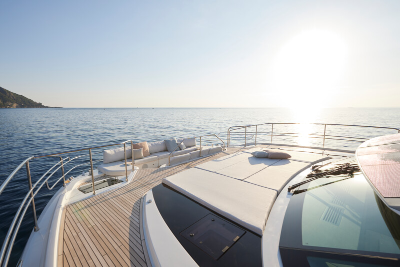 Step into a world of unparalleled well-being onboard the Prestige M8, where full-width cabins and living spaces rival those of an 85-foot monohull. The interior design exudes sophistication with high-end finishes, new materials, and a variety of colors. Entertainment spaces abound, including a spacious flybridge, a sea-oriented cockpit, a large aft terrace, an XXL forward saloon, and a cozy indoor saloon.