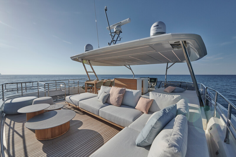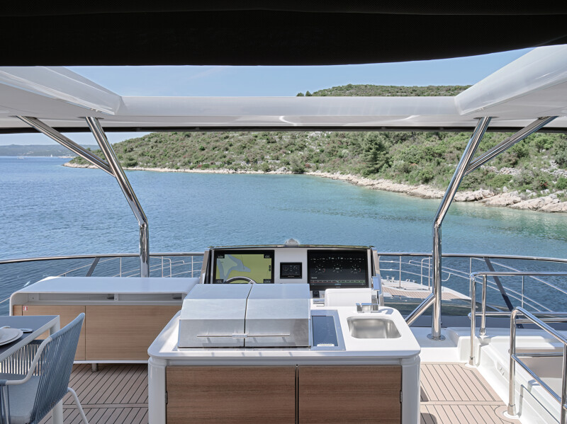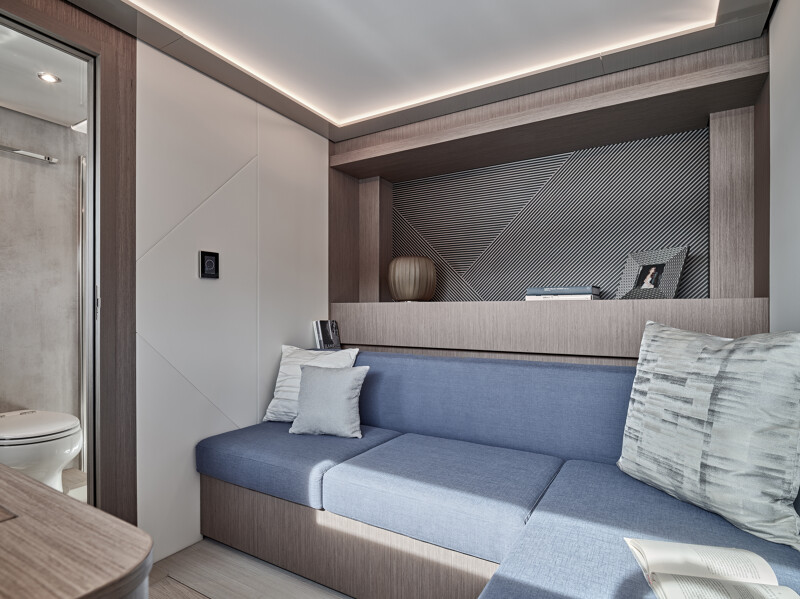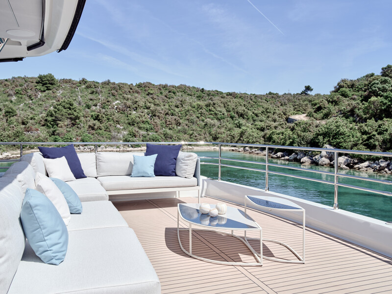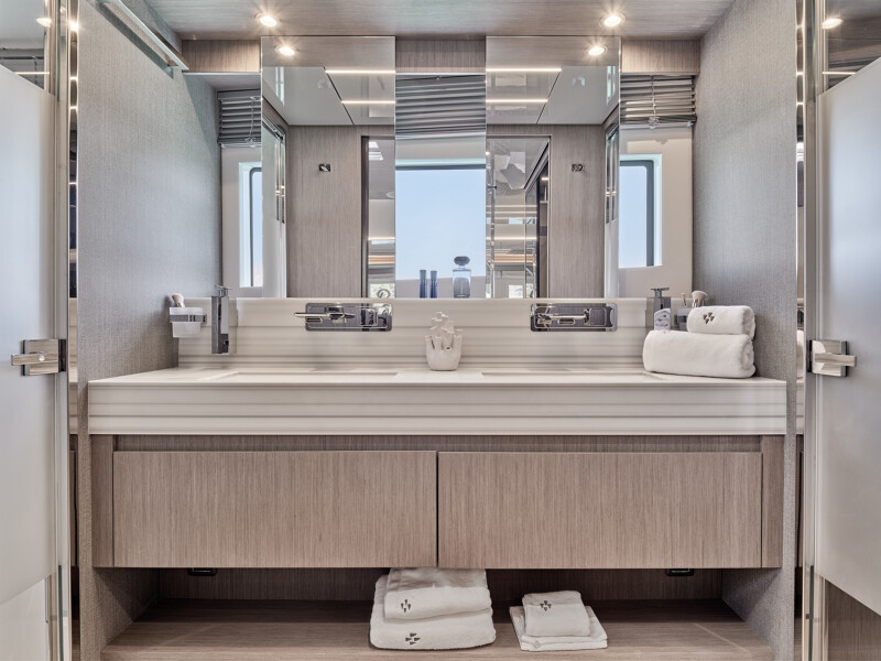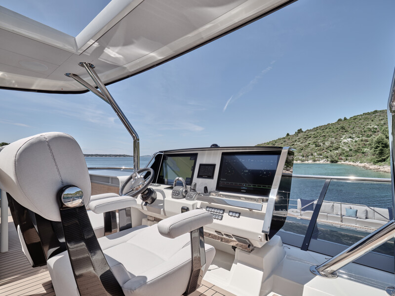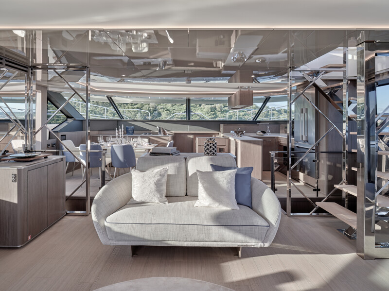 Step into a world of unparalleled well-being onboard the Prestige M8, where full-width cabins and living spaces rival those of an 85-foot monohull. The interior design exudes sophistication with high-end finishes, new materials, and a variety of colors. Entertainment spaces abound, including a spacious flybridge, a sea-oriented cockpit, a large aft terrace, an XXL forward saloon, and a cozy indoor saloon.
