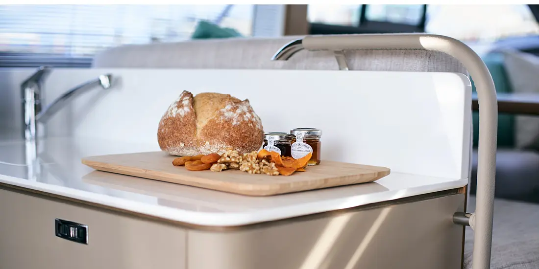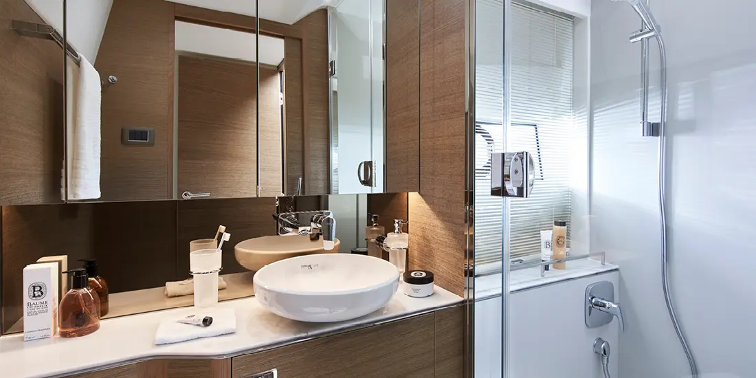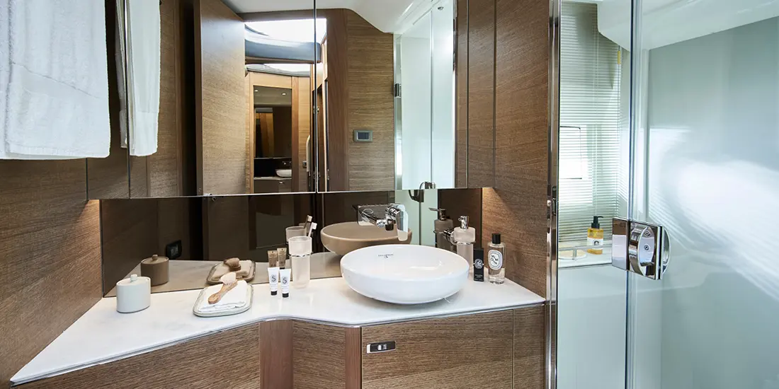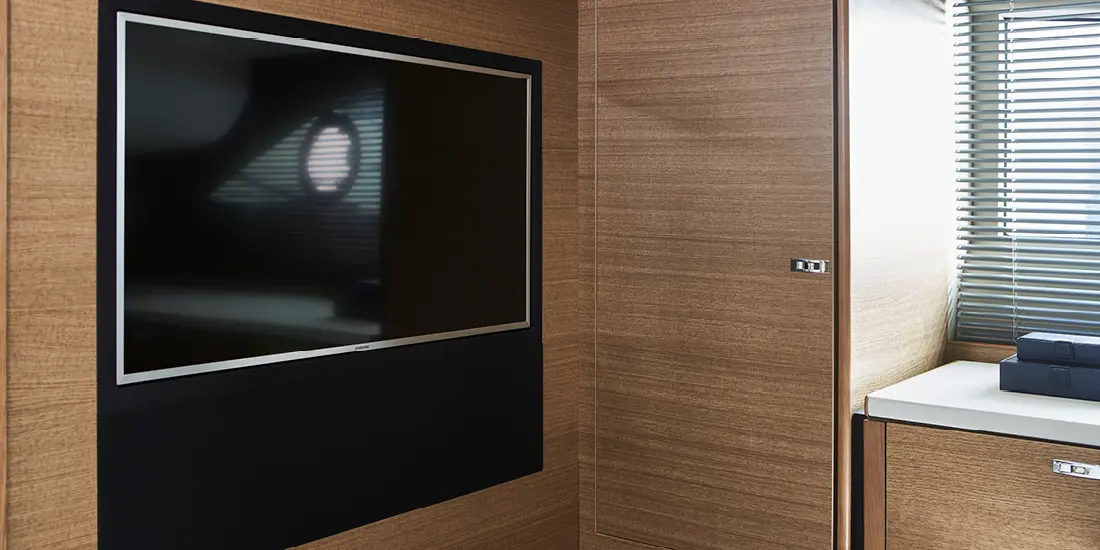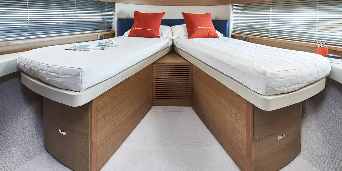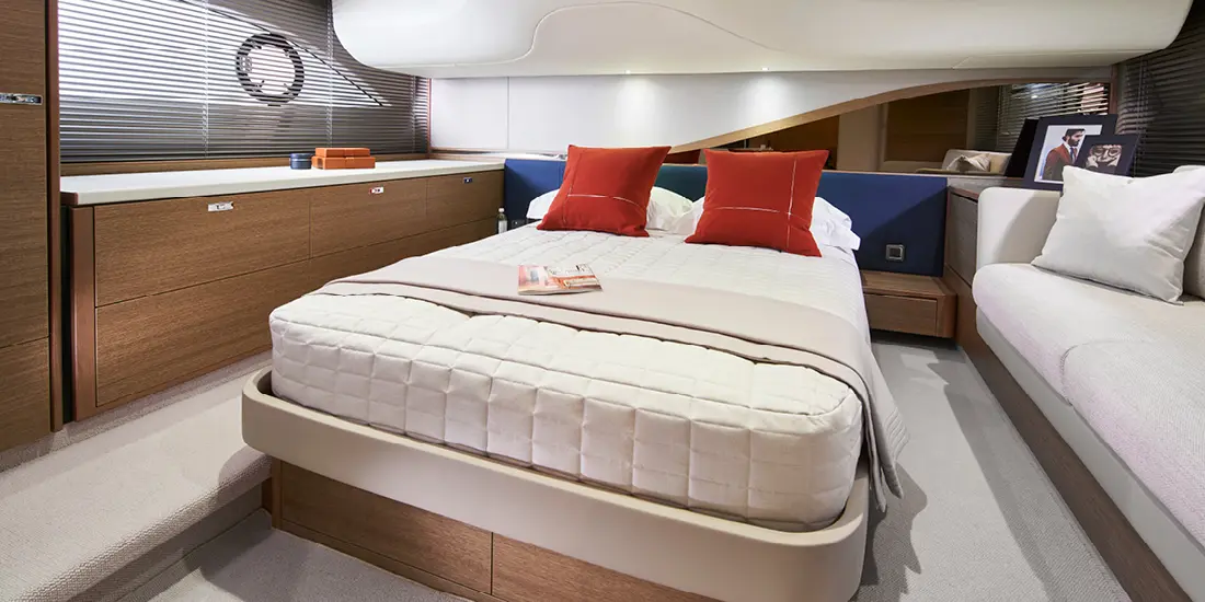 Below deck, the F45 continues to impress with a luxurious full beam owner’s cabin that exudes elegance and comfort. The forward ensuite cabin is equally impressive, showcasing a sleek and modern design that exceeds all expectations.