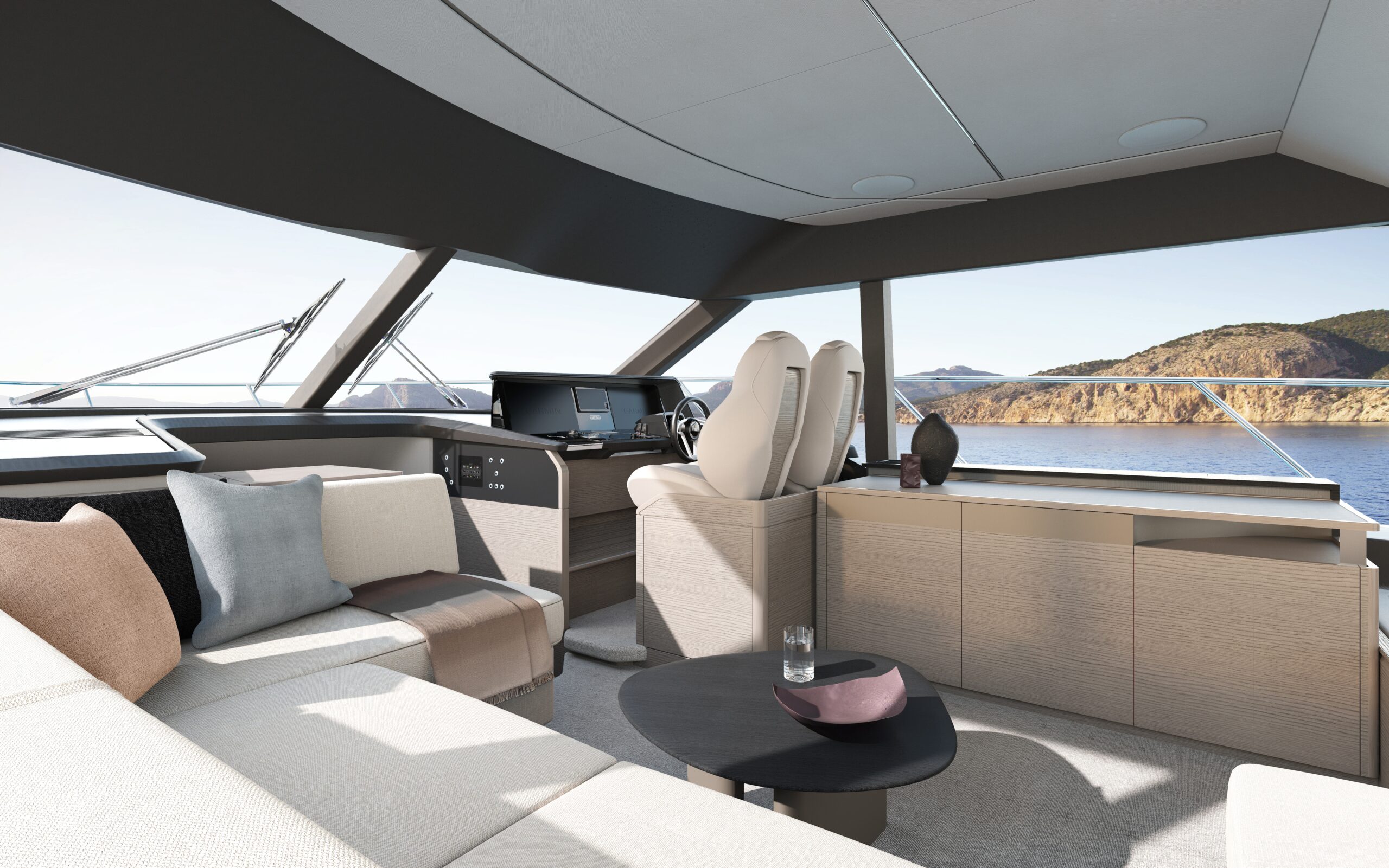 The F54’s main deck brings a unique aft galley and separate dinette, creating an open yet defined living space rarely seen in this size category. A multi-positional cockpit backrest converts seating into a sunbed or sofa, adapting to your lifestyle.
