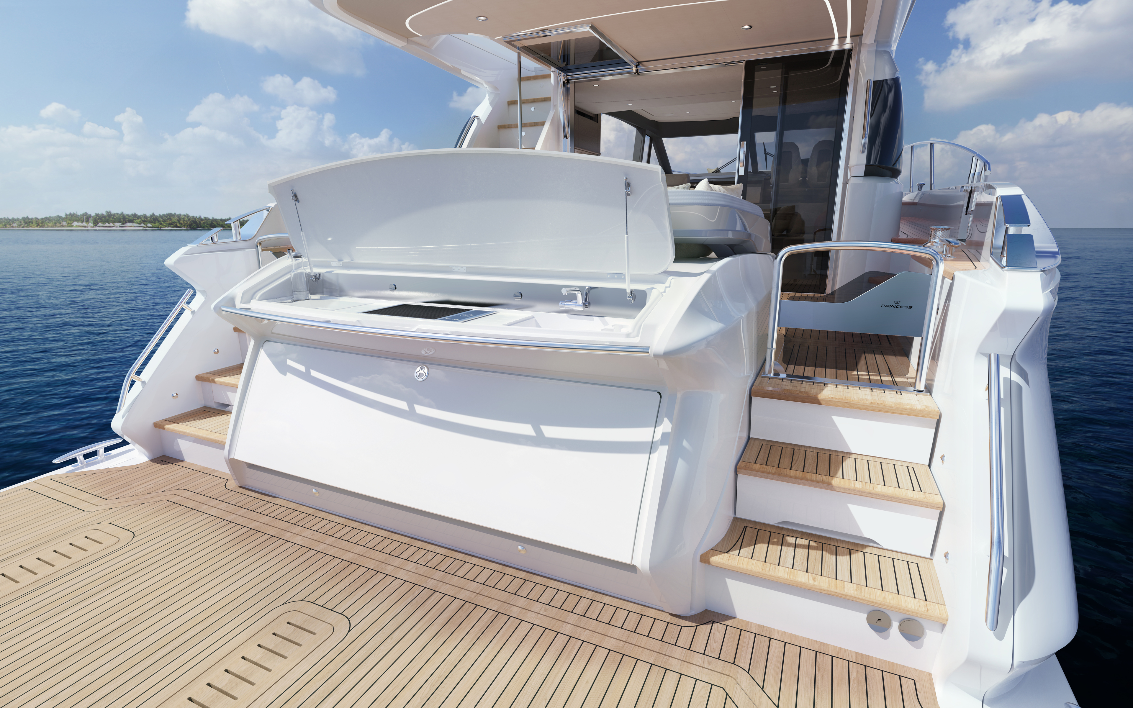 Discover the expansive outdoor decks tailored for socializing and unwinding. From the vast flybridge perfect for hosting guests, to the serene foredeck terrace ideal for relaxation, and then there is the generous cockpit that seamlessly connects to the saloon and extends to the bathing platform, offering optional seating and a barbecue for a waterside ‘beach club’ experience.