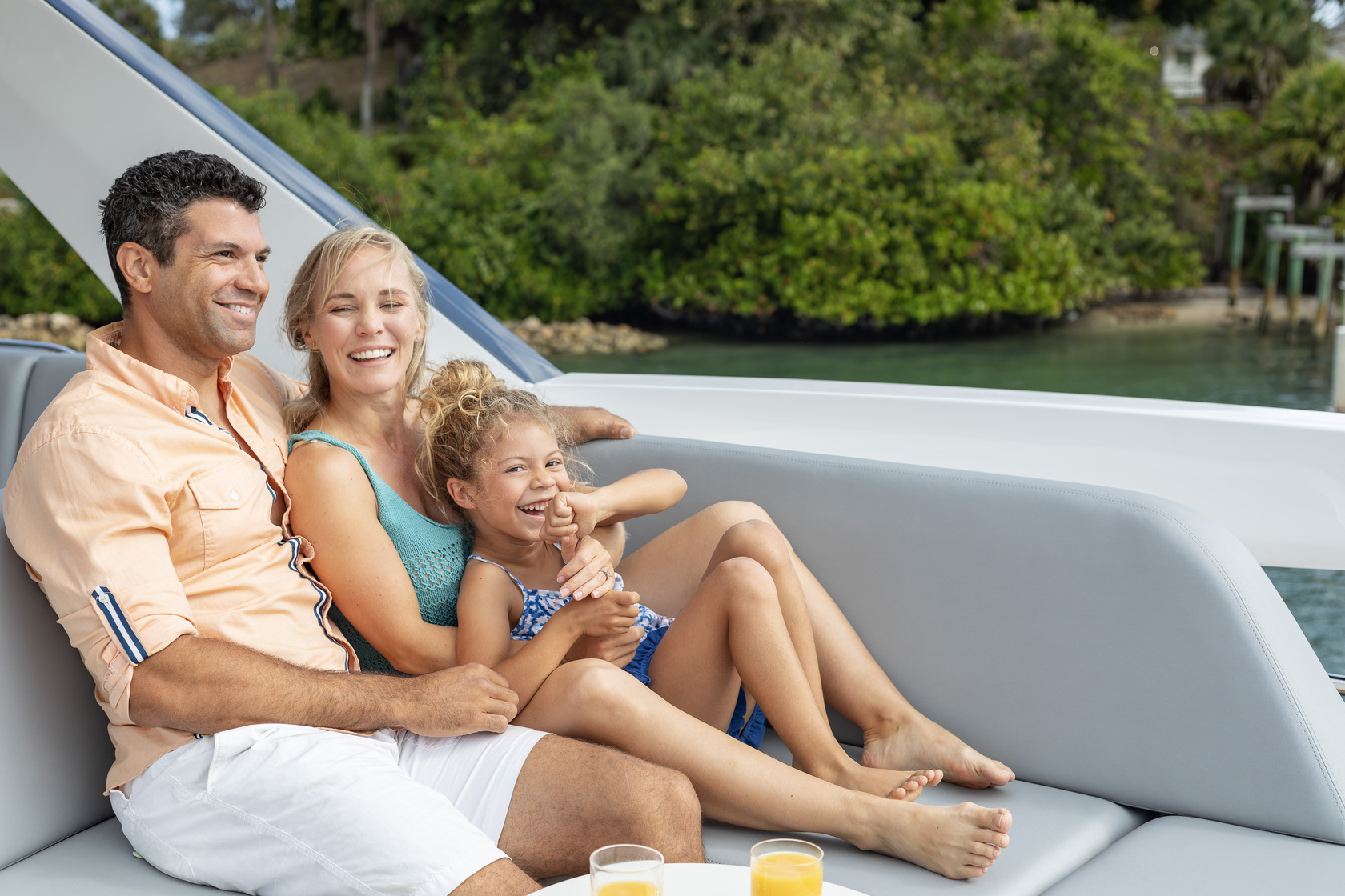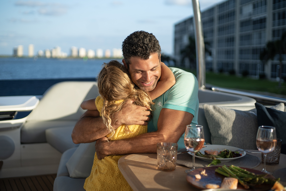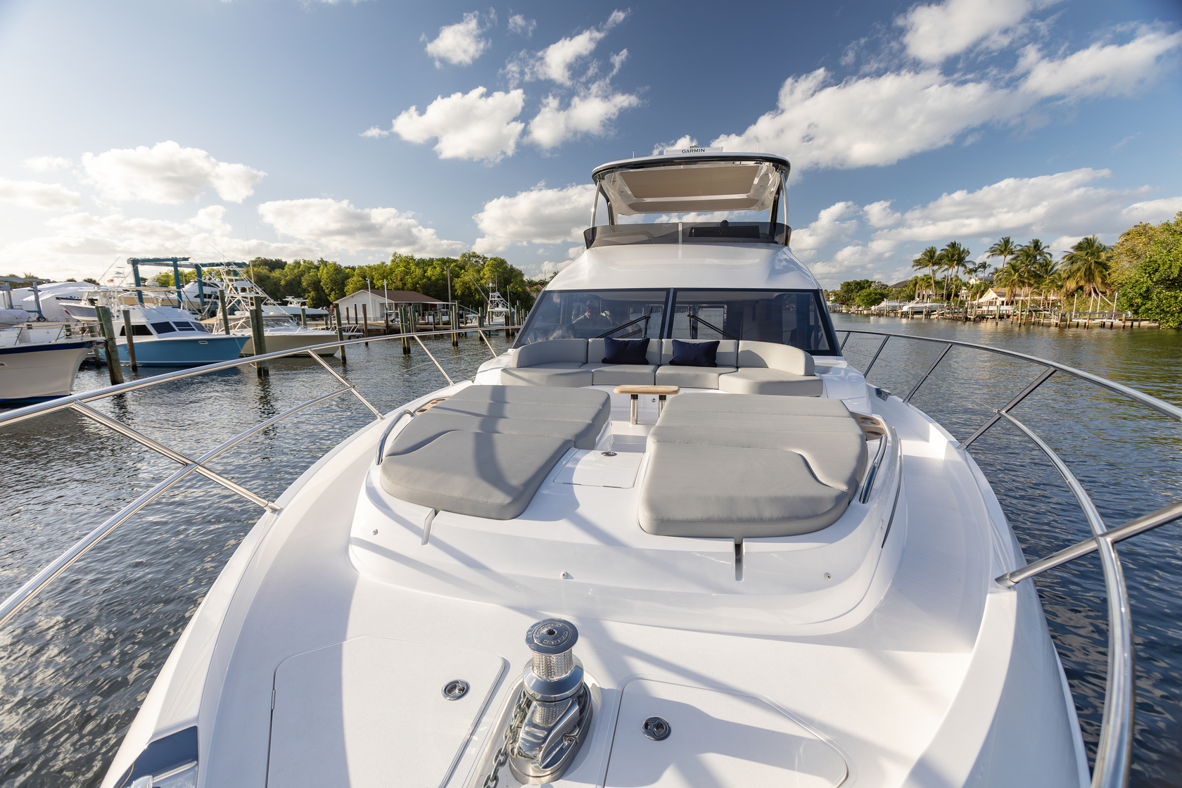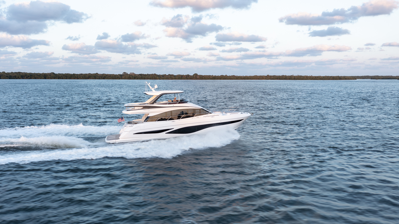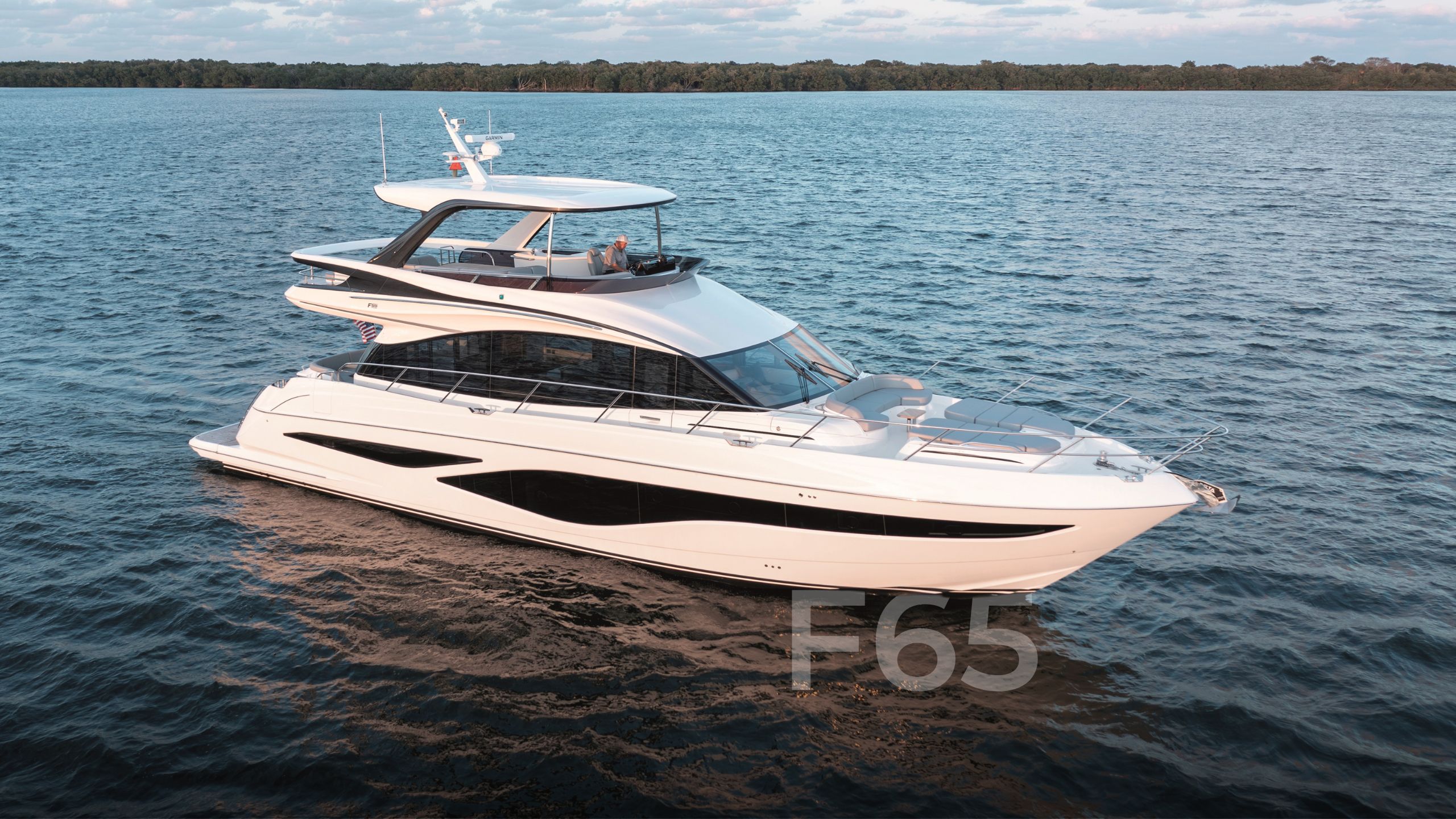 Comfort and convenience are at the forefront of the F65 interior space, with features such as plush seating, state-of-the-art entertainment systems, and luxurious staterooms. The large main deck highlights a well-appointed aft galley, dinette, a saloon with a large U-shaped sofa, and companion seating opposite the helm. Panoramic windows and signature wrap-around front screens also offer uninterrupted views, while elongated hull windows fill the area with plenty of natural light.