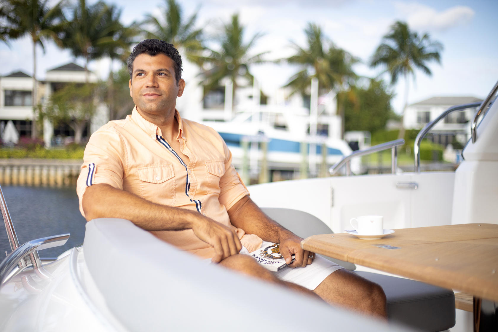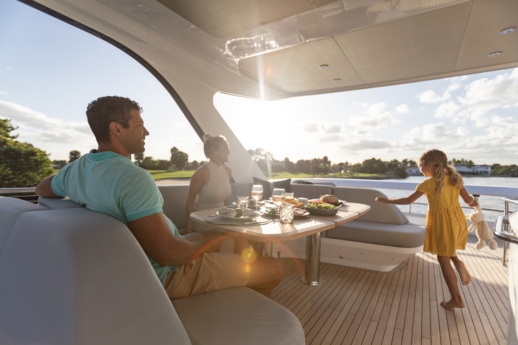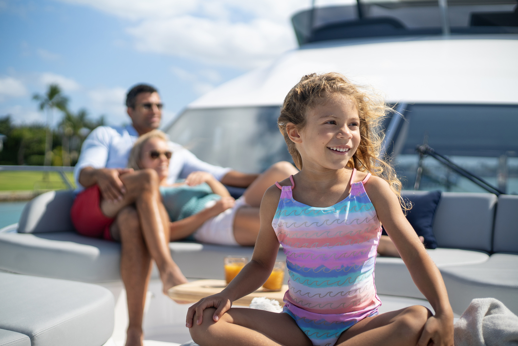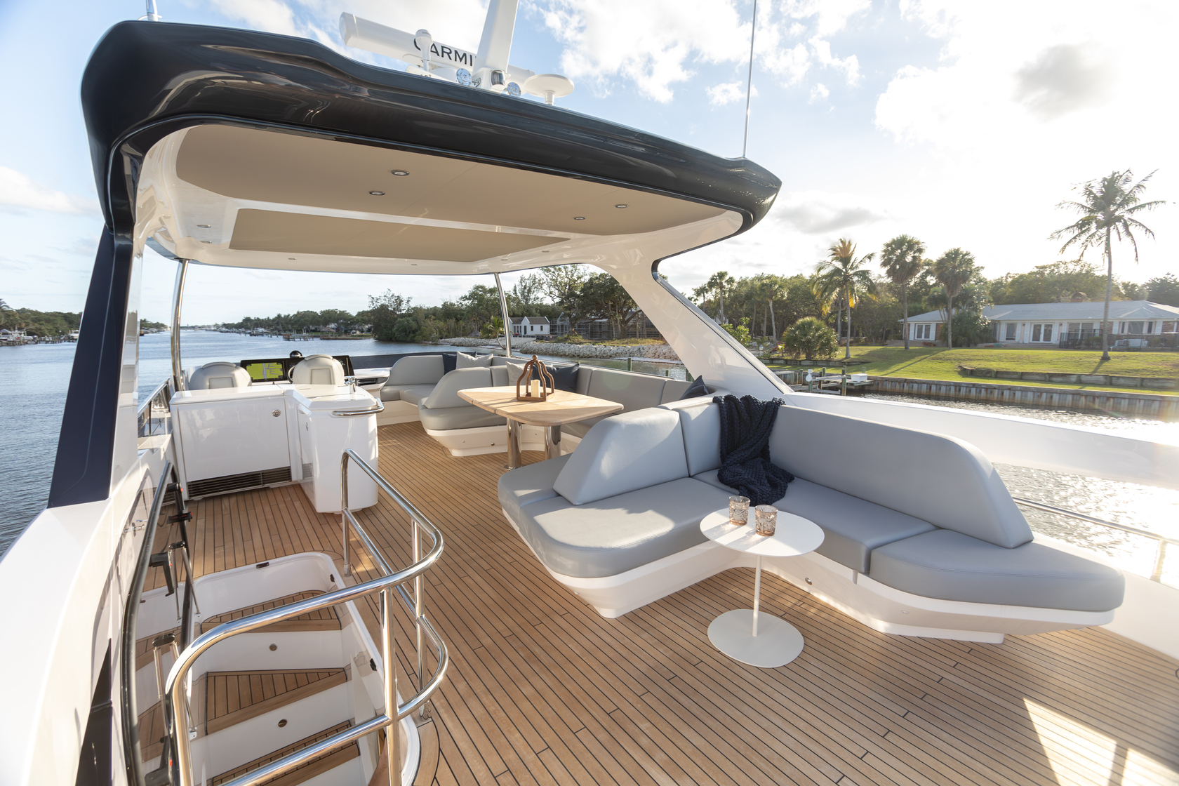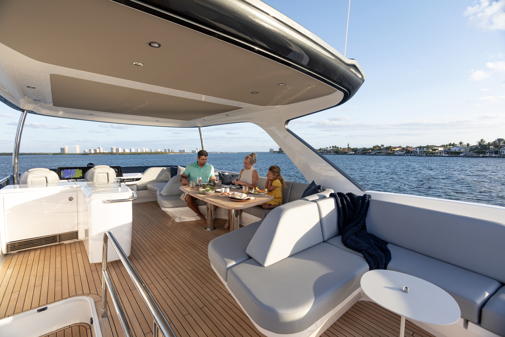 The expansive outdoor living areas include a large cockpit, flybridge, swim platform, and foredeck — providing ample space for outdoor activities and relaxation. Her modern-designed flybridge is the ideal outdoor entertaining space, with ergonomic dining seating, a wet bar with bbq, a coolbox and sink, and an aft sunbed and L-shaped companion seat.
