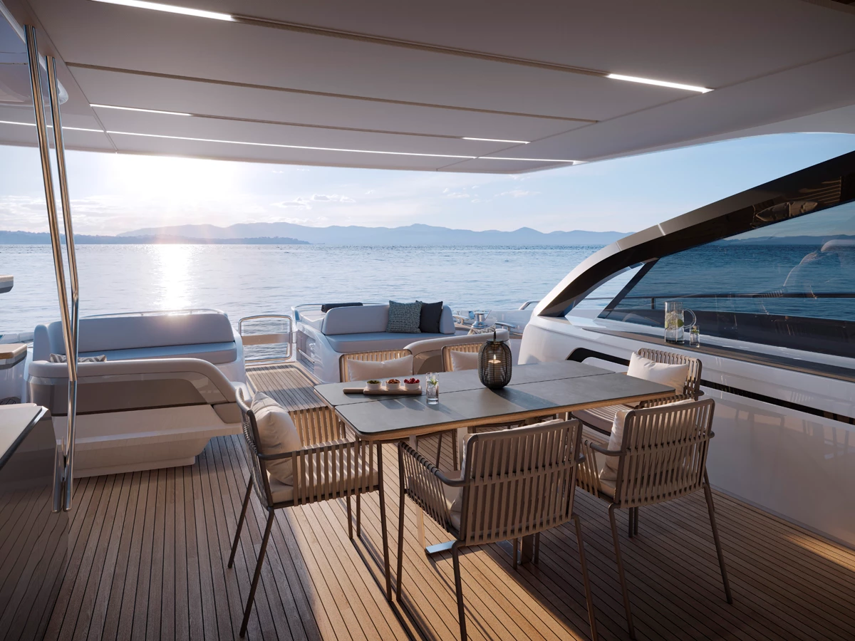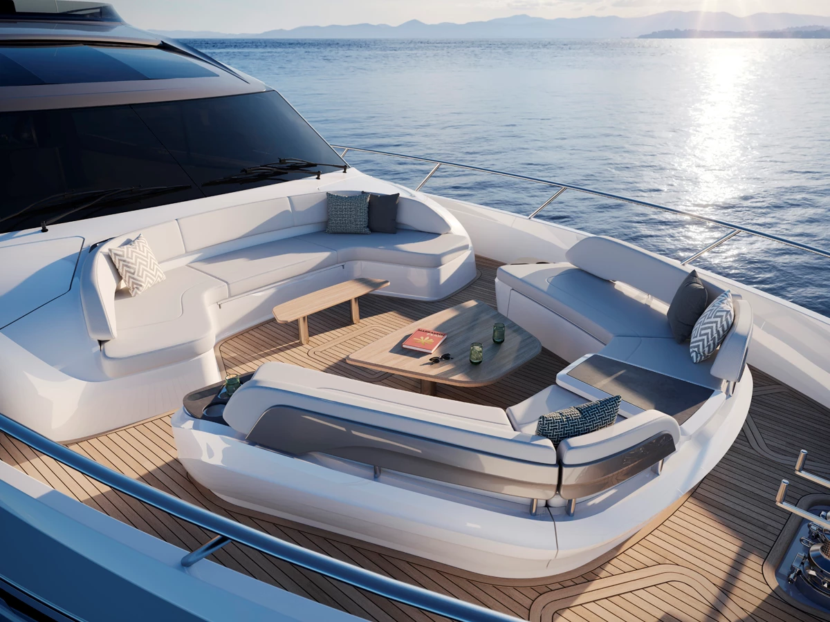The S80 Princess has a unique and versatile cockpit with flexible seating arrangements that include adjustable twin upholstered L-shaped seats, outboard and forward-facing seating alongside twin coffee tables, and twin aft sun pads.