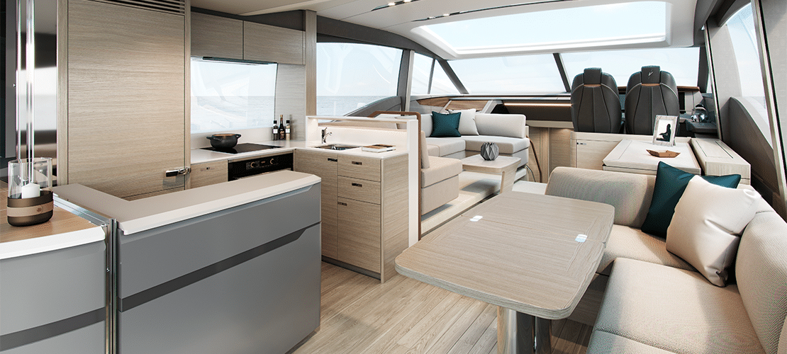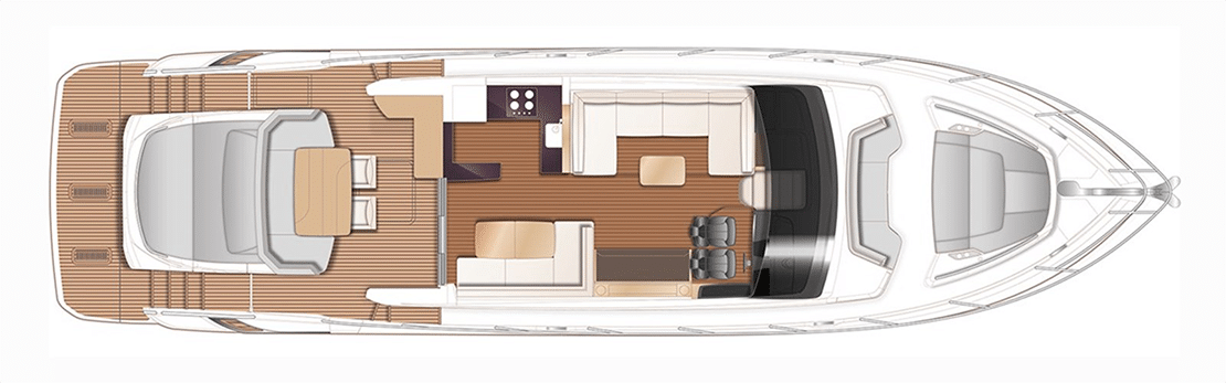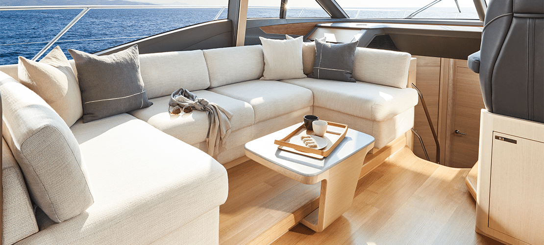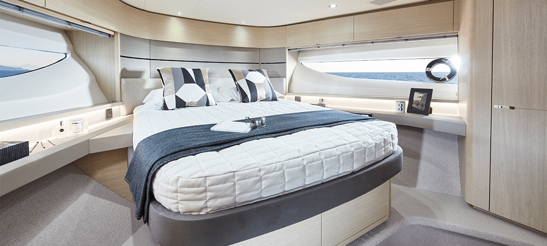 From any angle, the Princess V60 is a looker. Graceful lines adorn her sides from bow to stern, punctuated by long, tapered windows that give her interior, bright splashes of natural light. On the main deck, a sunbed and curved seating populate her generous bow, allowing numerous guests the opportunity to share wind, waves, and the laid-back vibe that permeates this vessel.