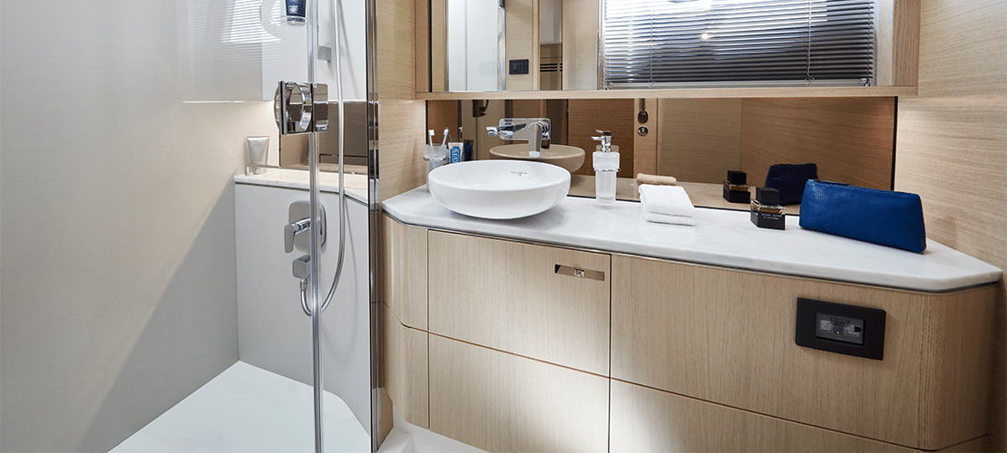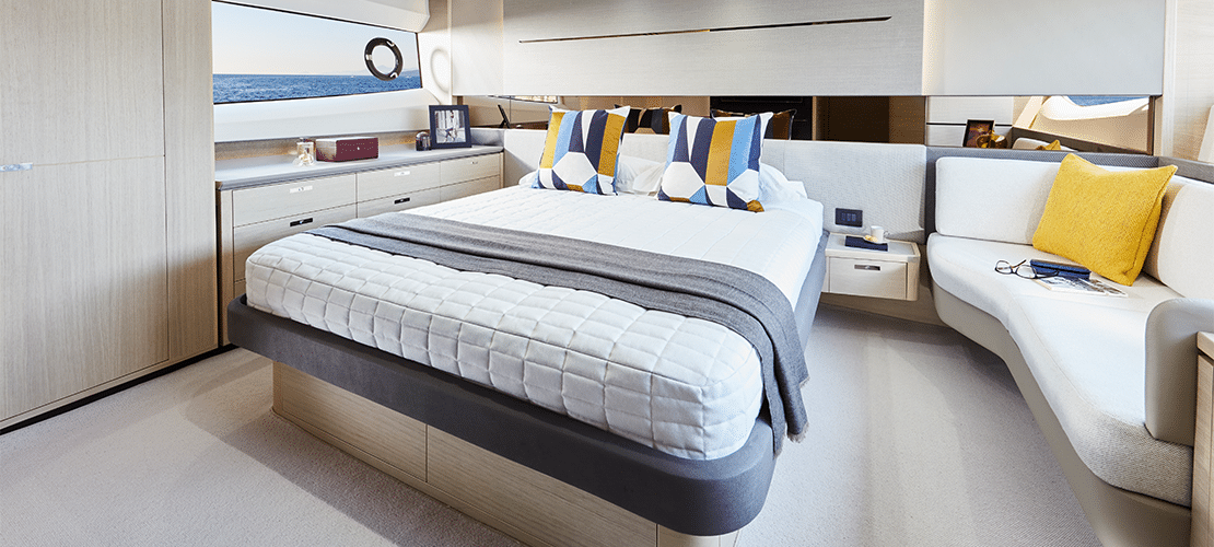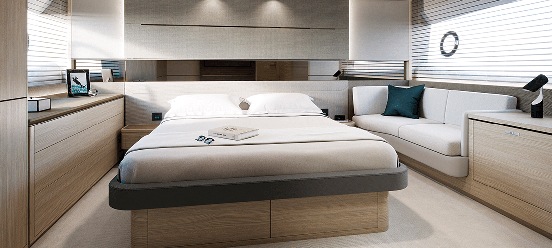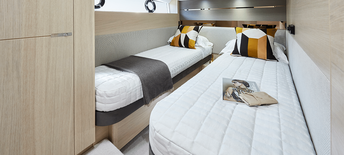 The forward stateroom also has a large double bed and en-suite bath, and the two single beds in the starboard guest cabin can be converted to a double bed via an optional powered sliding conversion package.