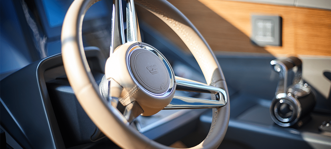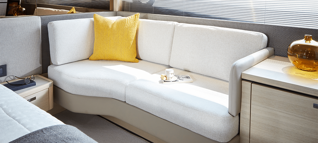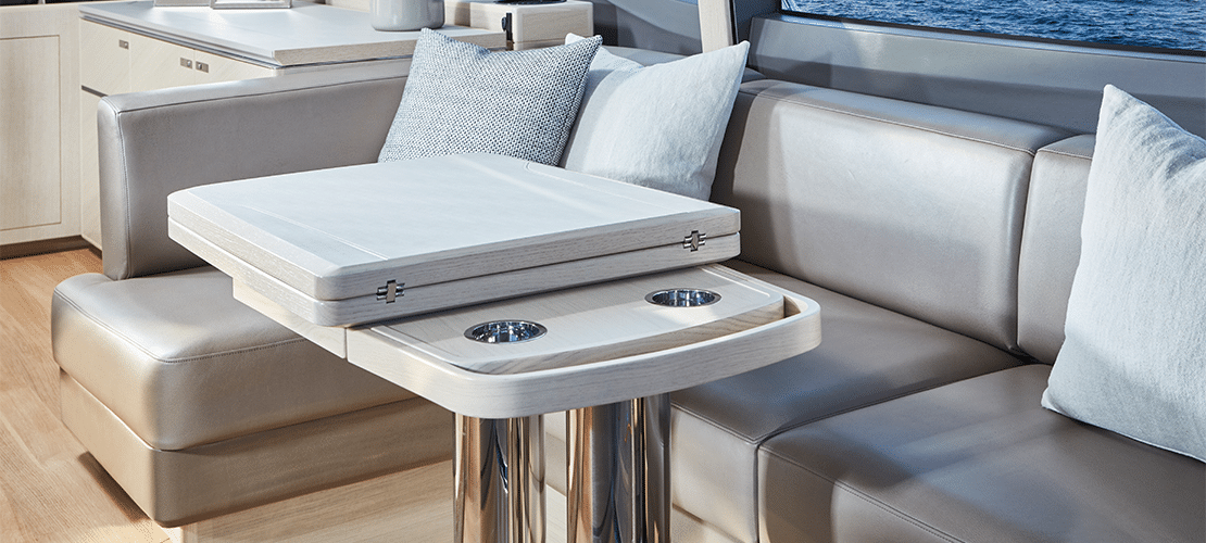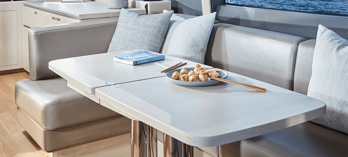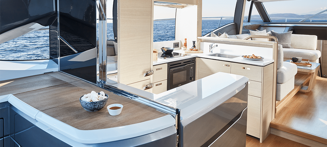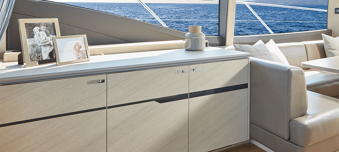 Timber decking stretches throughout the helm and salon, highlighting oak or walnut cabinetry and settees and pillows covered in high-quality upholstery fabrics. A 49-inch LED TV can be raised and lowered electronically, so it’s out of the way when not in use. A DVD player, radio, and MP3 player plug into a surround sound system so everyone on deck can enjoy the most modern entertainment. A sideboard presents glass and bottle storage and a refrigerator to keep chilled drinks and snacks handy. The roof slides open at the touch of a button to let gentle breezes cascade throughout the cabin.