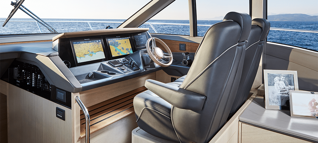 The helm seats two comfortably before a state-of-the-art navigation system that includes color radar, GPS and chart plotter, autopilot, high-speed magnetic compass, echo sounder with alarm, speed and distance log, and VHF/RT. Controls for the bow thruster, anchor winch, trim tabs, bilge pump, and windscreen wipers are within easy reach.