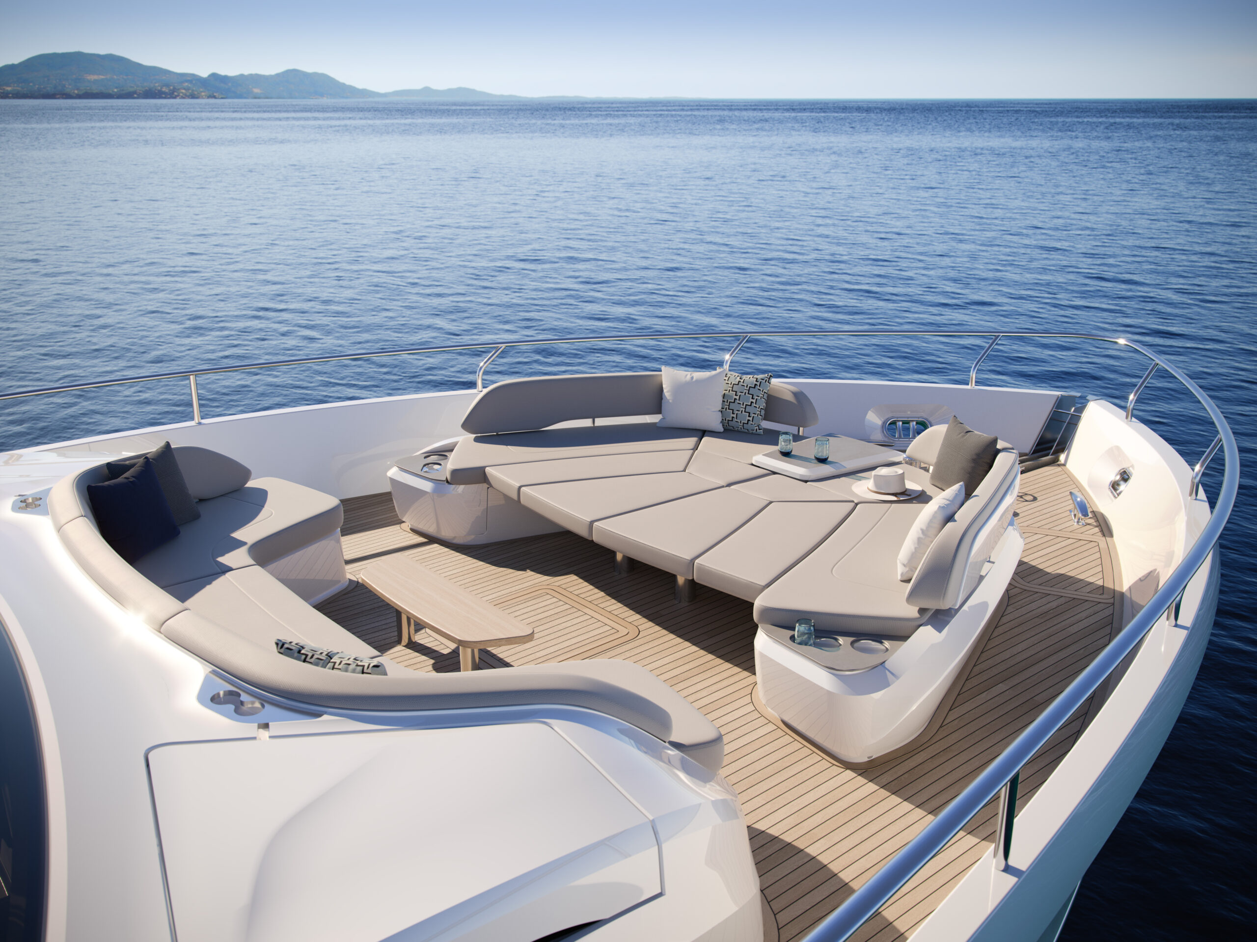 The foredeck of the Princess Y80 beckons with its dual personality – a tranquil hideaway to while away the afternoon or a stylish space to entertain guests with cocktails. Its conversational seating area accommodates up to 10 people, with adaptable U-shaped seating that easily transforms into a spacious sunpad.