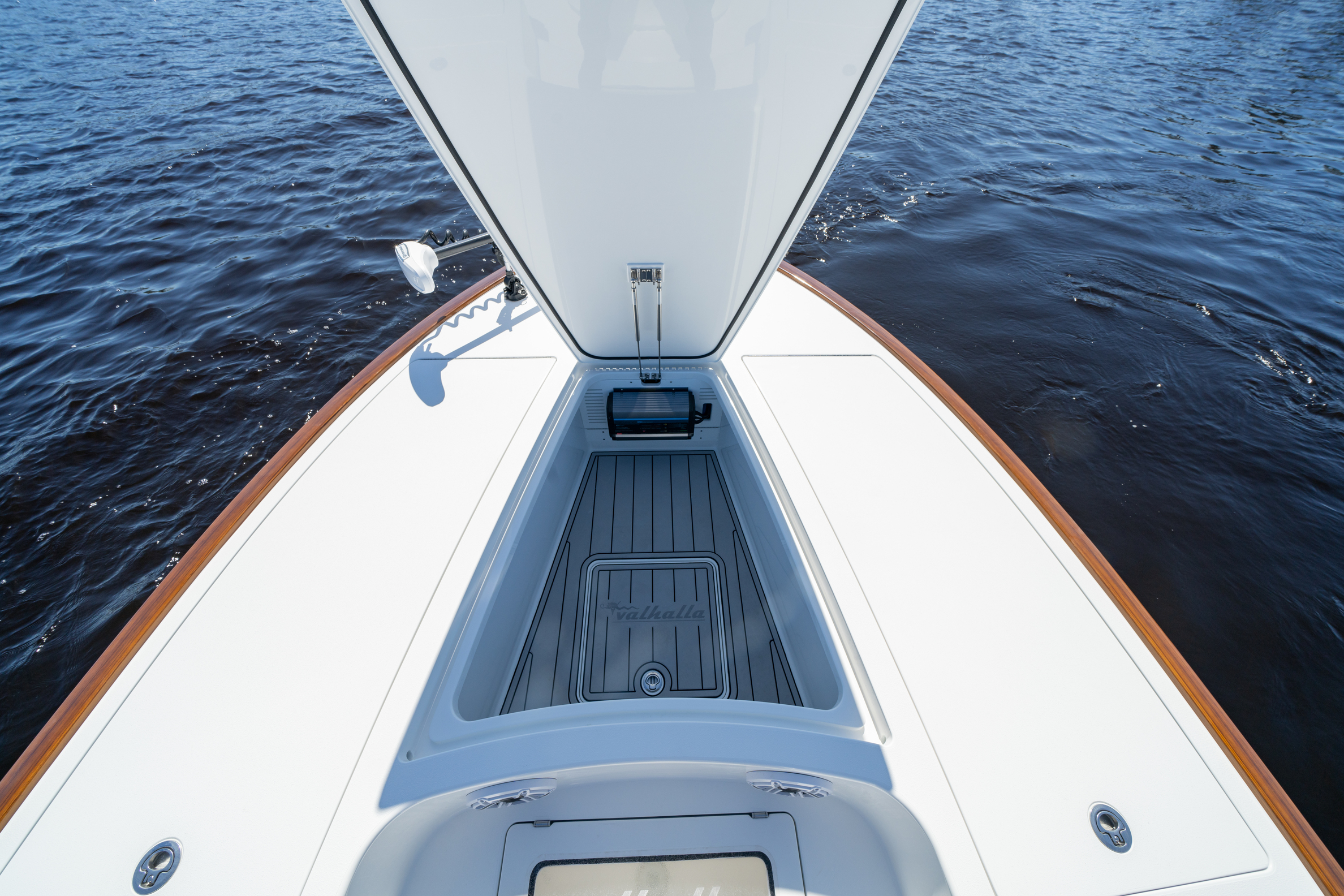The Valhalla V-28 Bay helm offers premium equipment choices, including dual 19″ MFDs or a single 24″ MFD from Garmin and Simrad. It also features backlit labeled Bocatech switches, a durable fiberglass helm pod, a convenient port glove box with a 12V and USB outlet, and paddle switches on the steering column for jack plate and engine trim control. Optional enhancements like a hardtop or stand-on console 2nd station helm for sight fishing are available.