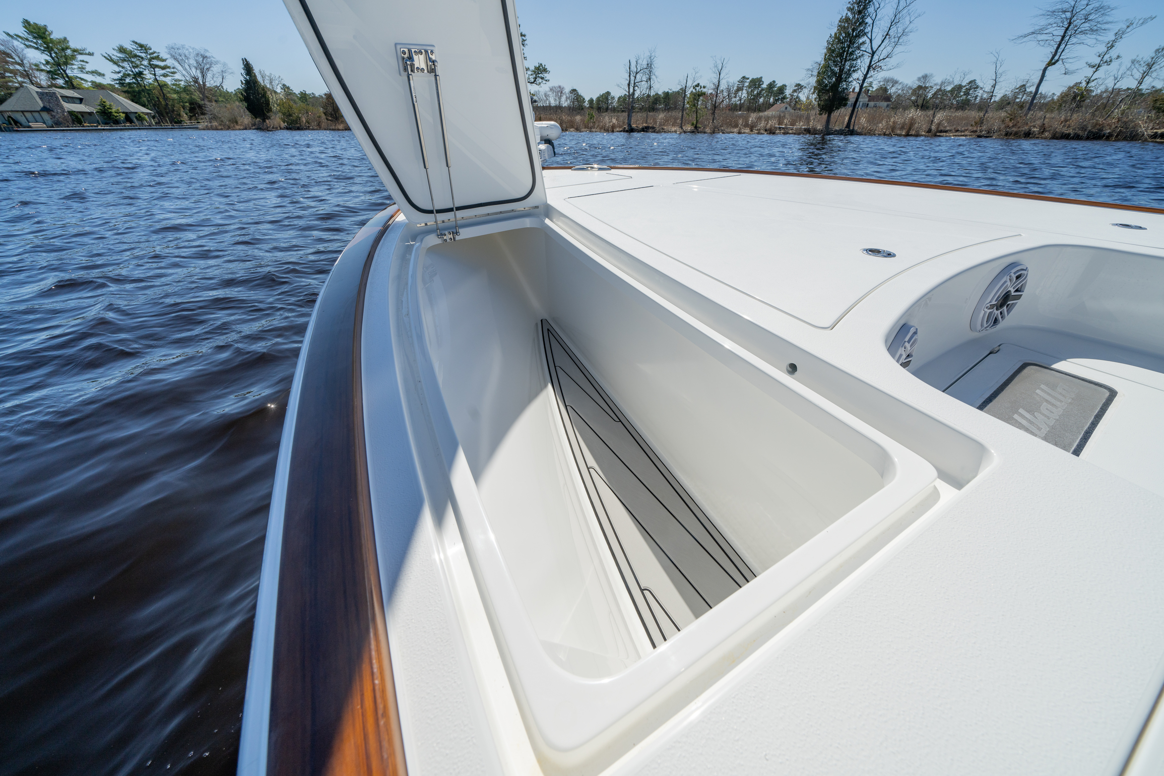 Anglers will be delighted by the V-28’s abundance of lockable rod storage options. With up to four rod lockers under the bow casting deck, you can safely store up to six rods up to 7′ in length in the aft lockers, and up to ten rods up to 9′ fly rods in the forward lockers. This design ensures that you have plenty of space for your fishing gear without sacrificing room for other essentials like tackle and cleaning supplies.