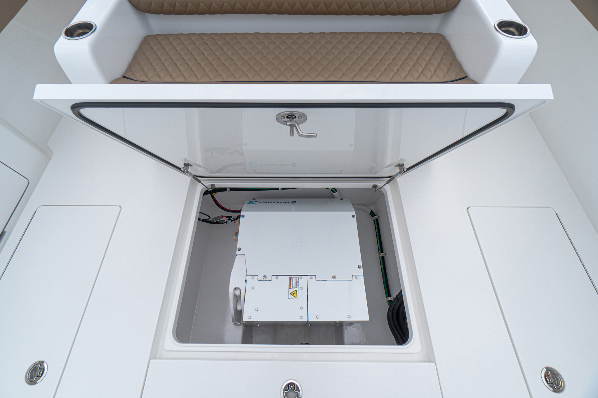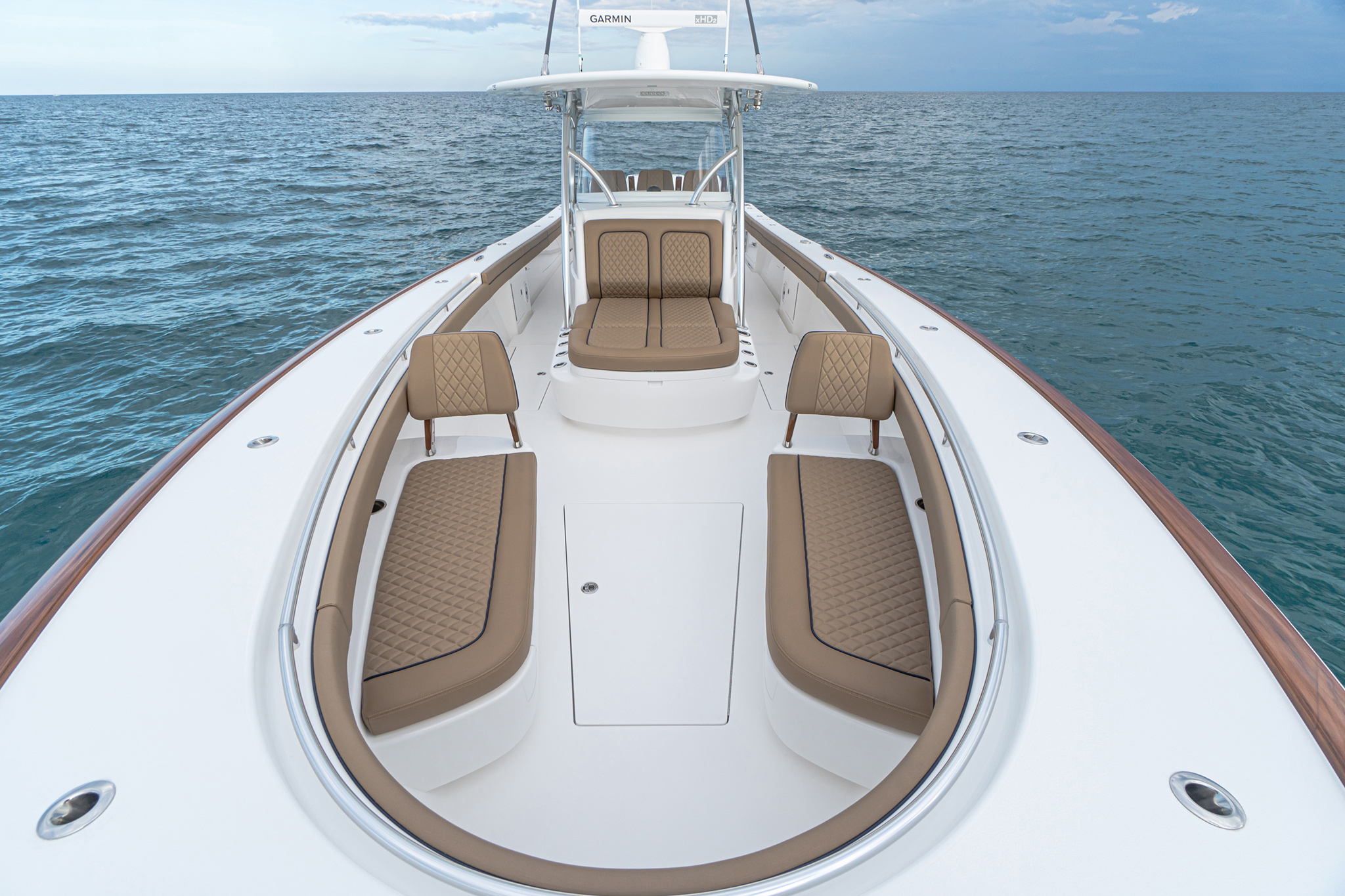 While the V-41 Valhalla is undoubtedly a fishing machine, it also offers a luxurious experience as a tender or sport cruiser. Its deck layout options include an aft mezzanine seating module with armrests and an insulated cooler or live well beneath the seat. Forward seating with backrests, an anchor windlass, a port-side dive door, and additional cup holders make for comfortable day cruising.