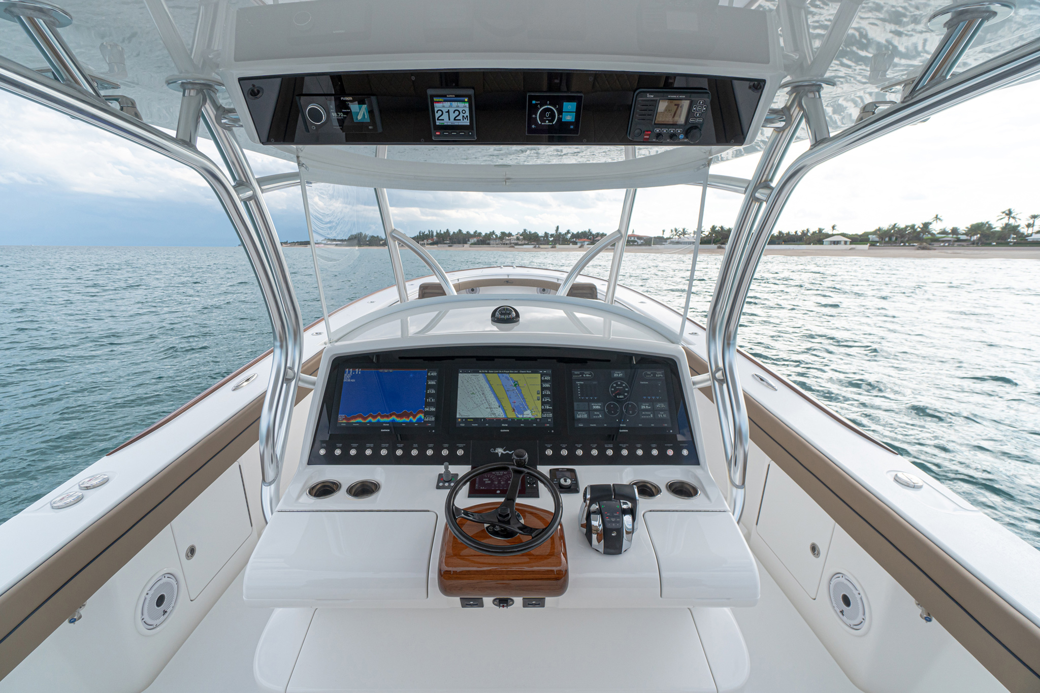 The V-41 Valhalla is a high-performance center console with options for quad or triple power setups, including Mercury 400s, 450Rs, or 300s, and Yamaha 425s. Joystick helm control with GPS station-keeping is available for all engine configurations.
