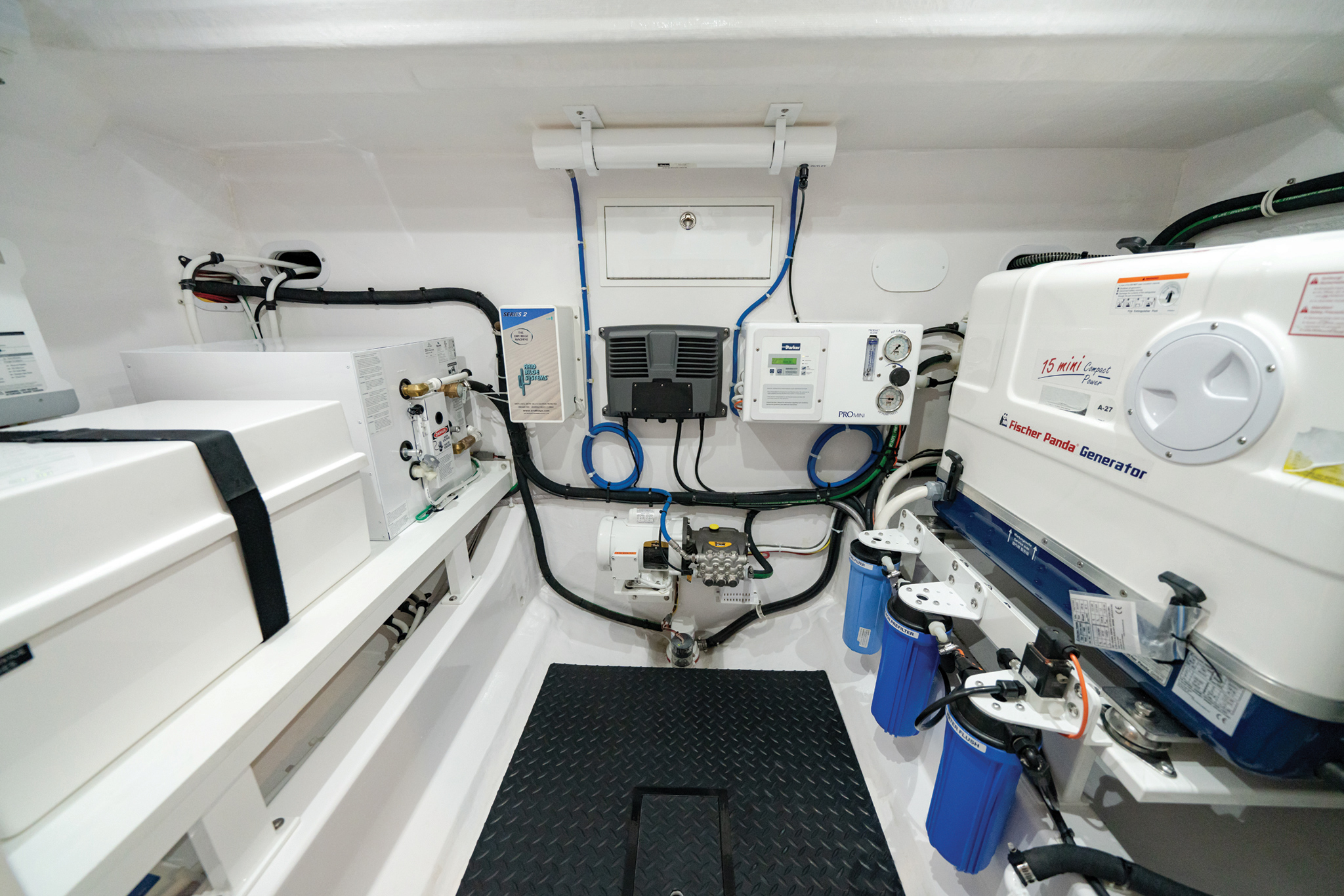The fishing features of the Valhalla V-55 include twin insulated fish boxes located on either side of the centerline Seakeeper hatch, easily accessible in the impeccably finished white gelcoat lazarette. This vessel excels in a range of activities, from offshore tournaments to leisurely cruises. Boasting a 1,200-gallon fuel capacity and an efficient electric fuel management system, the V-55 provides unmatched power and reliability. The streamlined helm layout ensures excellent visibility, safeguarded by a ProCurve glass enclosure.