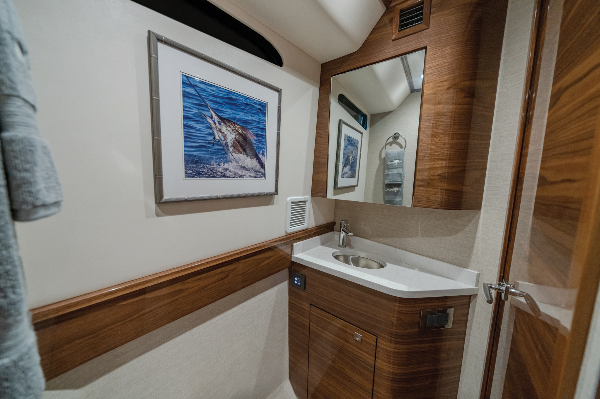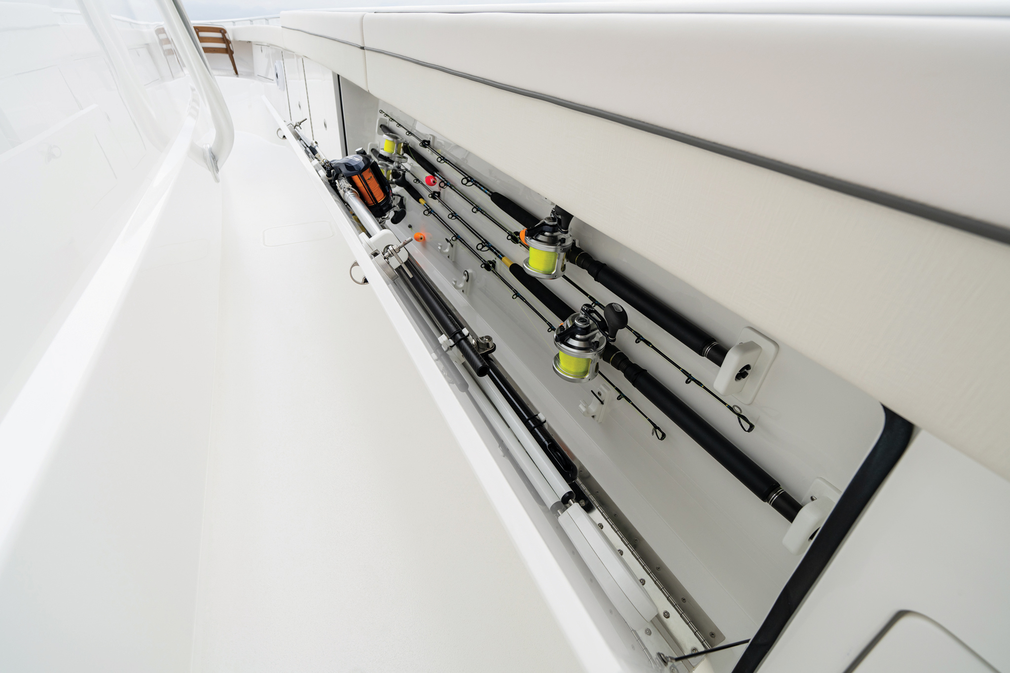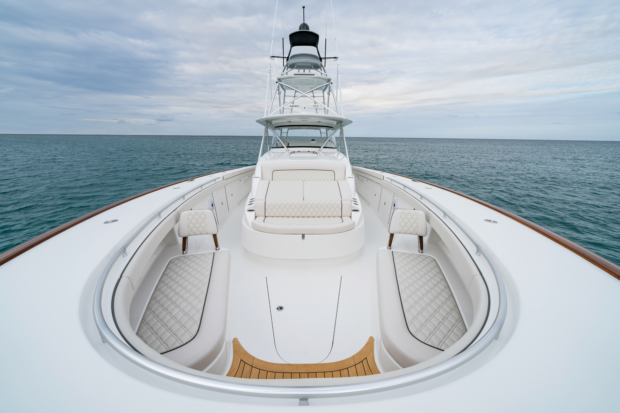 The V-55 boasts meticulous fit and finish, with hatches designed for optimal functionality. Doors and lids are gelcoat-finished using Light Resin Transfer Molding, and top-shelf Gemlux hardware is used throughout. Taking advantage of Viking’s vertical integration, the V-55 offers customizable tower options and a range of fishing and navigational features. Factory-installed electronics packages from Garmin or Simrad are available, with custom installations from Viking subsidiary Atlantic Marine Electronics also offered.