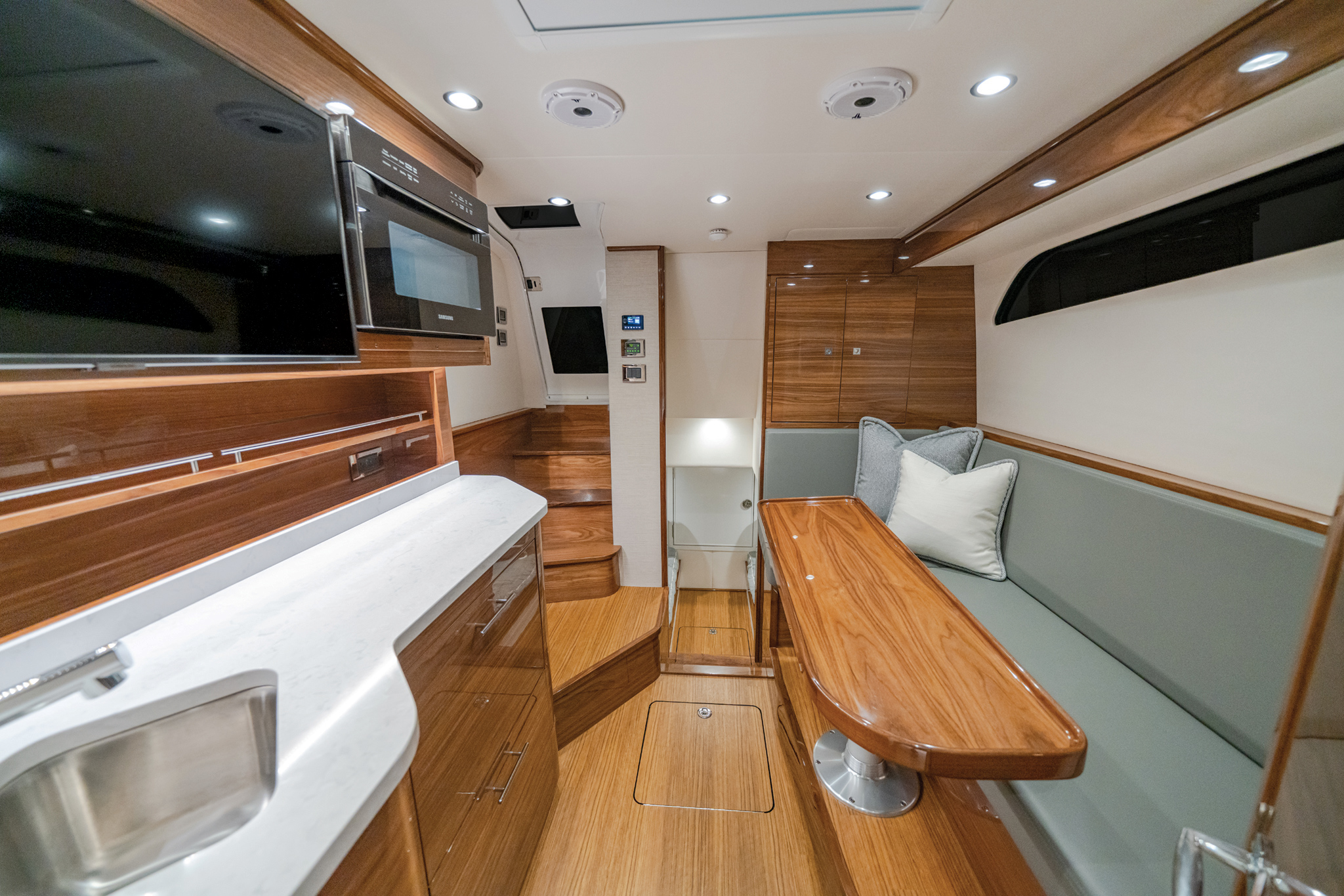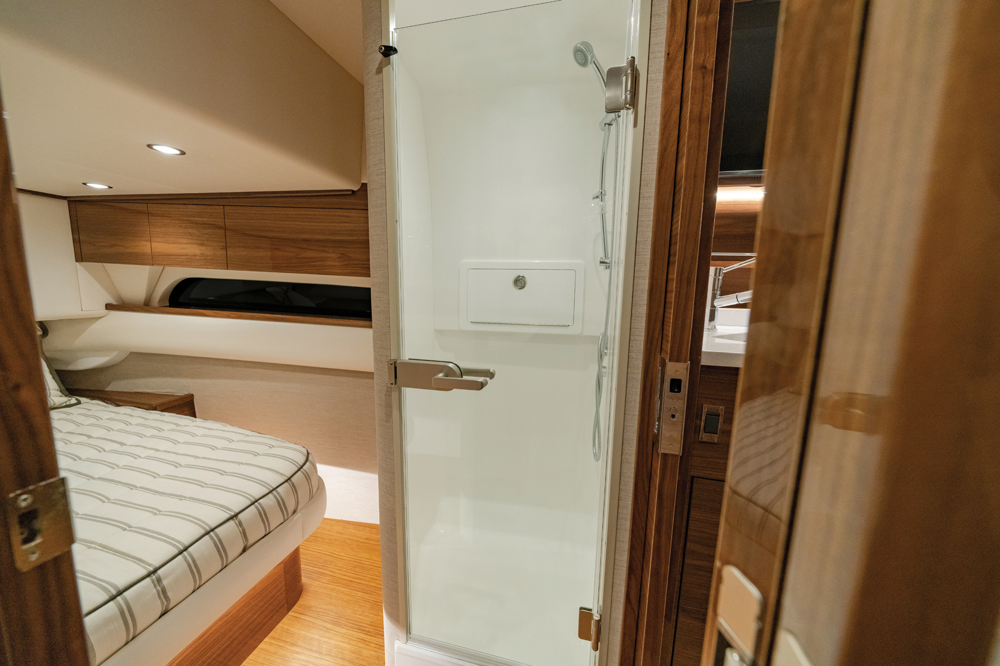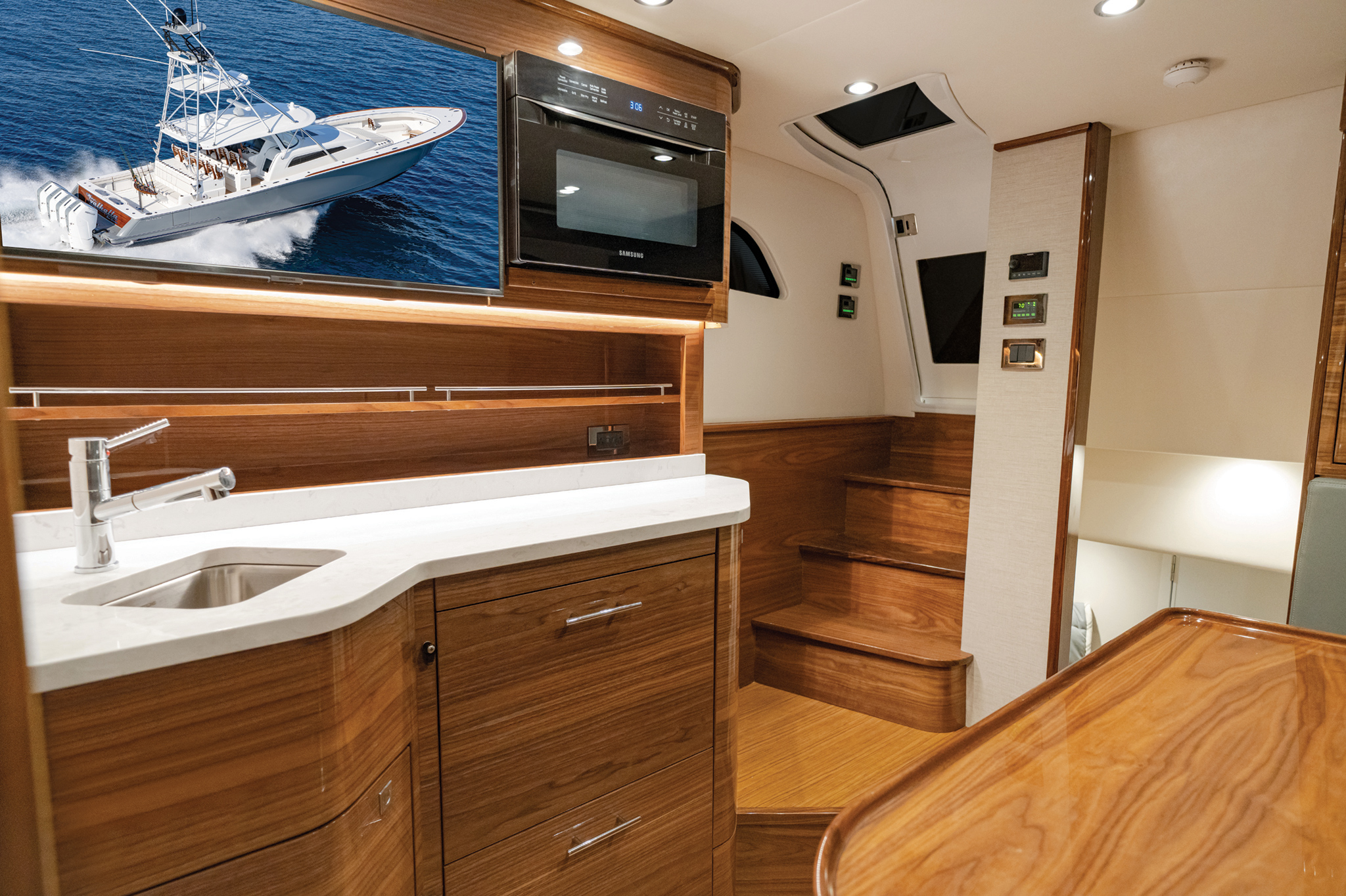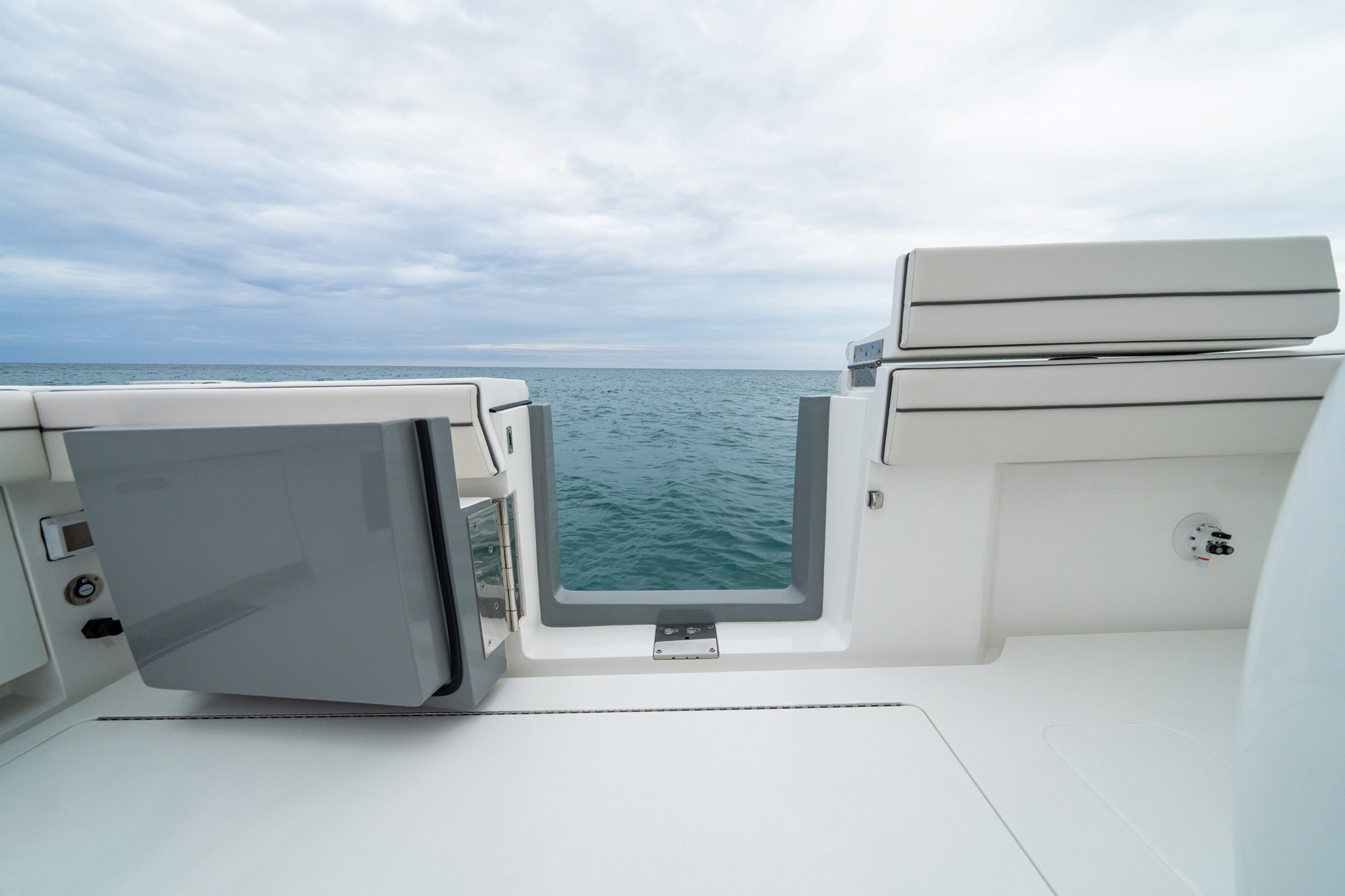 The V-55 boasts meticulous fit and finish, with hatches designed for optimal functionality. Doors and lids are gelcoat-finished using Light Resin Transfer Molding, and top-shelf Gemlux hardware is used throughout. Taking advantage of Viking’s vertical integration, the V-55 offers customizable tower options and a range of fishing and navigational features. Factory-installed electronics packages from Garmin or Simrad are available, with custom installations from Viking subsidiary Atlantic Marine Electronics also offered.