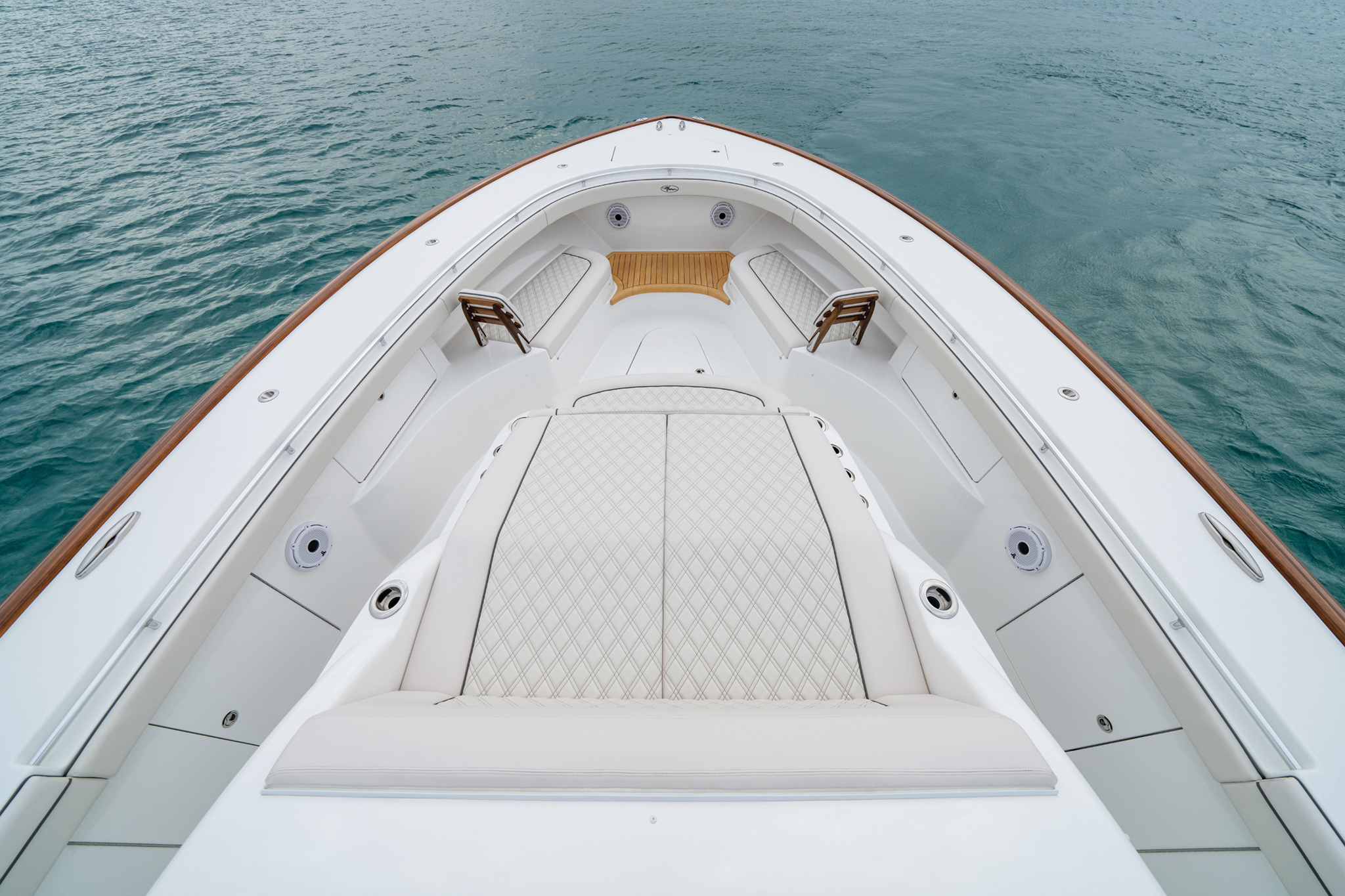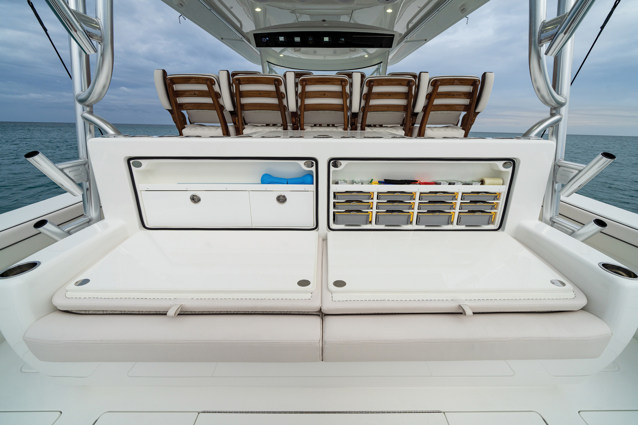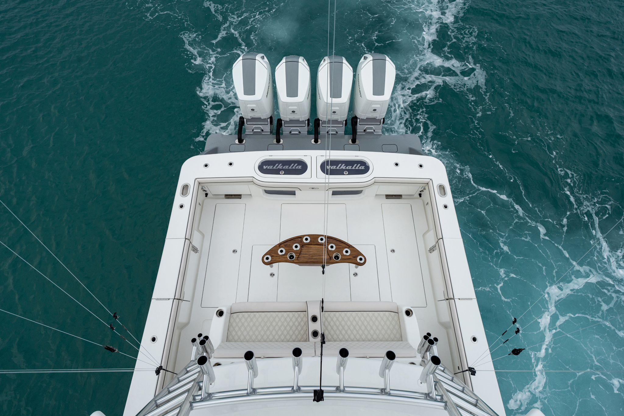 The Valhalla V-55 boasts dual rows of luxurious forward-facing seating under the sleek hardtop, complete with fiberglass seating modules perched on an elevated teak platform. The second row offers convenient refrigerated drink boxes and cozy footrest areas, with the flexibility for various seating arrangements. Expansive side decks guide you to the bow, where additional seating and a versatile convertible bow table await, offering a multitude of relaxing options for your enjoyment.