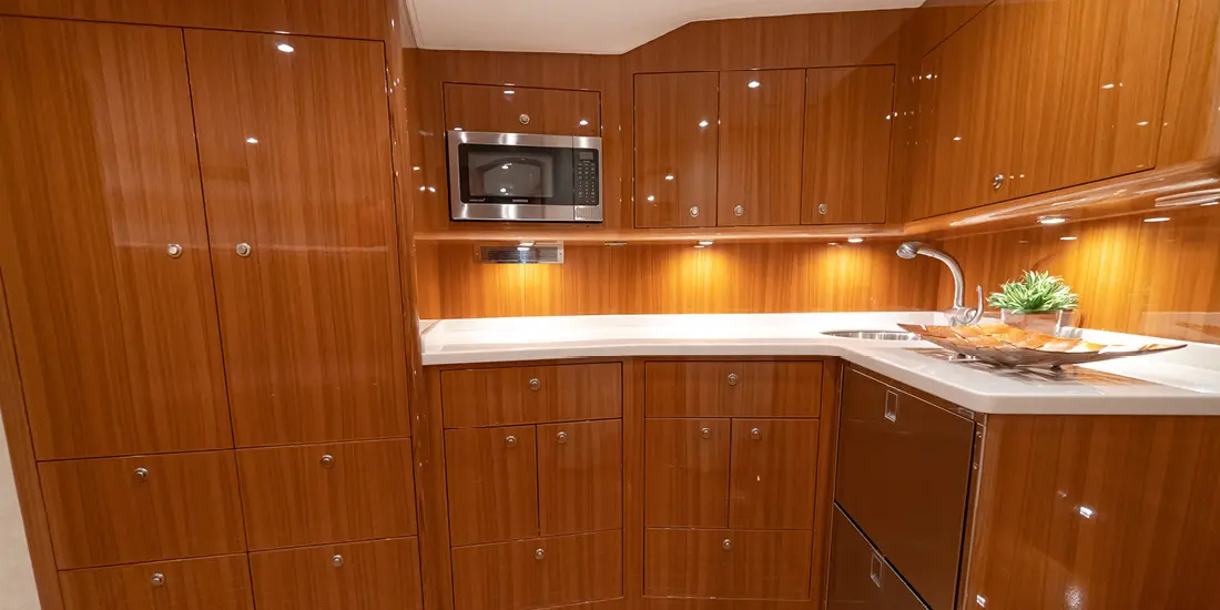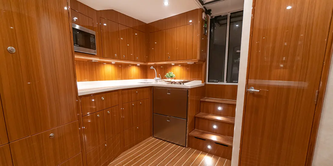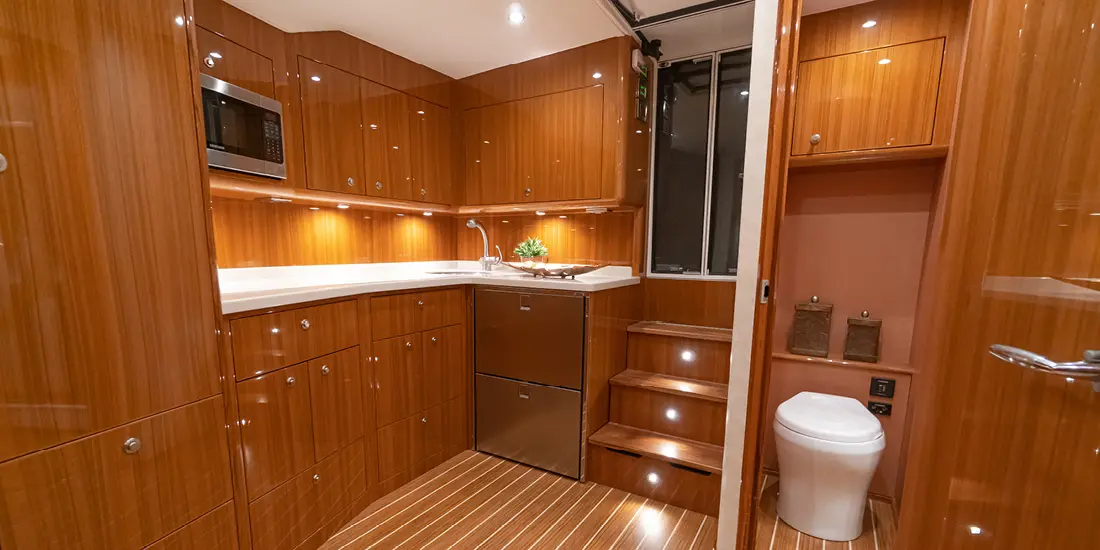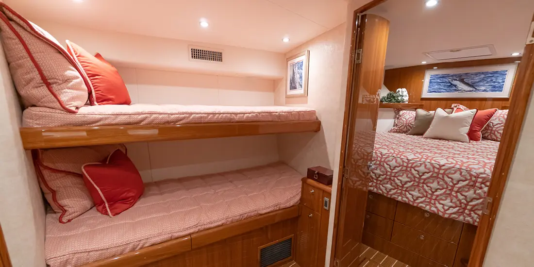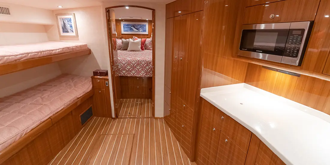 The practical cabin of the Viking 46 Billfish boasts a fully equipped galley with premium appliances and abundant storage. Unwind in the cozy sleeping areas adorned with luxurious bedding and gentle lighting for a tranquil night’s rest. The 46 Billfish also features a private head, offering a generous shower and upscale fixtures for your ultimate comfort.