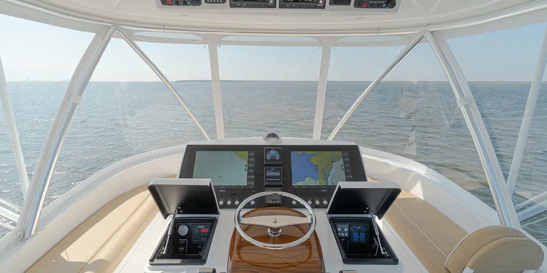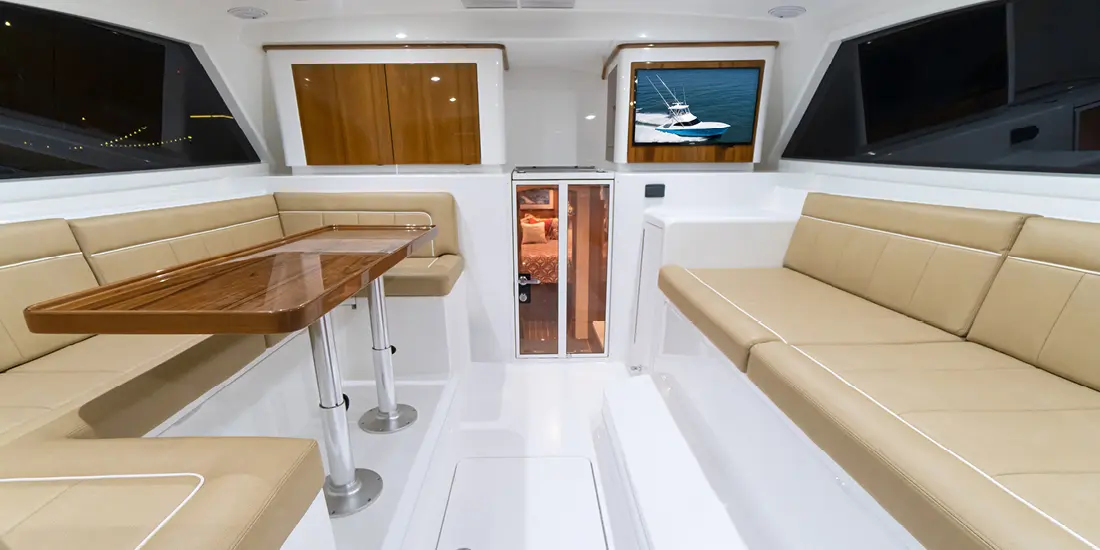 The spacious cockpit of the 46 BF provides ample room for your crew or family, while offering convenient features such as bait freezers, fish boxes, rod holders, and tackle storage. Enclosed and climate-controlled, the command deck transforms into a cozy living space with seating and rod storage, making it a comfortable and inviting environment for all aboard.