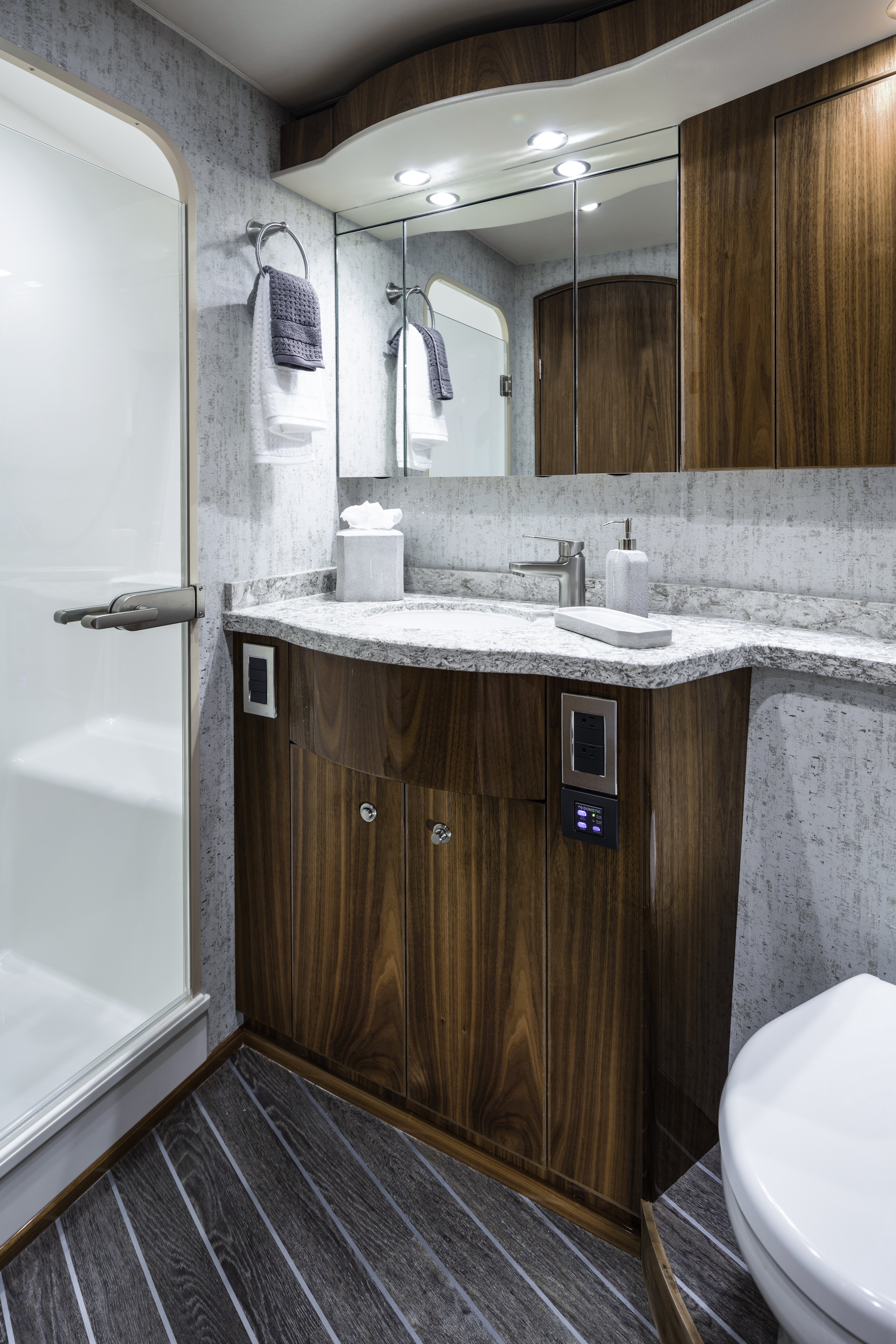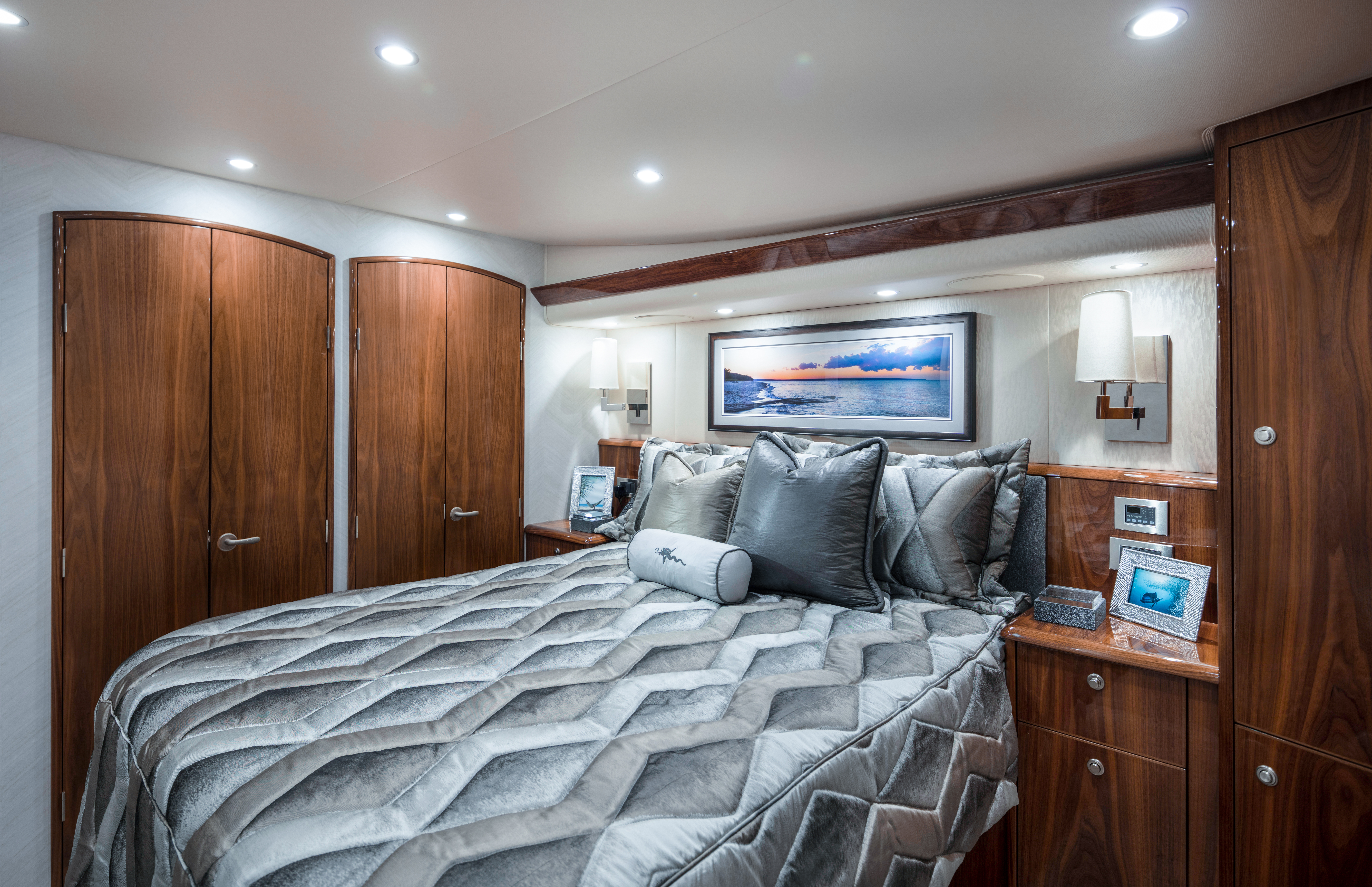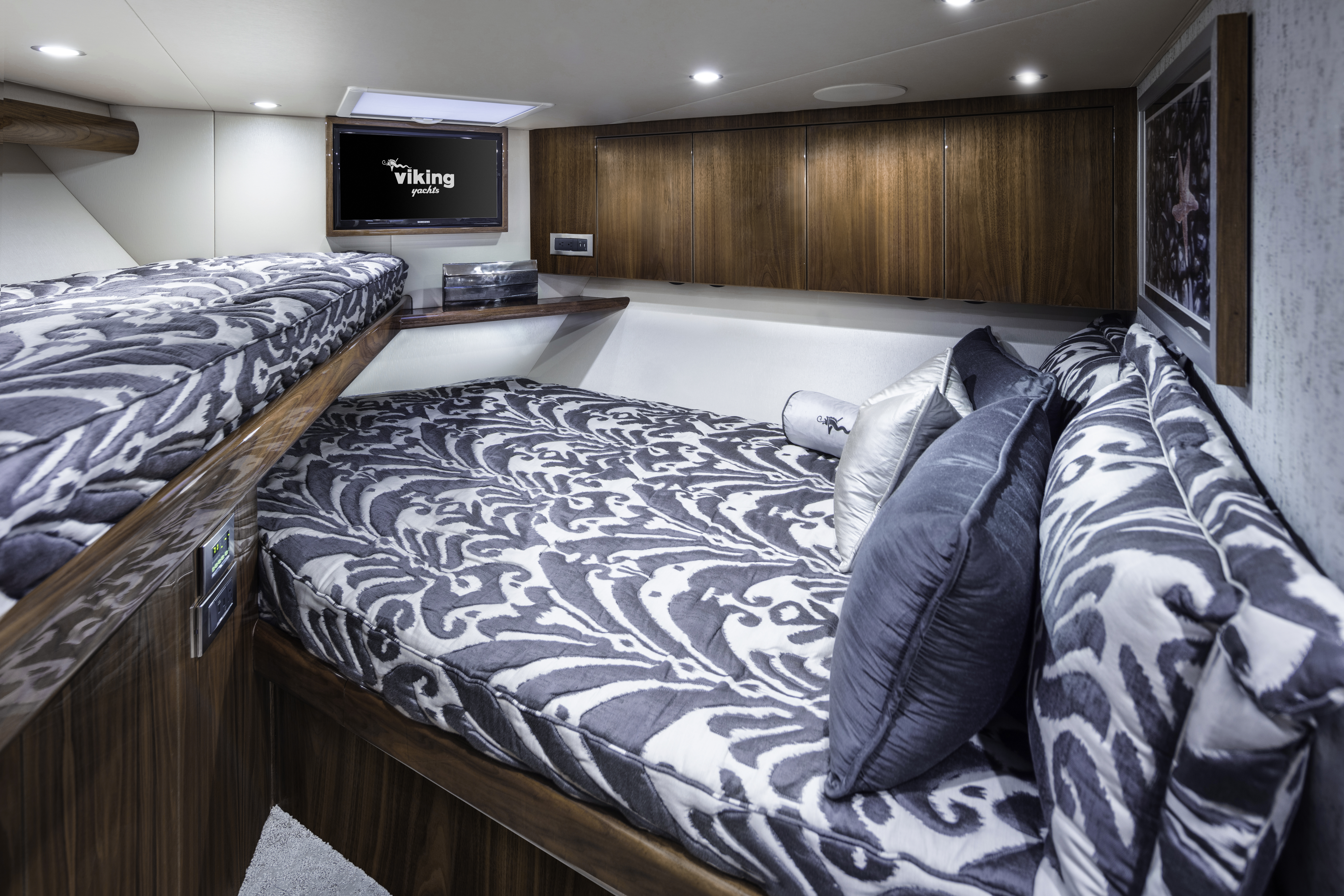 The Viking 58 Convertible stands out as a top contender in its class, with a cockpit that offers unmatched fishability features, ample storage options, and comfortable seating. Take a step up to the elegantly designed flybridge and indulge in luxurious seating and top-notch electronics. Inside, the salon beckons you with its three distinct living areas and a well-equipped galley. The three stateroom accommodations are both opulent and versatile, complete with air conditioning, ample storage, and modern conveniences.