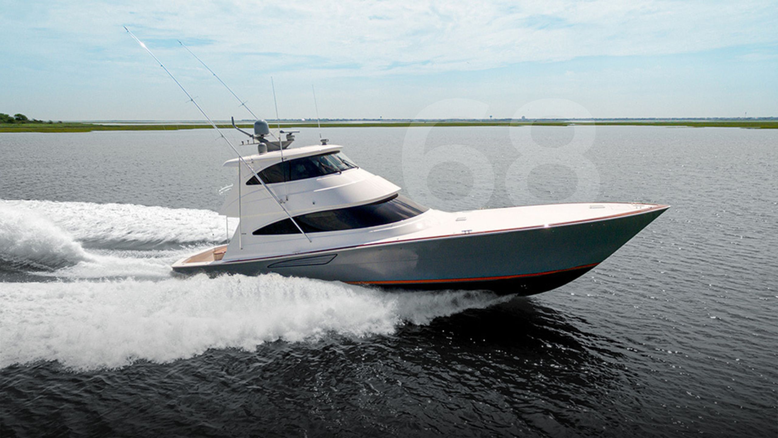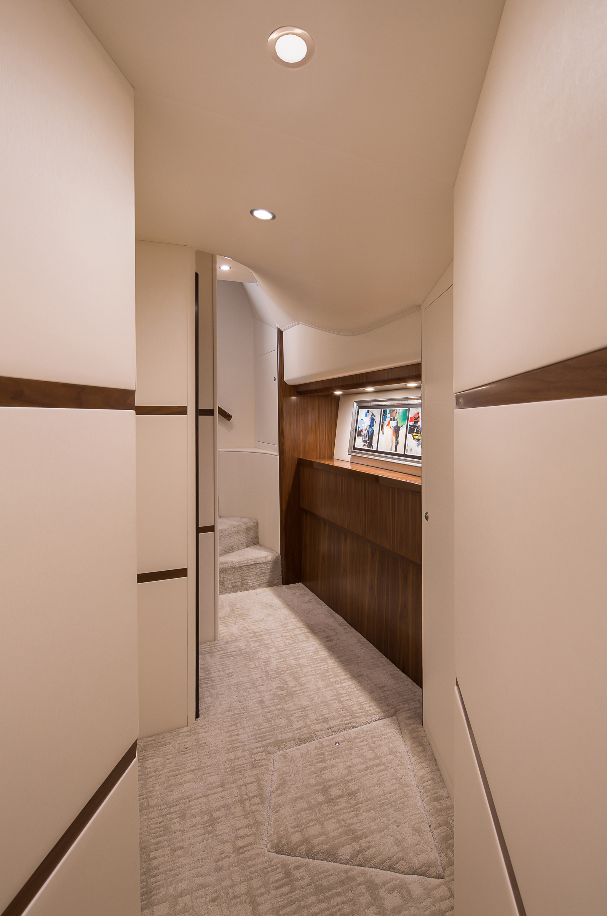 The open and enclosed bridge models of the 68 Viking share the same salon, island galley and four-stateroom layout, but this model also has a custom polished stainless steel spiral staircase that joins the main deck salon and enclosed bridge. A high-gloss walnut finish decorates the entire interior, and large hull-side windows draw in natural light.