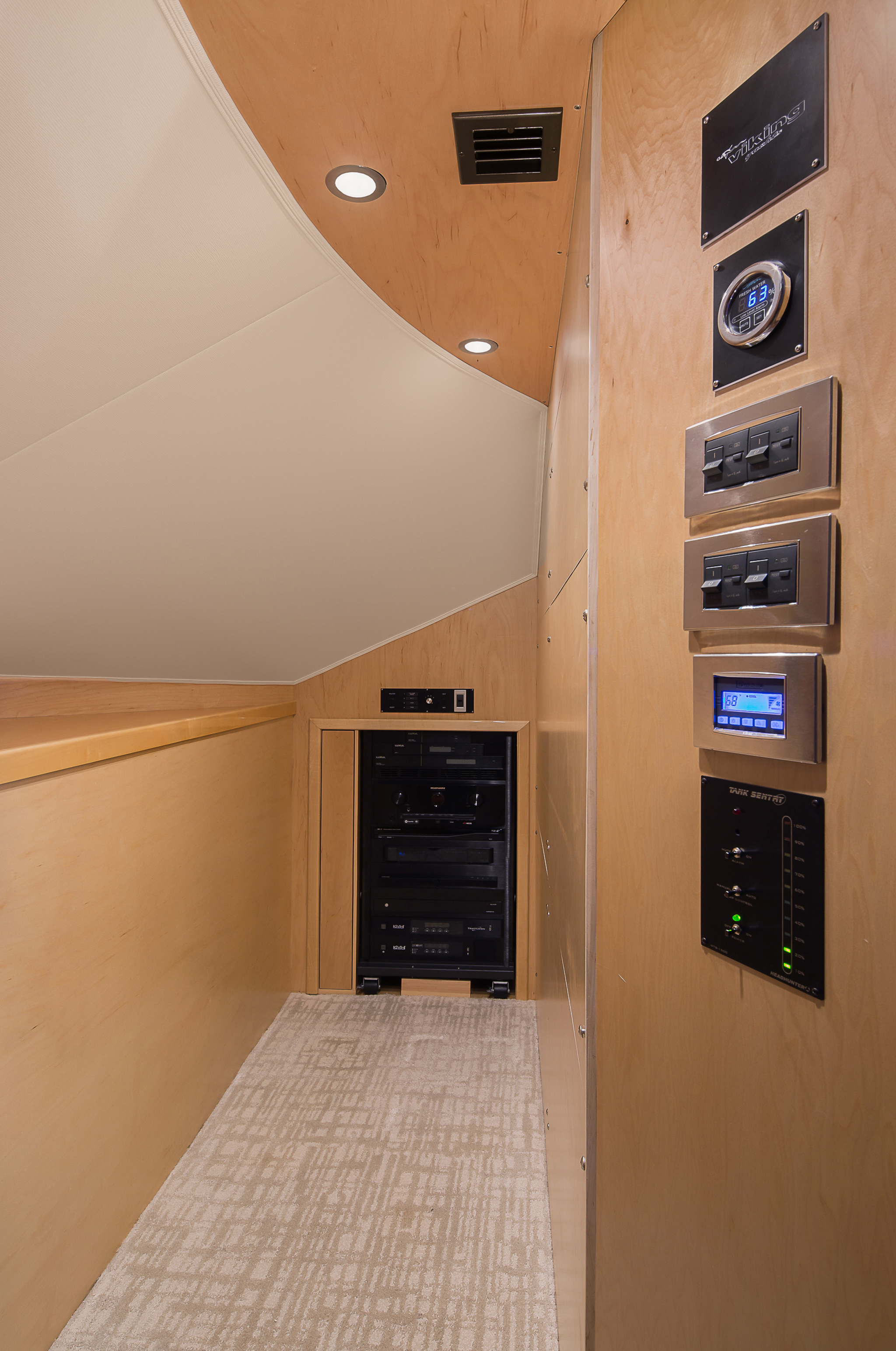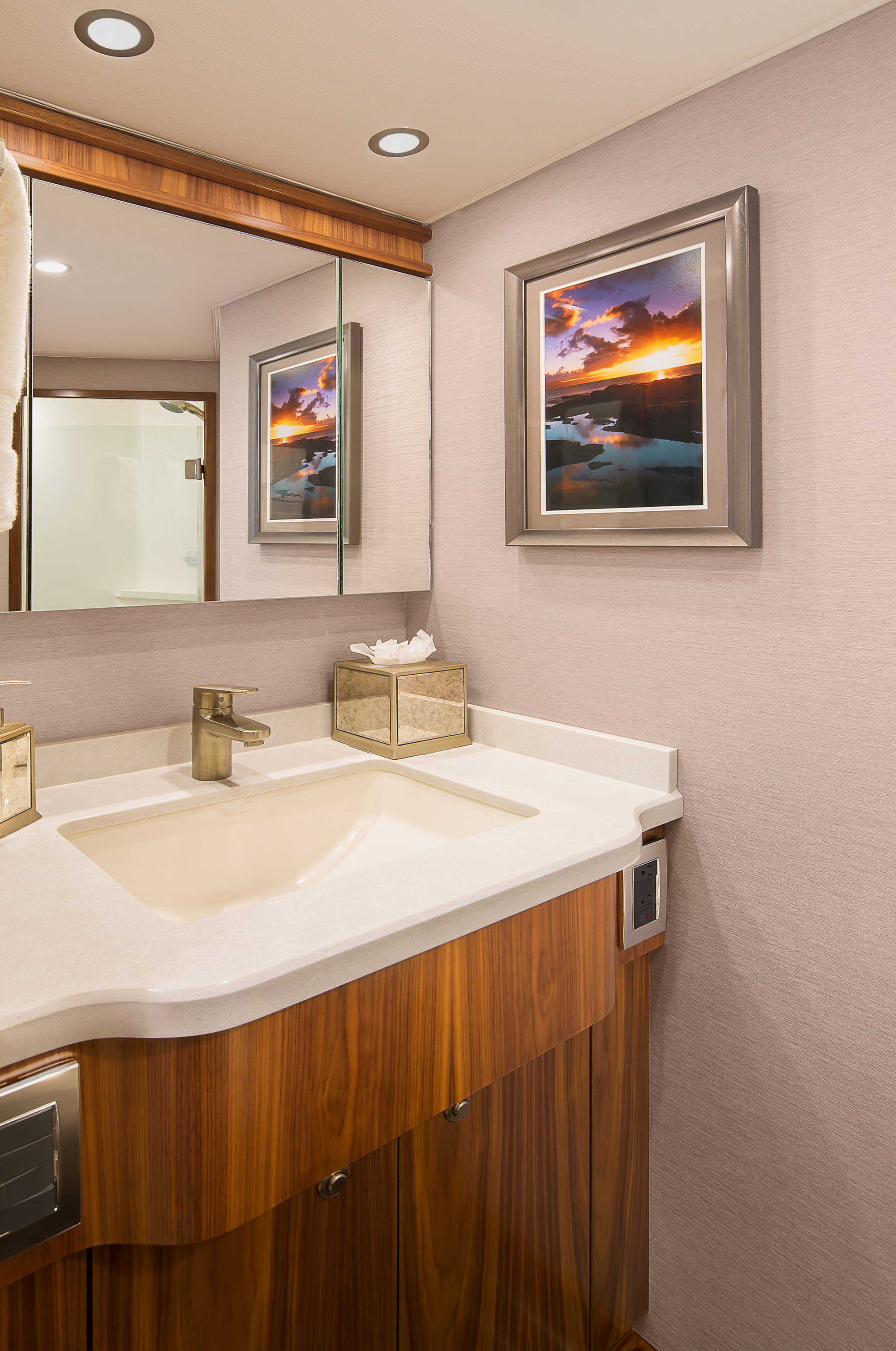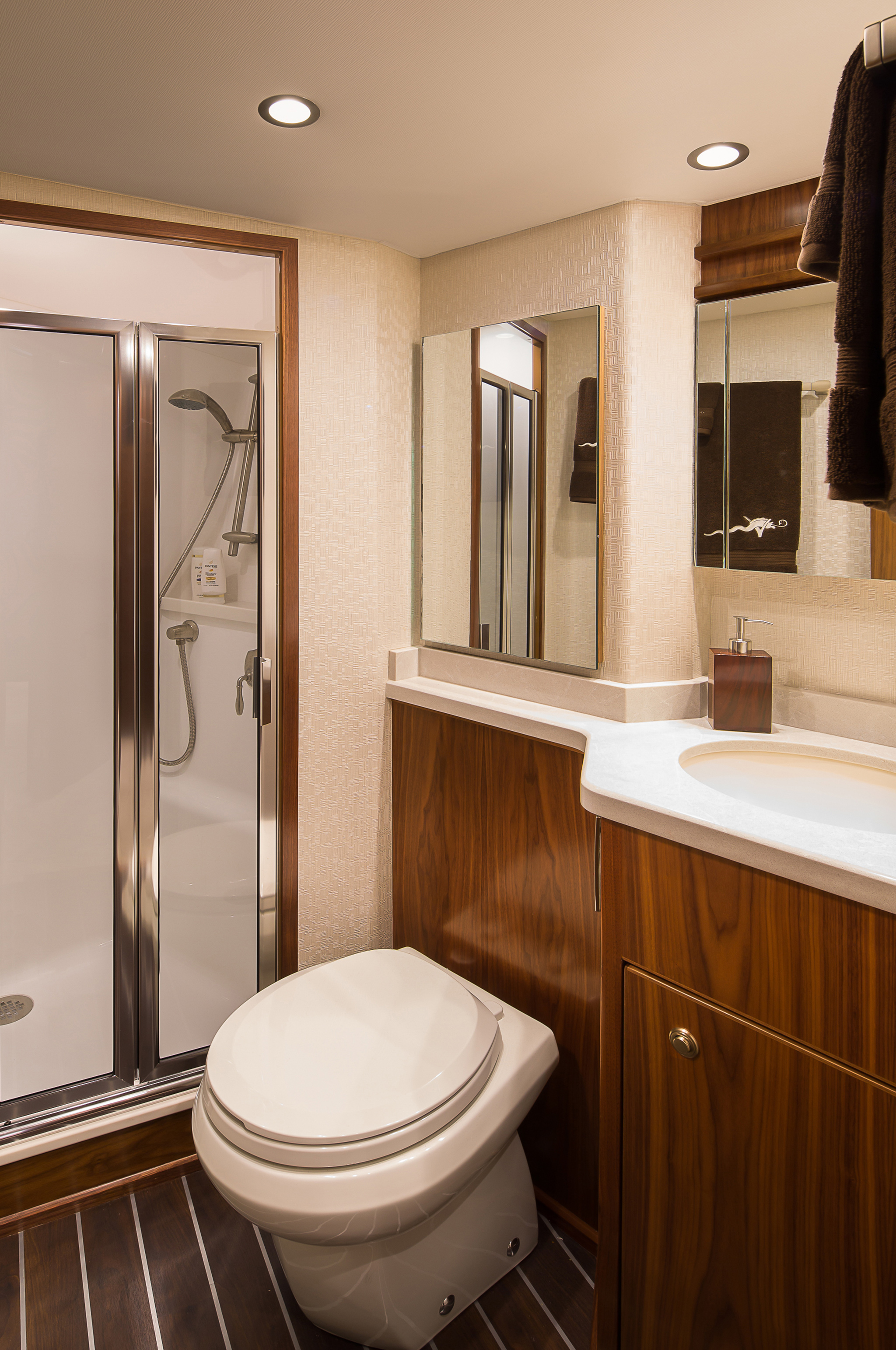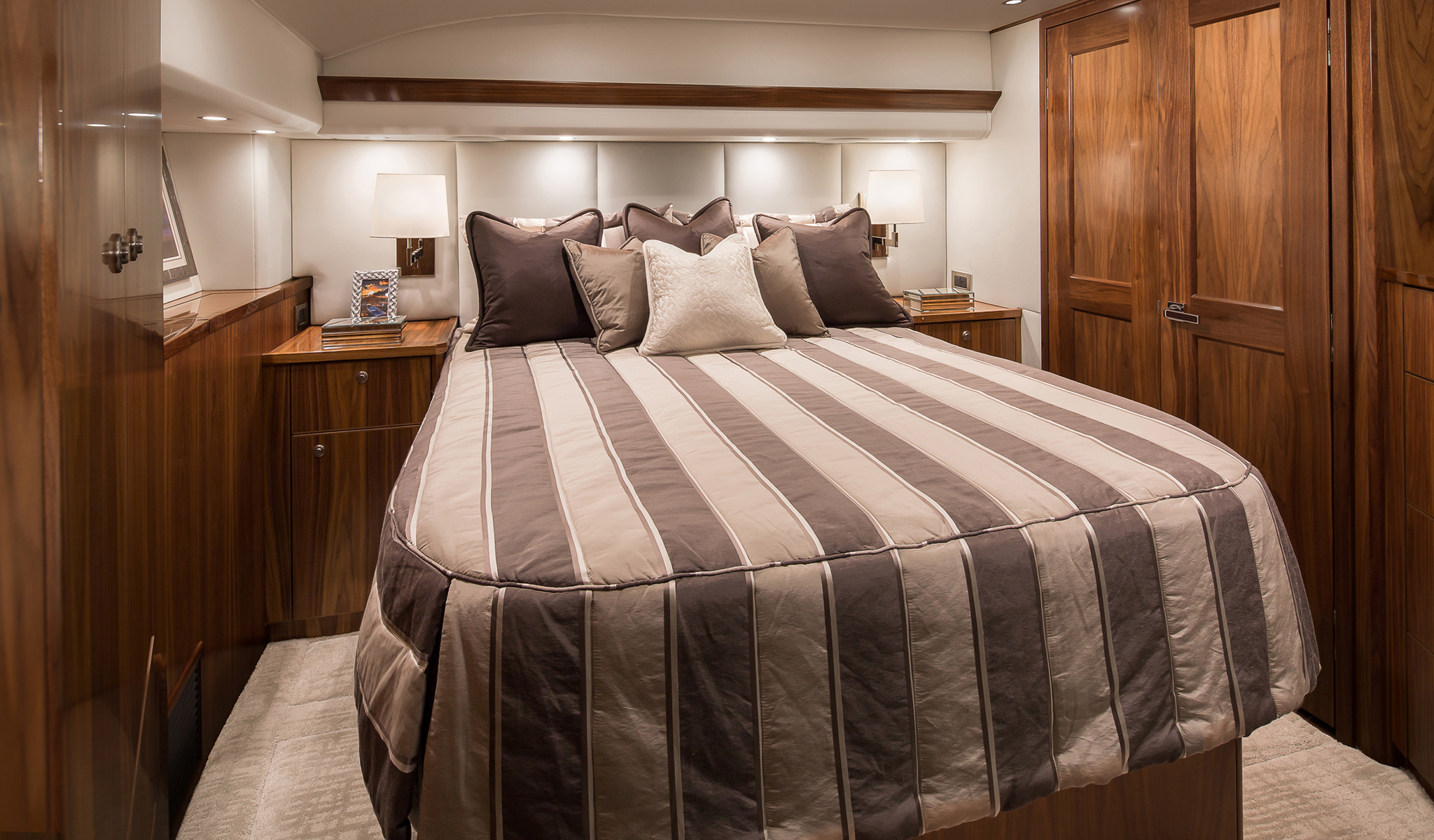 The raised helm console, which mimics the shape of the windshield, holds the electronics components and engine controls. Its black Ultraleather surfaces and visor reduce glare. The boat is equipped with electronic power steering for precise response and control. The enclosed bridge also serves as a private retreat with a lounge, refrigerator, cocktail table, and entertainment center. The combination of walnut hardwoods, cabinetry, and natural light creates a warm and open space.