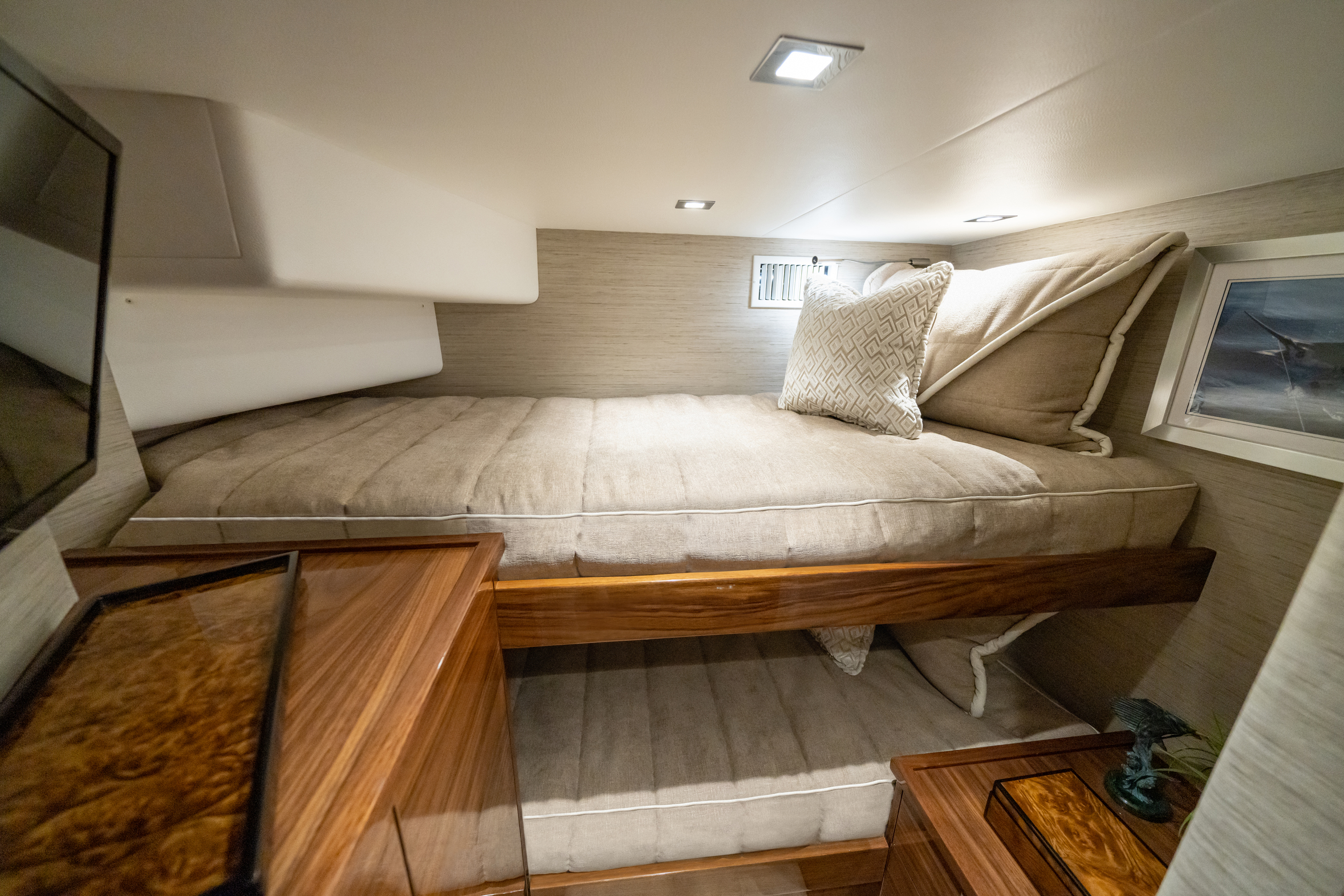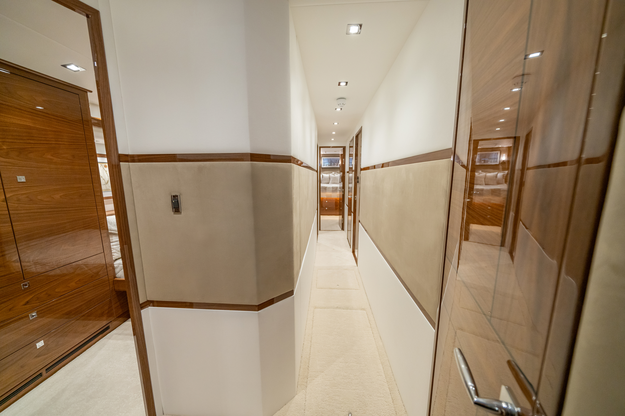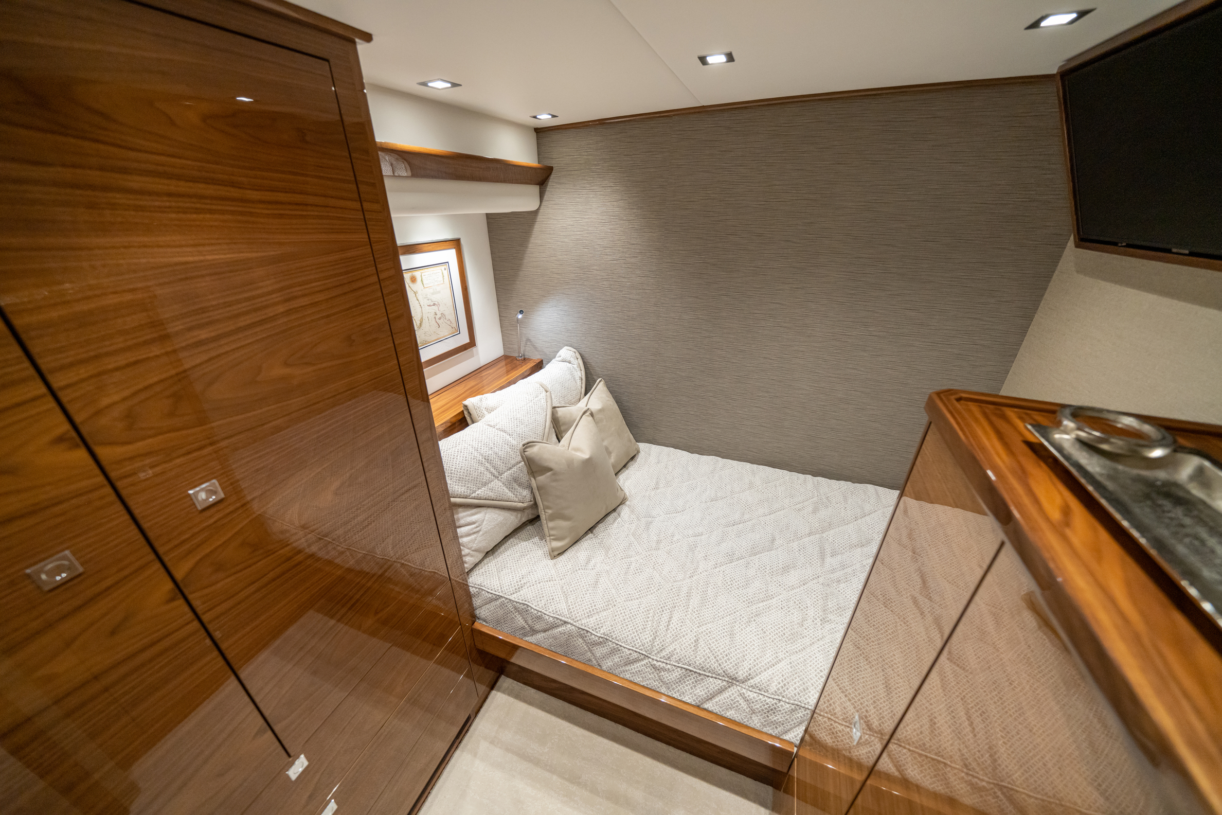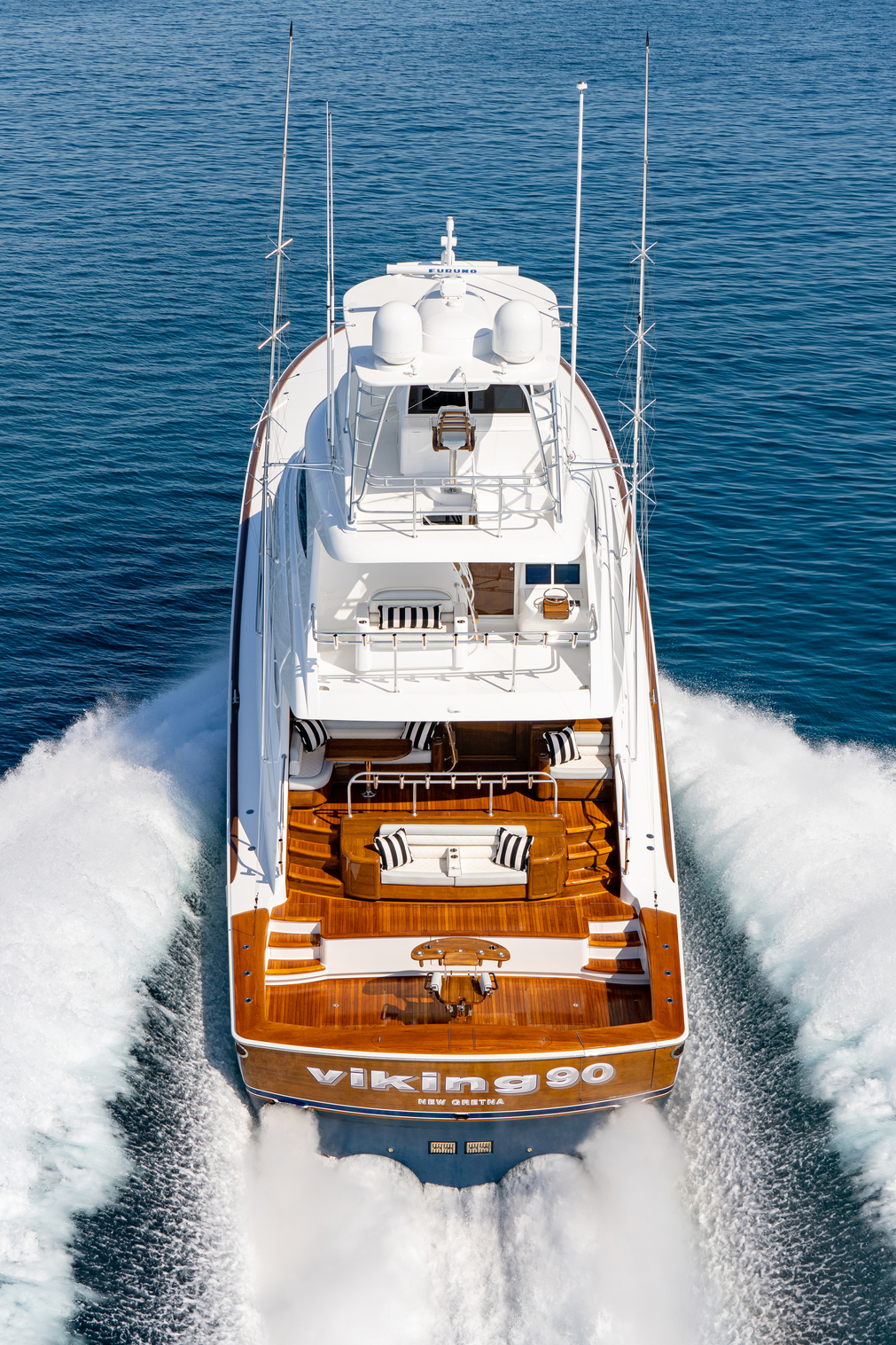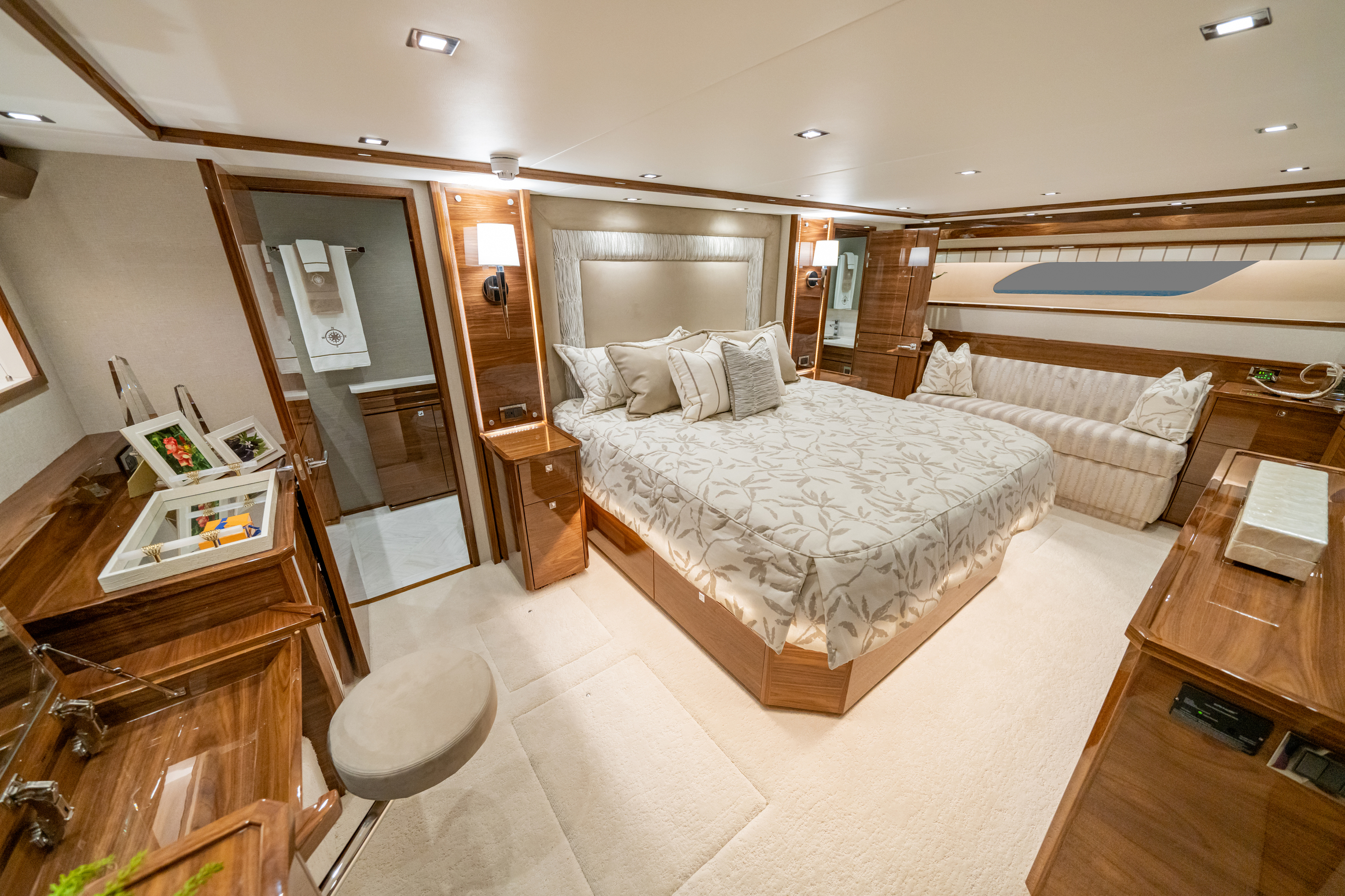 The Viking 90 offers luxurious accommodations with a spacious interior and open layout. The salon features a warm and stylish natural walnut interior, with a lounge designed for relaxation. The yacht also includes a starboard-side entertainment center with a 65-inch HD TV, a large wraparound galley, and a raised U-shaped dinette. Below deck you can find five guest staterooms, crew quarters, a pantry, and an owner’s suite with a king bed, walk-in closet, and lounge area.