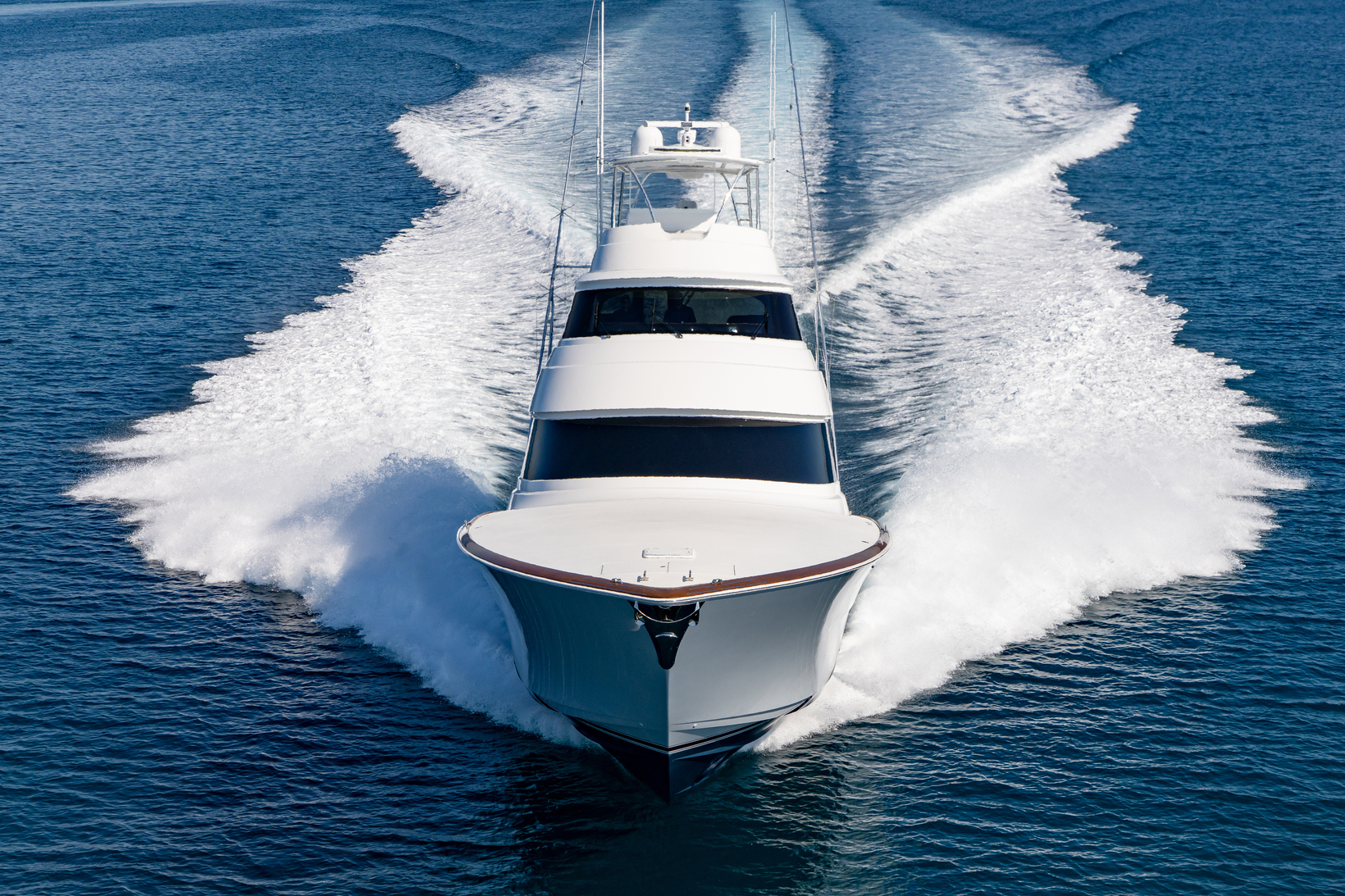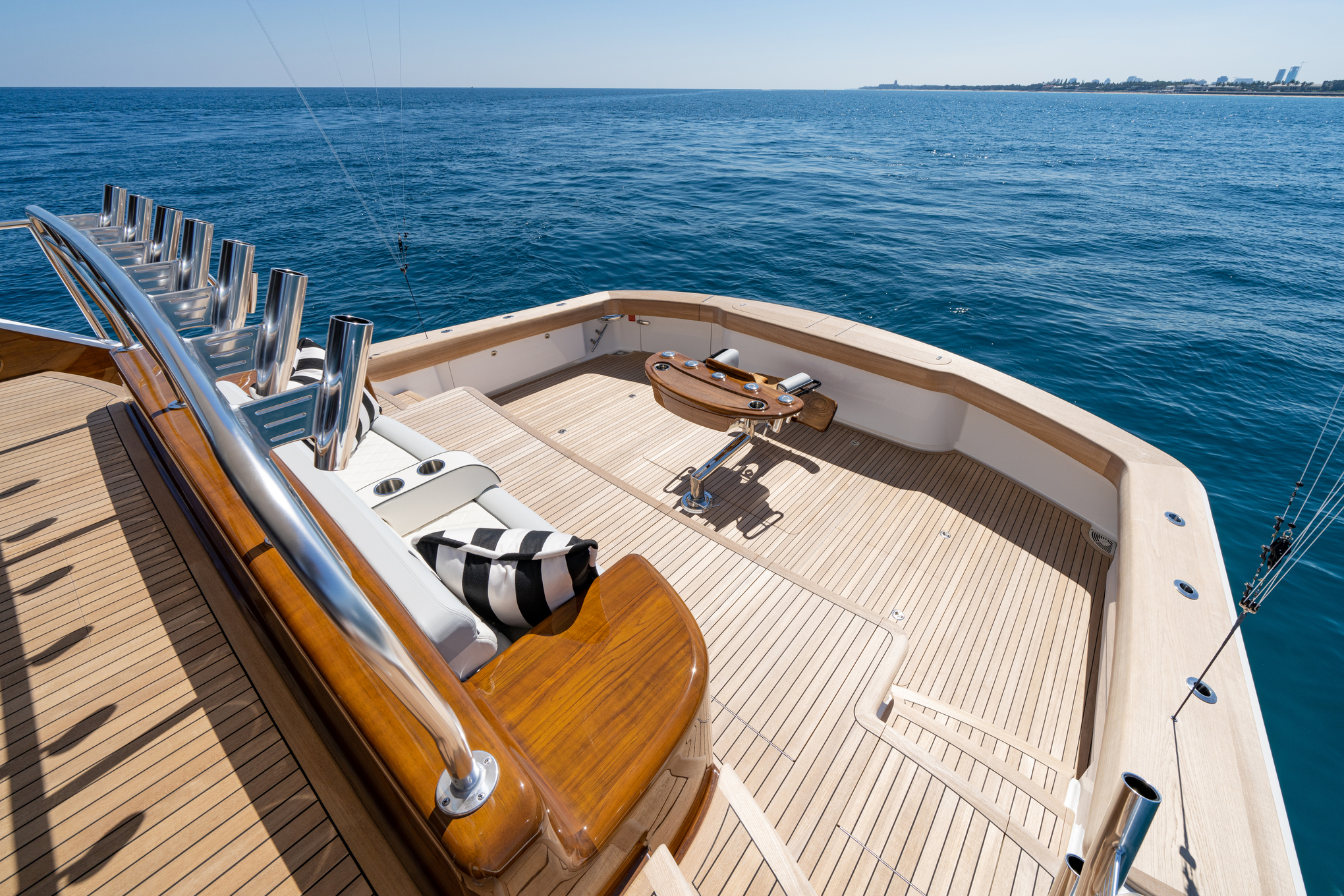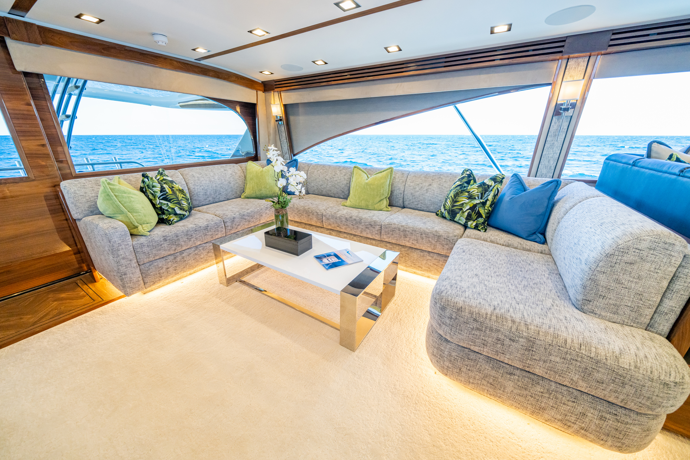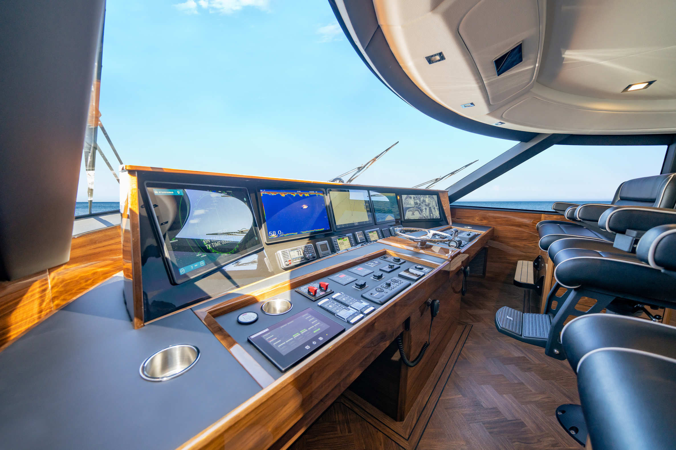 The Viking 90 offers luxurious accommodations with a spacious interior and open layout. The salon features a warm and stylish natural walnut interior, with a lounge designed for relaxation. The yacht also includes a starboard-side entertainment center with a 65-inch HD TV, a large wraparound galley, and a raised U-shaped dinette. Below deck you can find five guest staterooms, crew quarters, a pantry, and an owner’s suite with a king bed, walk-in closet, and lounge area.