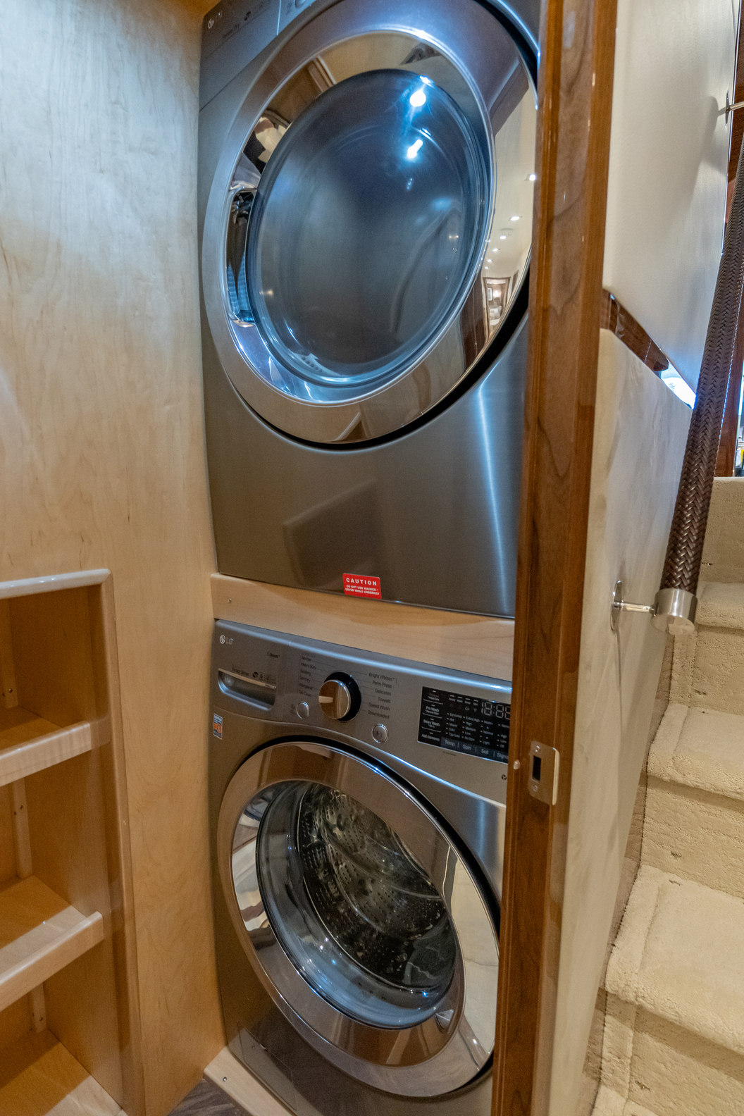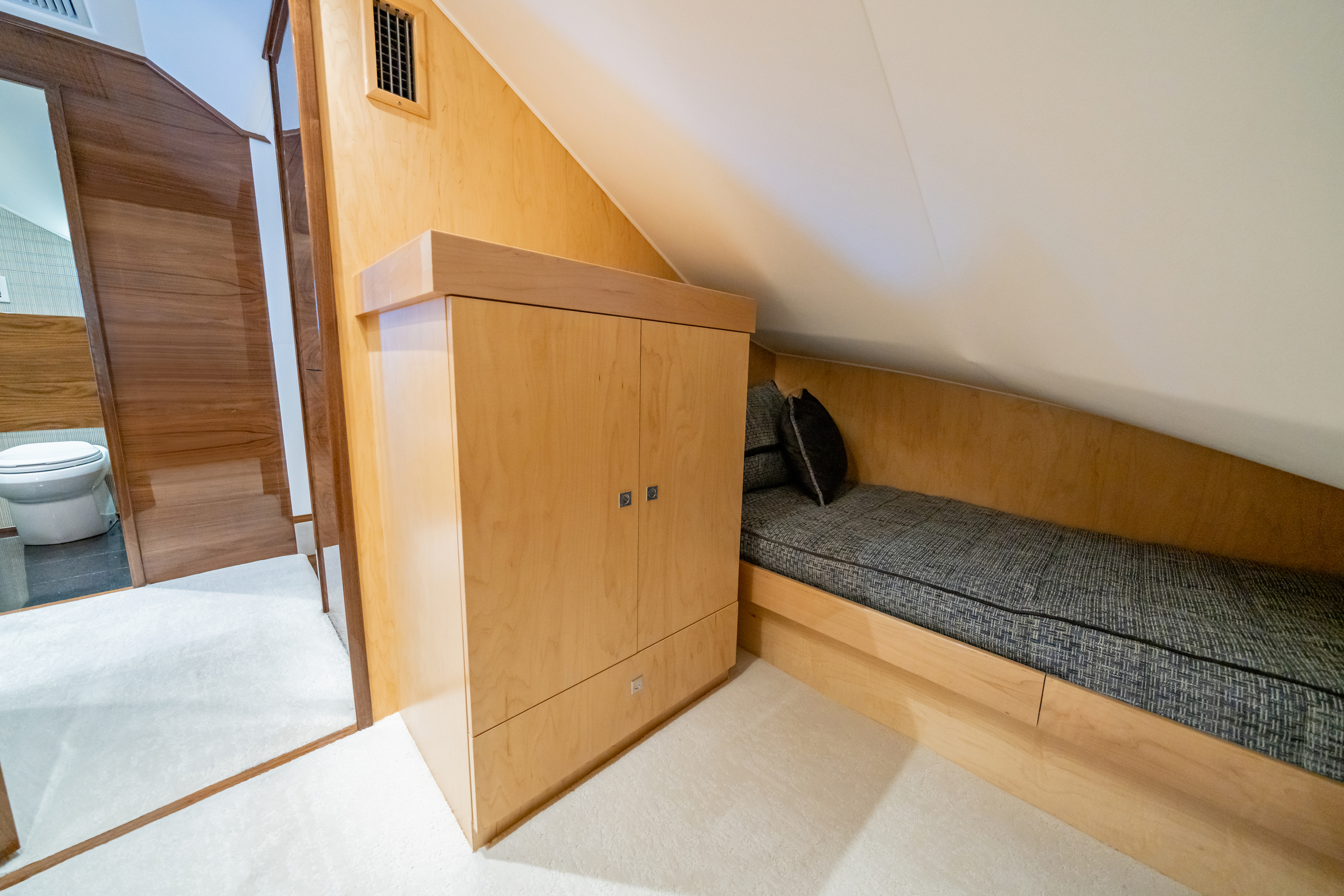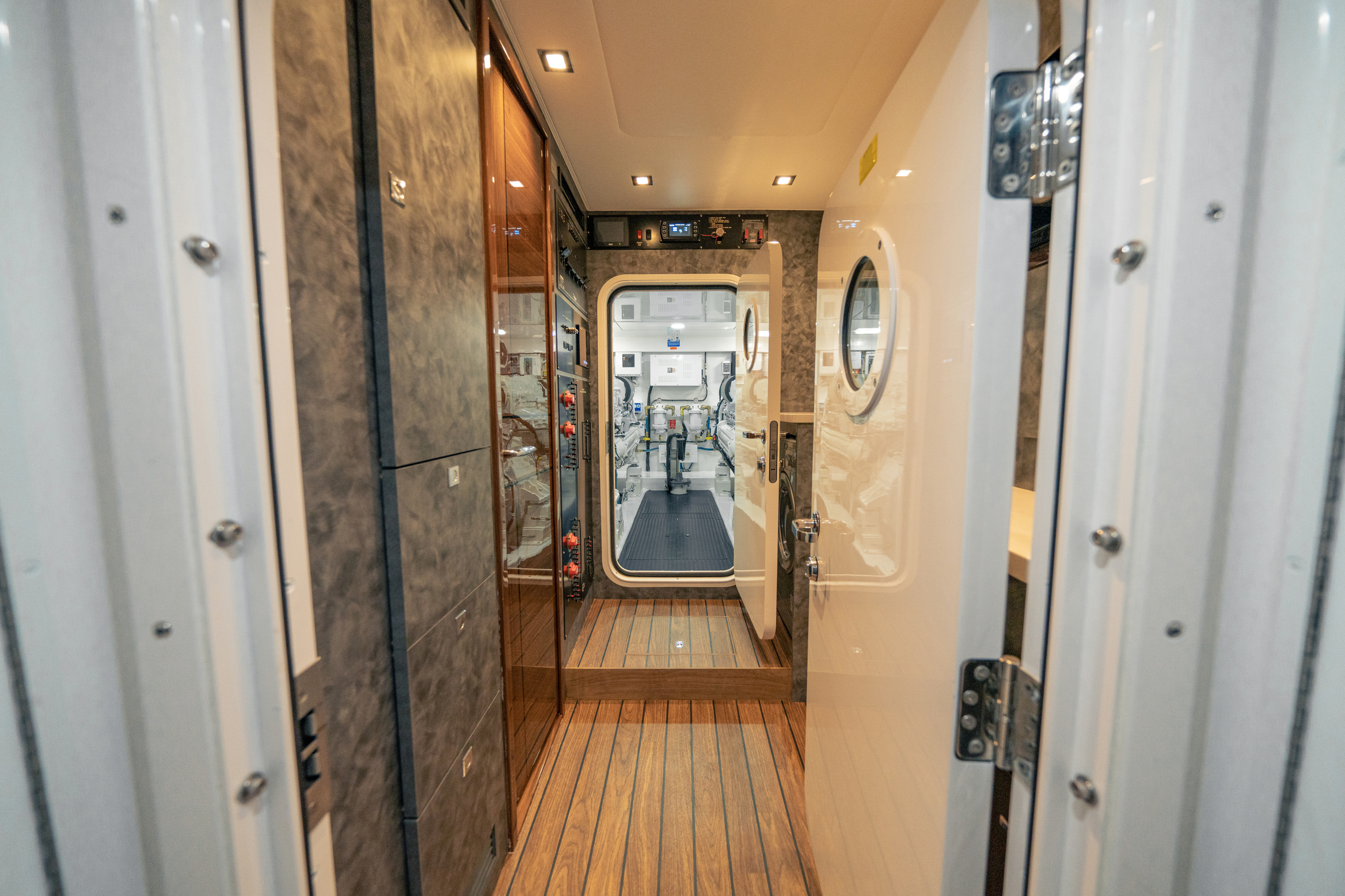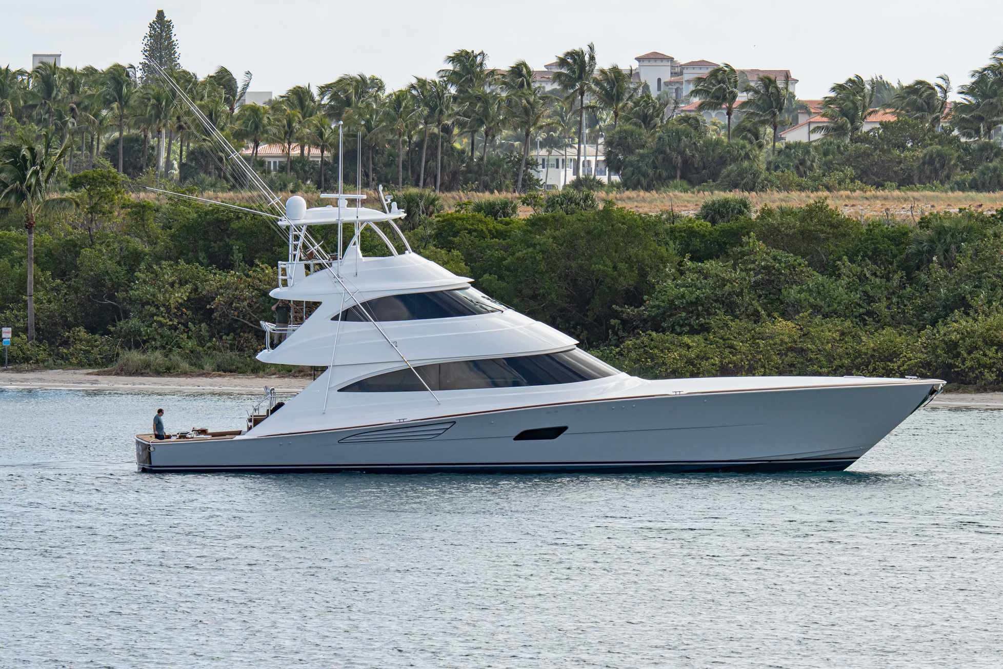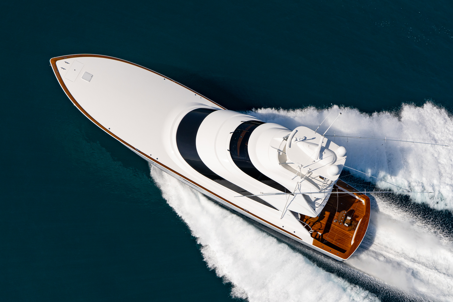 The Viking 90 offers luxurious accommodations with a spacious interior and open layout. The salon features a warm and stylish natural walnut interior, with a lounge designed for relaxation. The yacht also includes a starboard-side entertainment center with a 65-inch HD TV, a large wraparound galley, and a raised U-shaped dinette. Below deck you can find five guest staterooms, crew quarters, a pantry, and an owner’s suite with a king bed, walk-in closet, and lounge area.