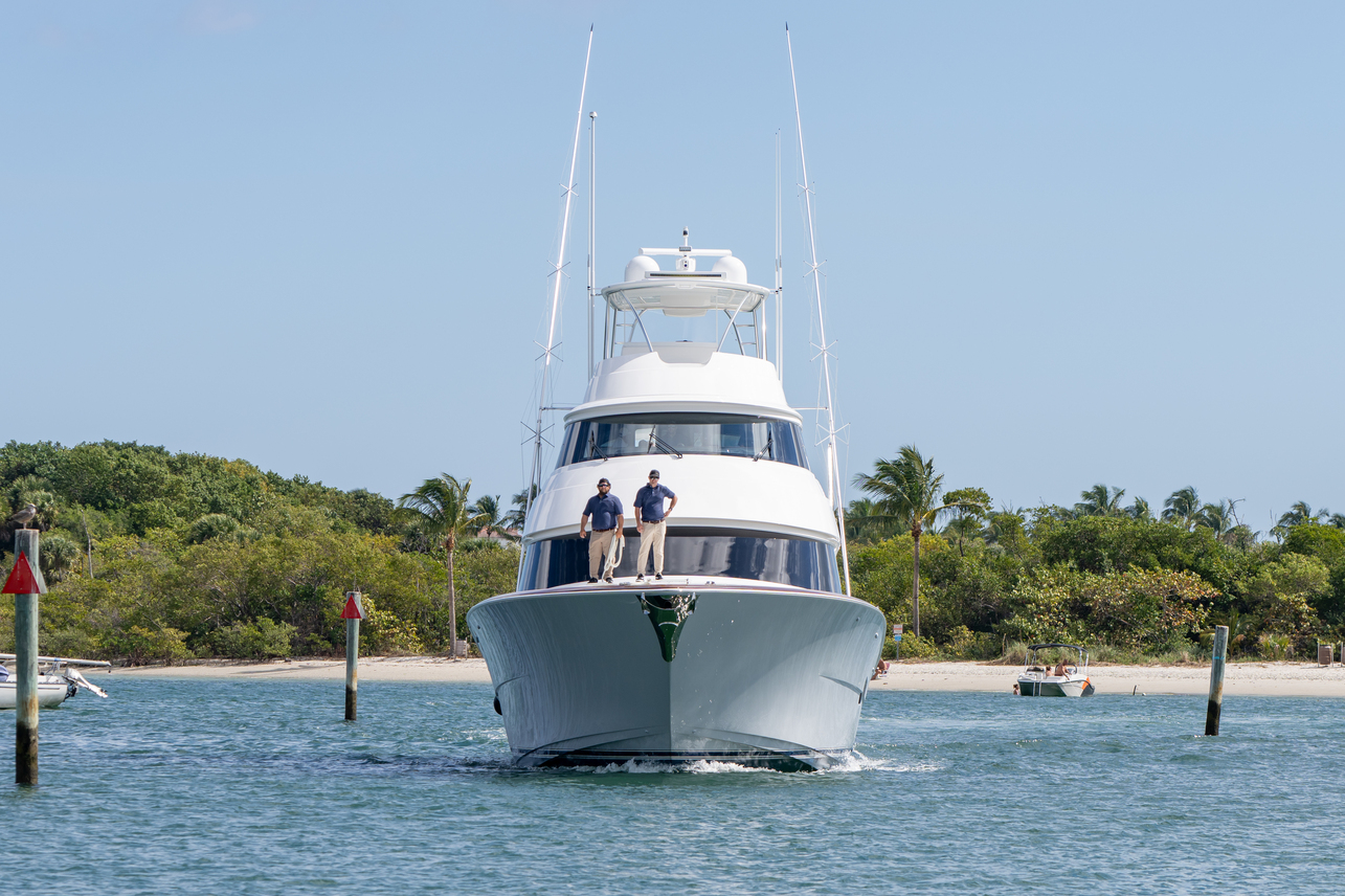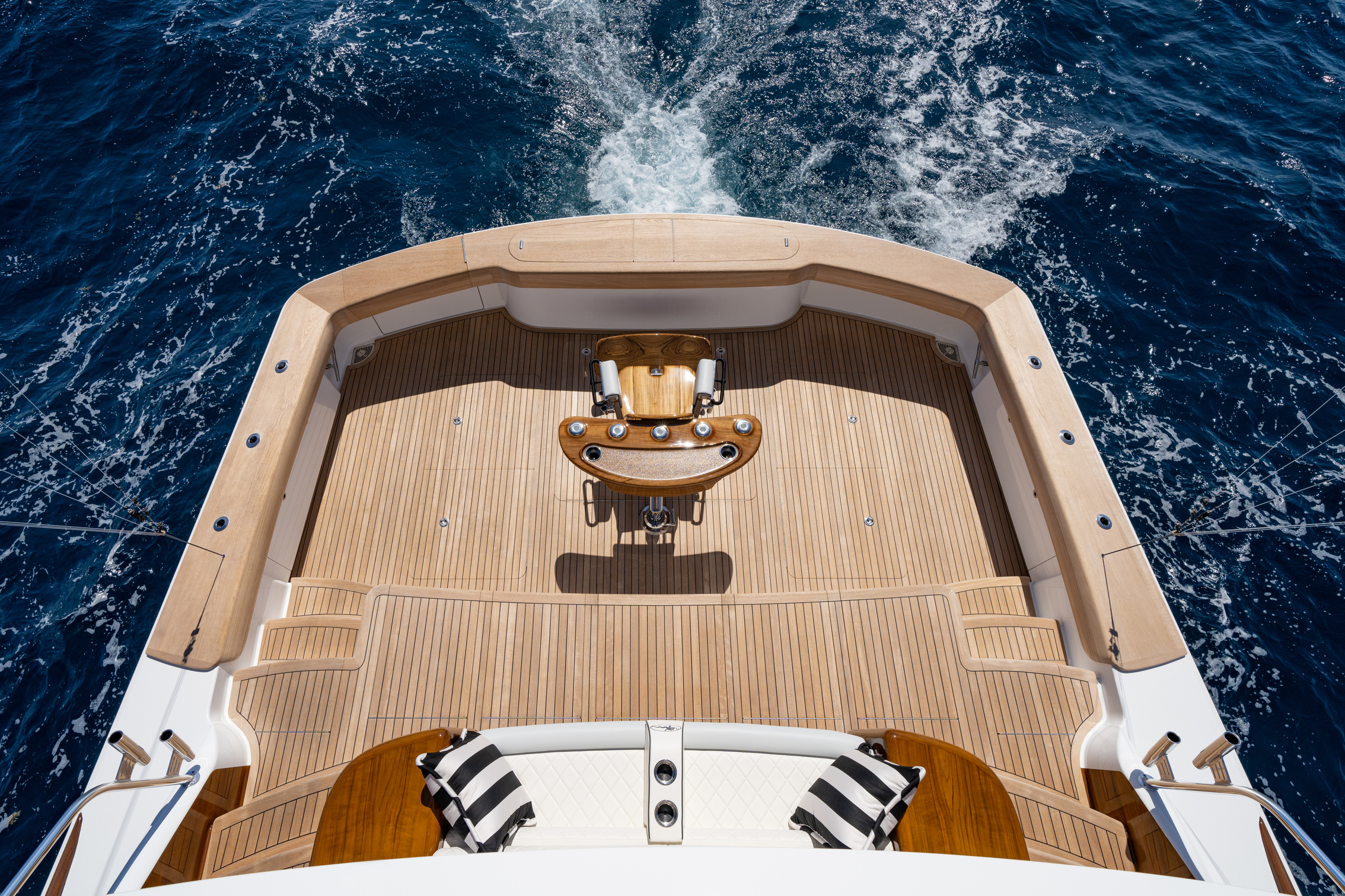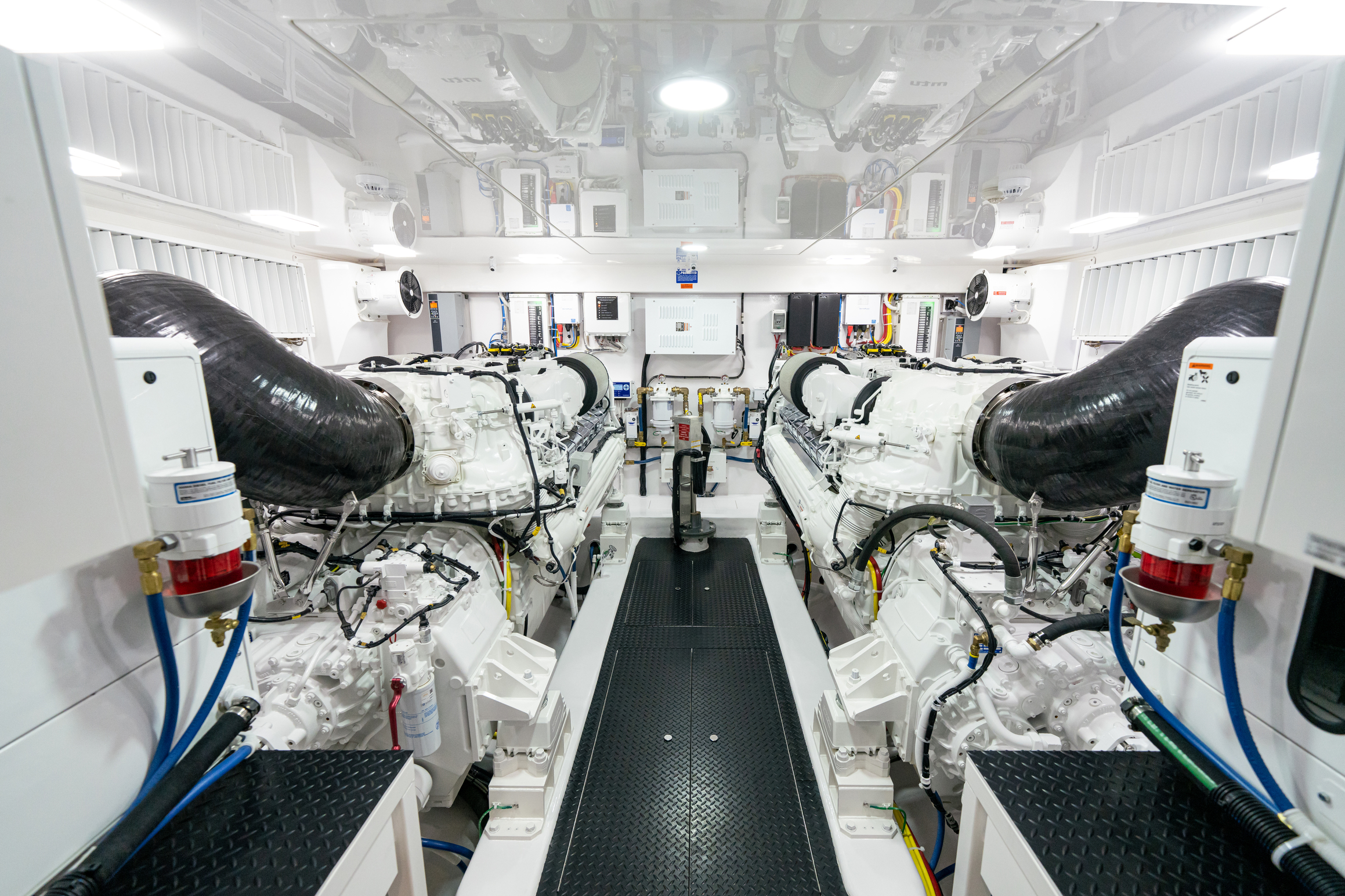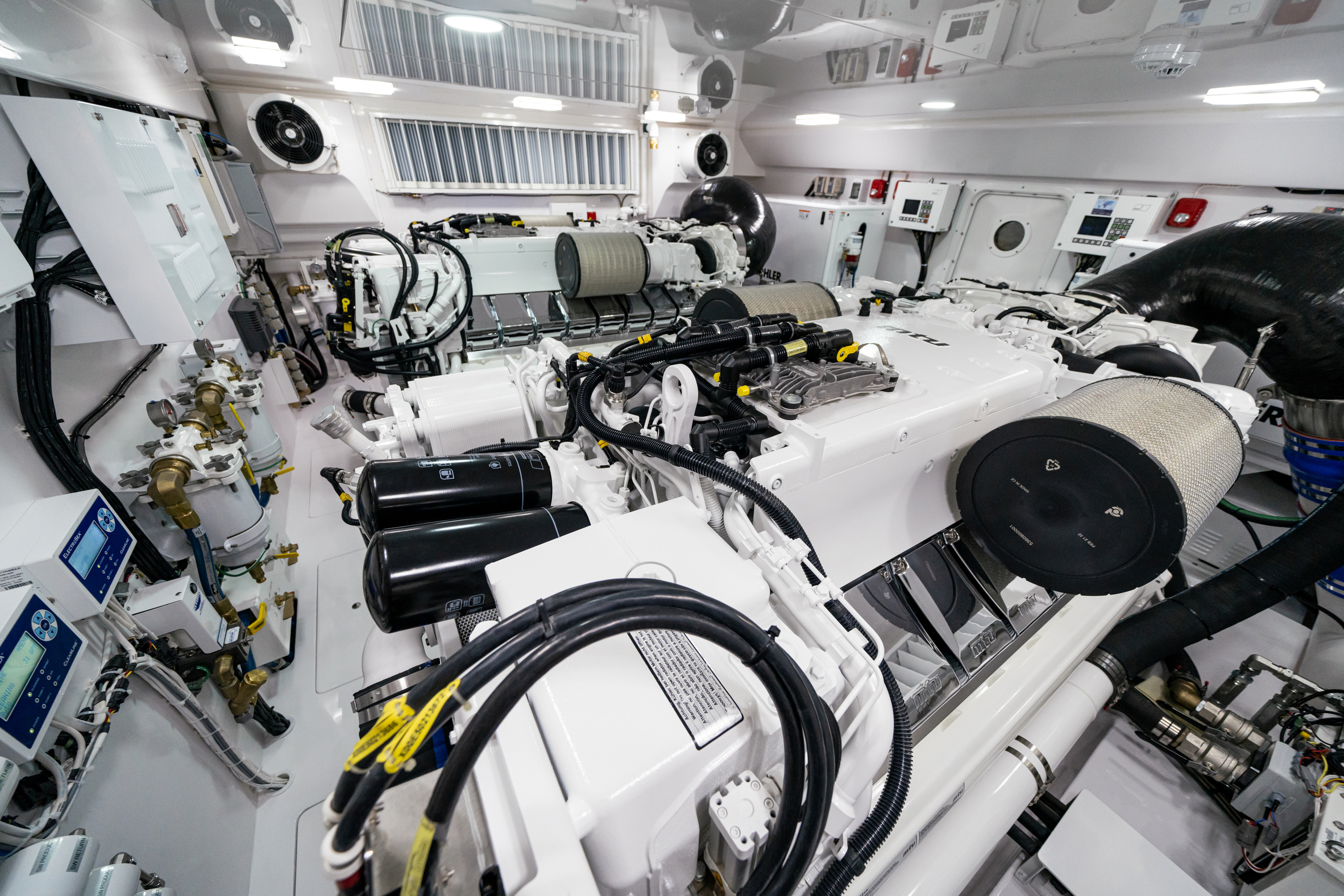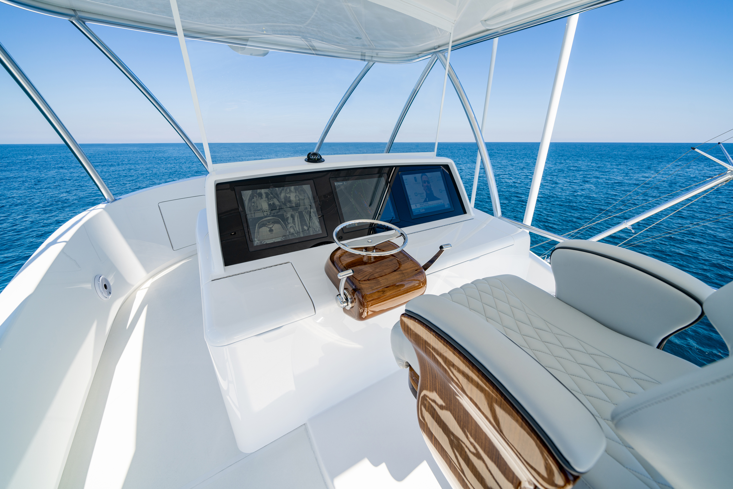 The expansive cockpit spans an impressive 224 square feet and is equipped with a 203-gallon transom fishbox/live well, as well as two full-length 103-gallon insulated in-deck fishboxes. A single powered hatch on the centerline provides access to the Seakeeper 35, utilizing a watertight design that was introduced with the recent Viking 80 demonstrator boats. The cockpit sole is reinforced for a fighting chair, rocket launcher, or table, making it the perfect spot to reel in your next big catch.